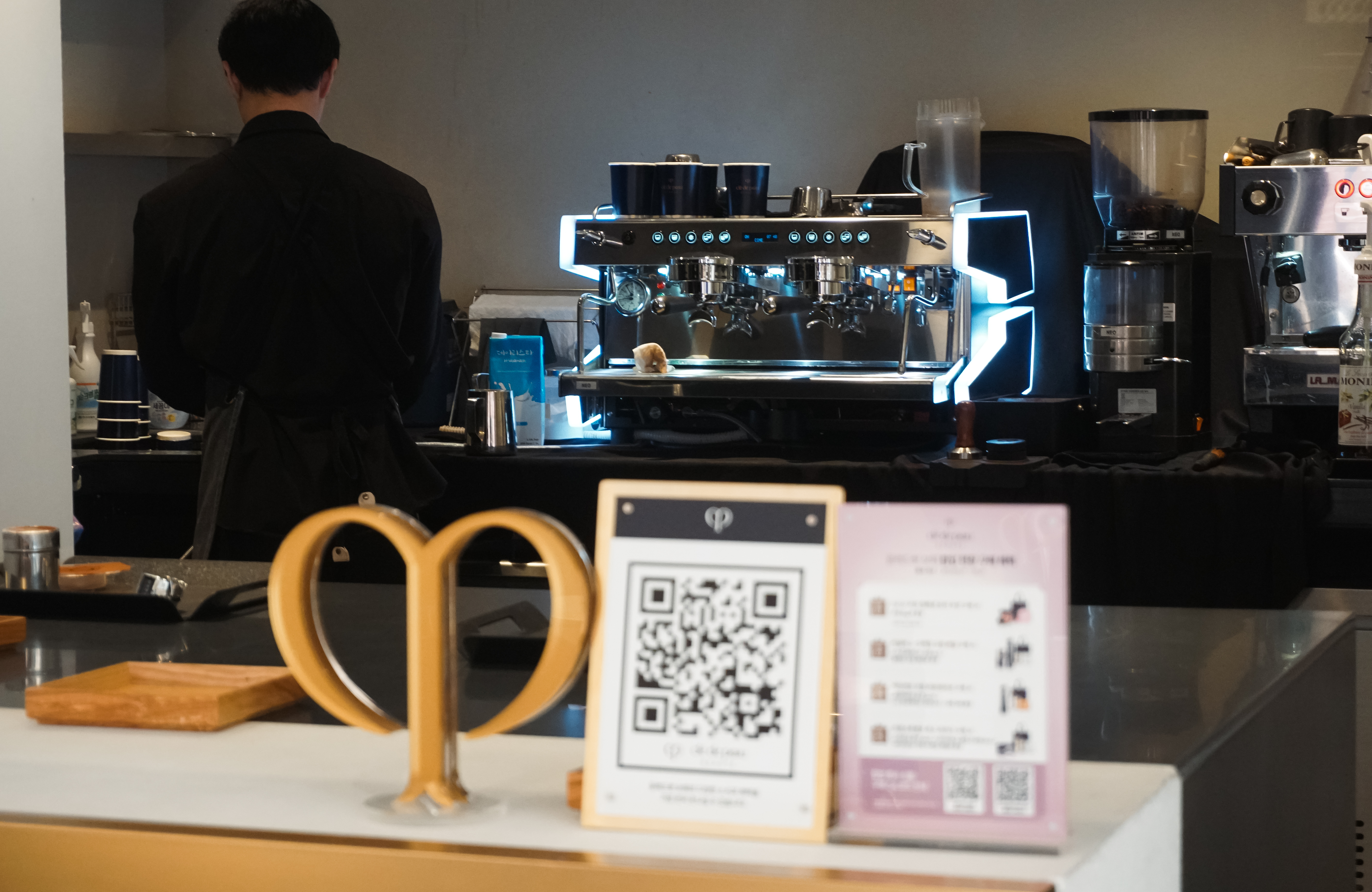 다음에 보실 장소는 꼴라보하우스 도산에서 열린 팝업행사에서 본 기업로고를 이용한 라떼아트였습니다. 이곳에서는 끌레드뽀(Clé de Peau) 라는 스킨케어 브랜드의 독특한 로고를 활용한 라떼아트를 볼 수 있었는데, 확실히 행사장의 분위기에 맞게 고급스러운 느낌을 주는 커피머신을 사용해 에스프레소를 내려 커피를 만들어주셨습니다.