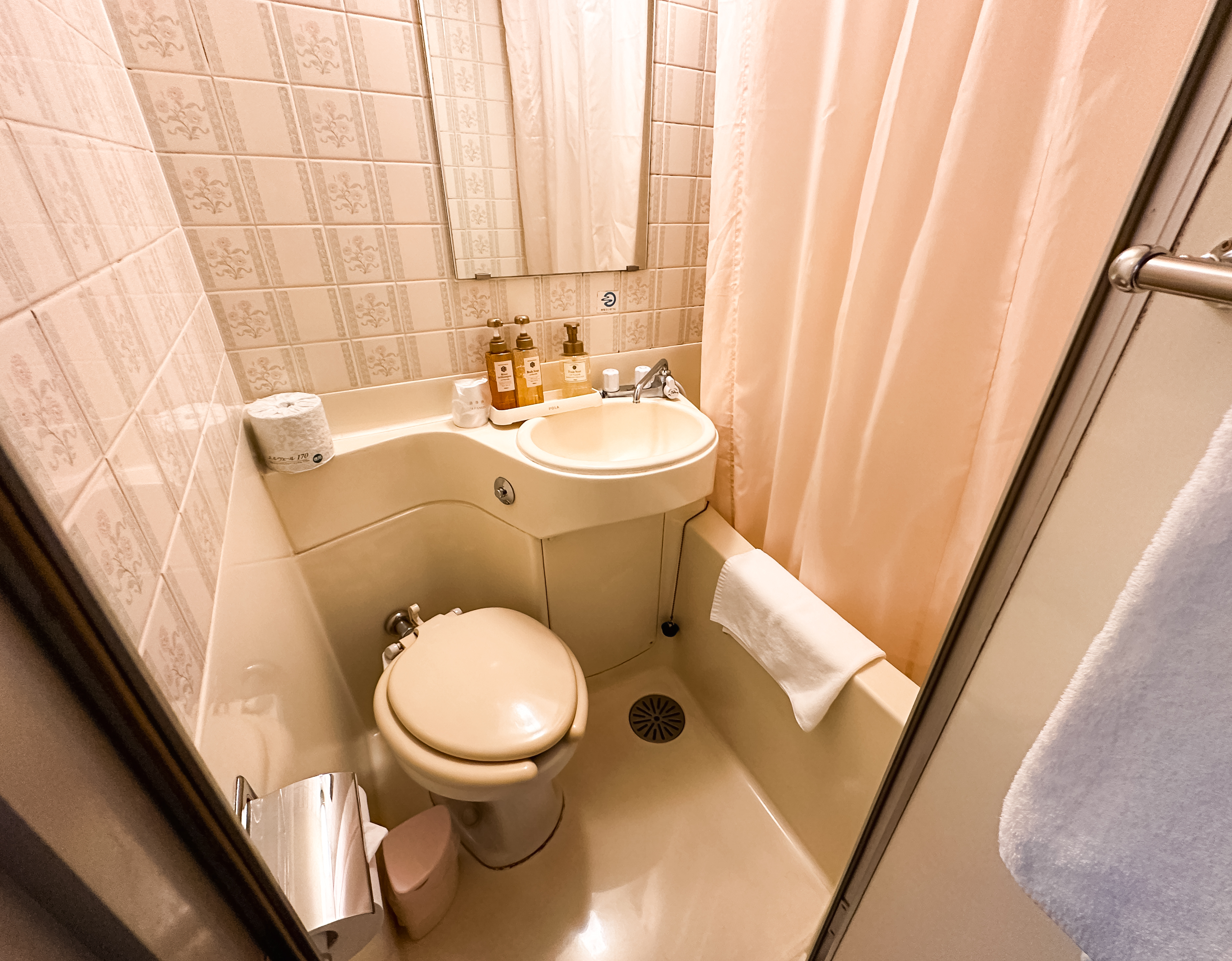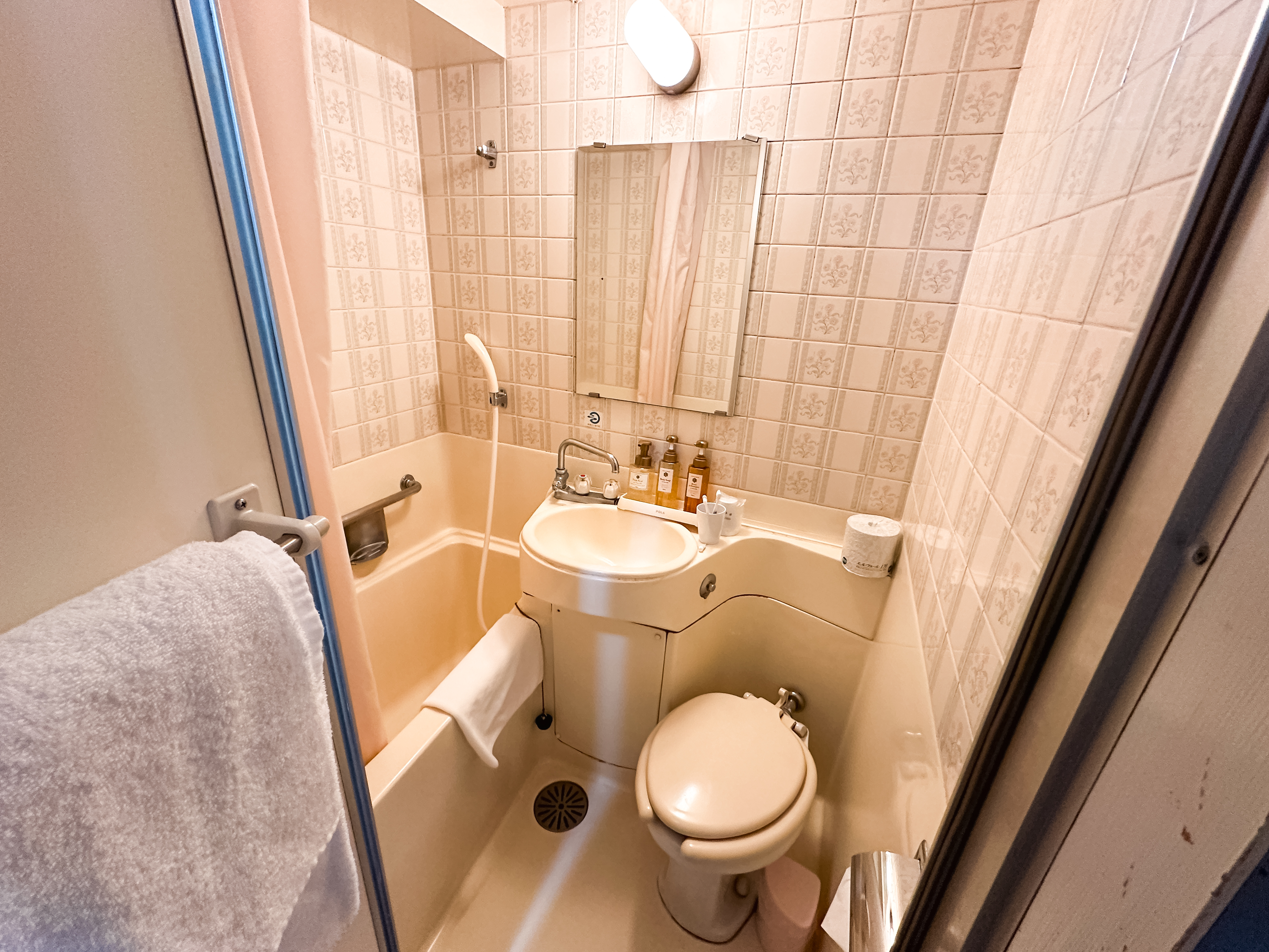 헤이와다이 아라토 호텔의 욕실의 모습은 이렇습니다. 일단 굉장히 겉보기에 굉장히 아담한 크기였고, 실제로 들어가 보면 마치 캠핑카의 화장실을 이용하는 느낌이 드는 협소한 느낌의 욕실이었습니다. 욕조도 좁고 깊은 느낌이었고, 변기도 볼일을 보면 몸이 세면대에 닿을 정도로 작았습니다. 그래도 전체적인 느낌은 작고 아늑했습니다.