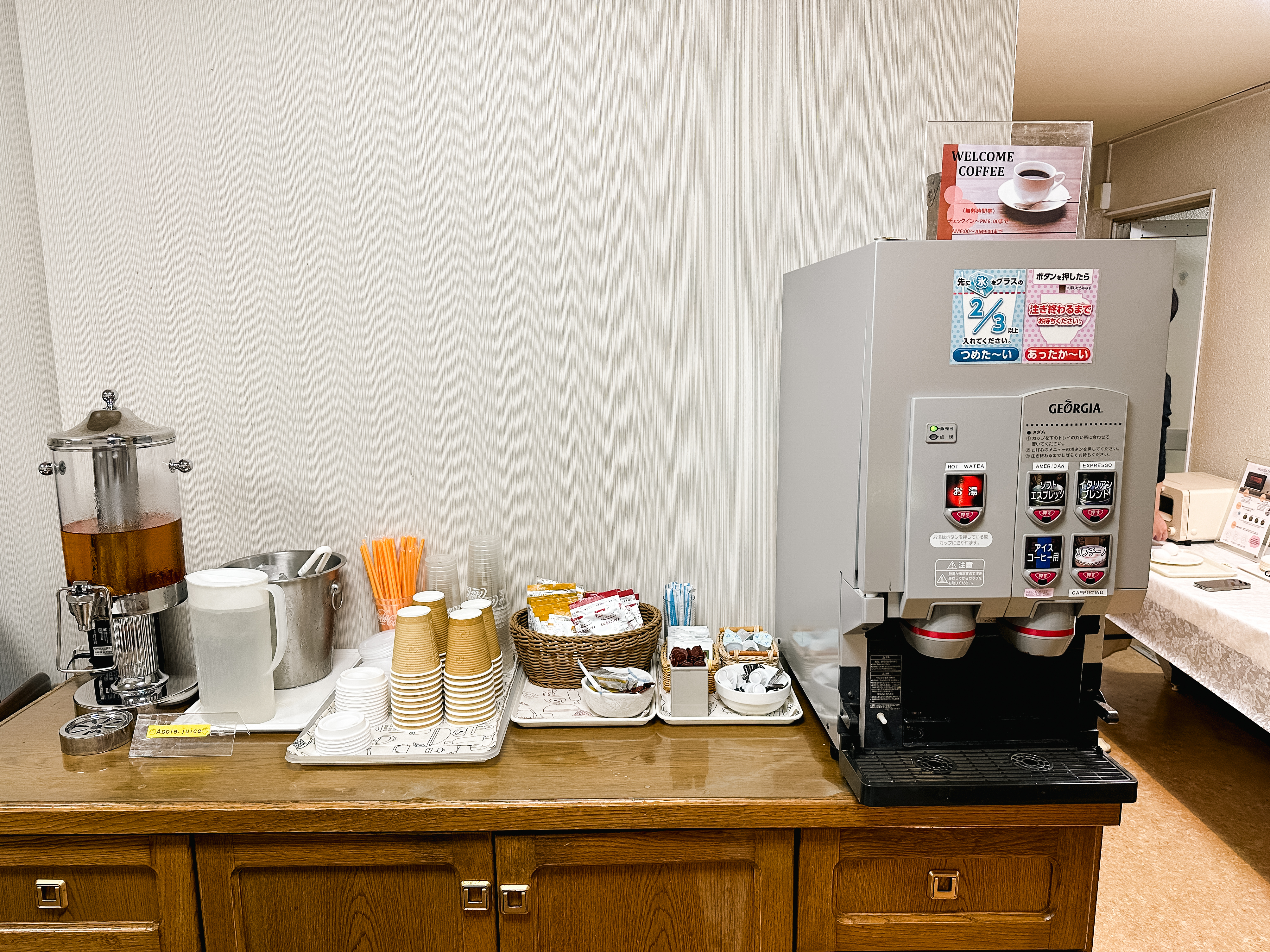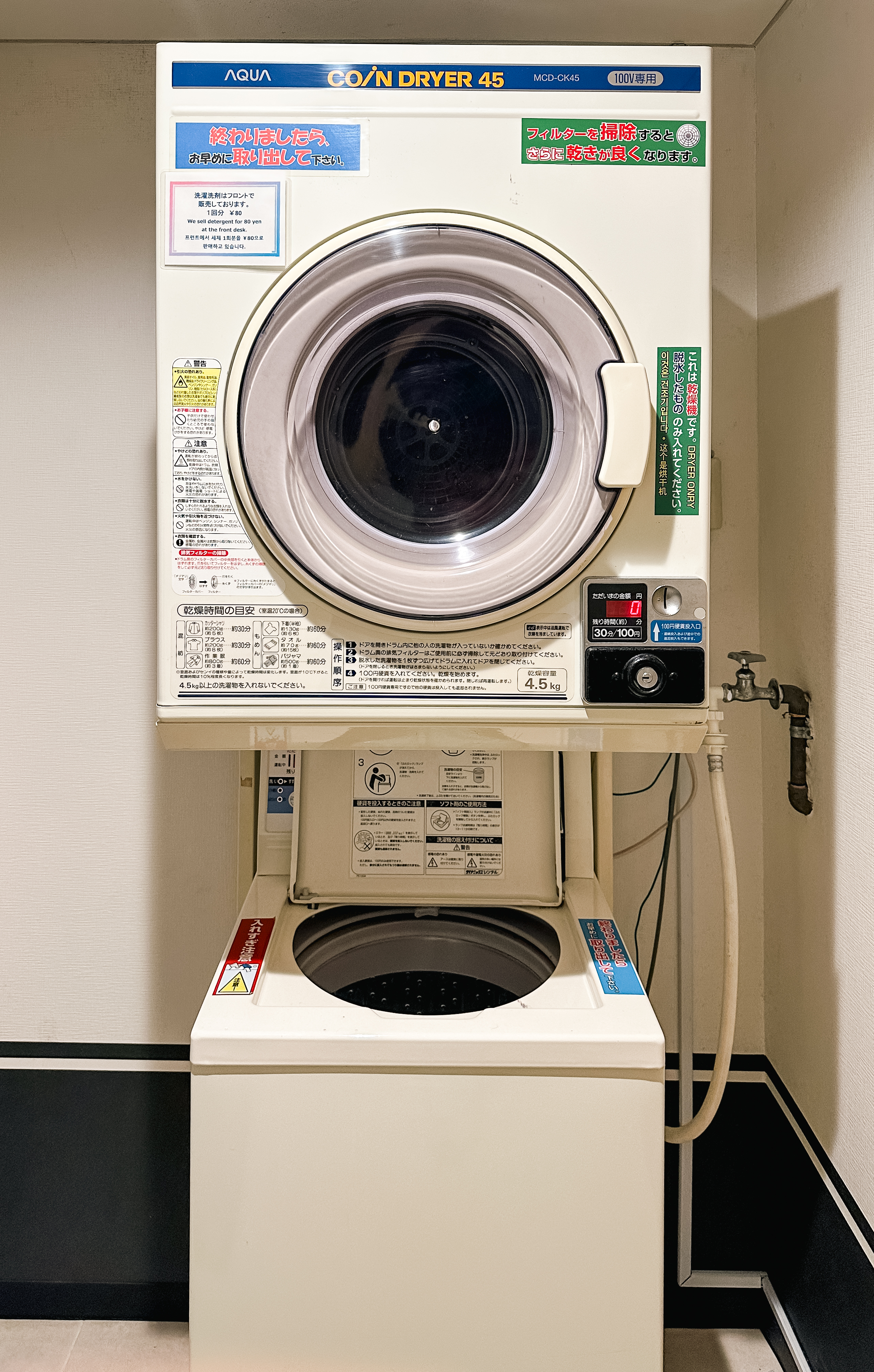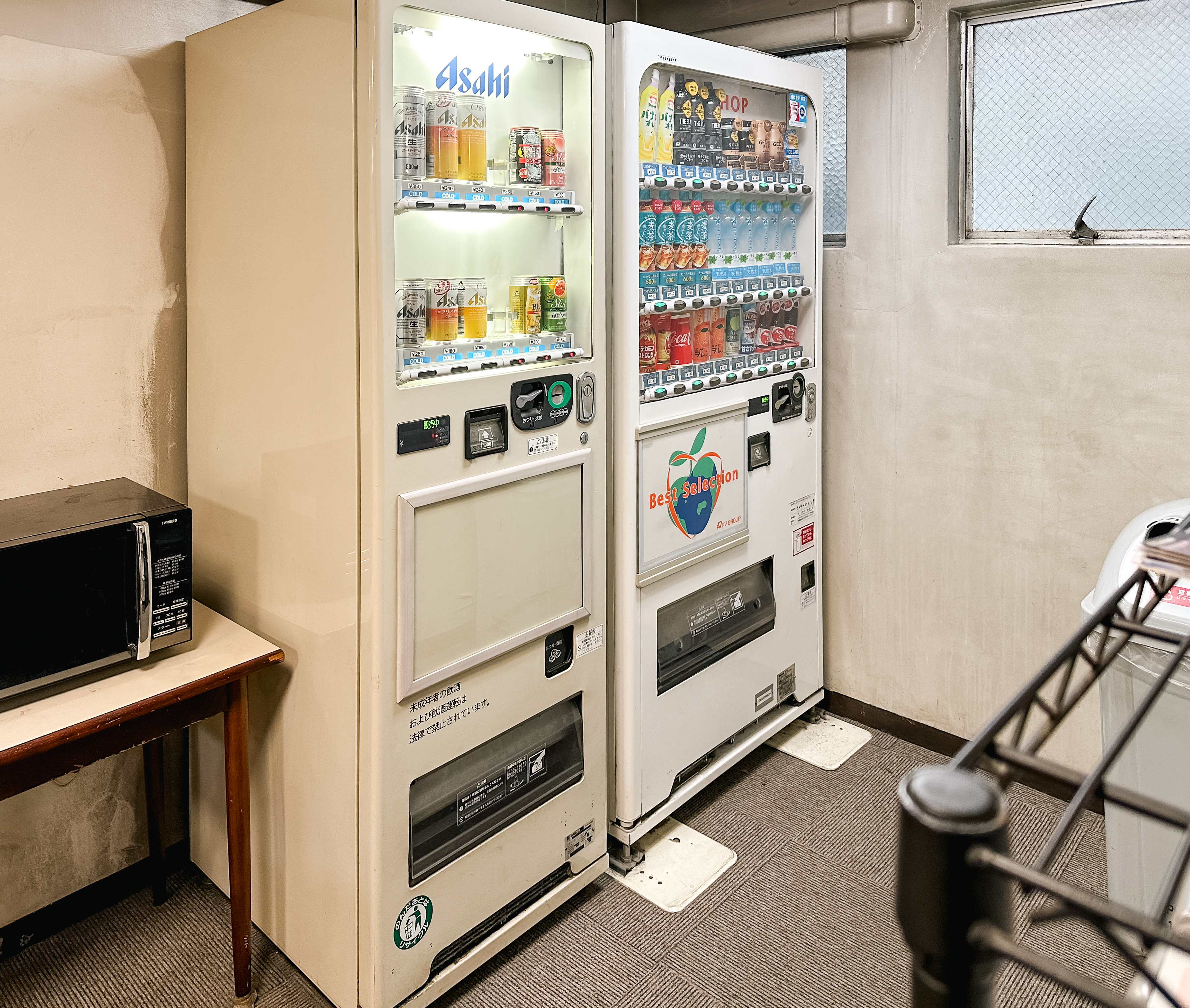 호텔 2층에는 음료를 뽑아서 마실 수 있는 자판기와 코인세탁기(건조기)가 있었습니다. 세탁기의 경우 세제(60円)를 별도구입해야 한다고 합니다. 저같이 일주일 이상을 체류하는 경우에는 가방을 가볍게 가서 중간에 빨래를 한 번 돌려서 다시 입는 것도 나쁘지 않을 것 같습니다.