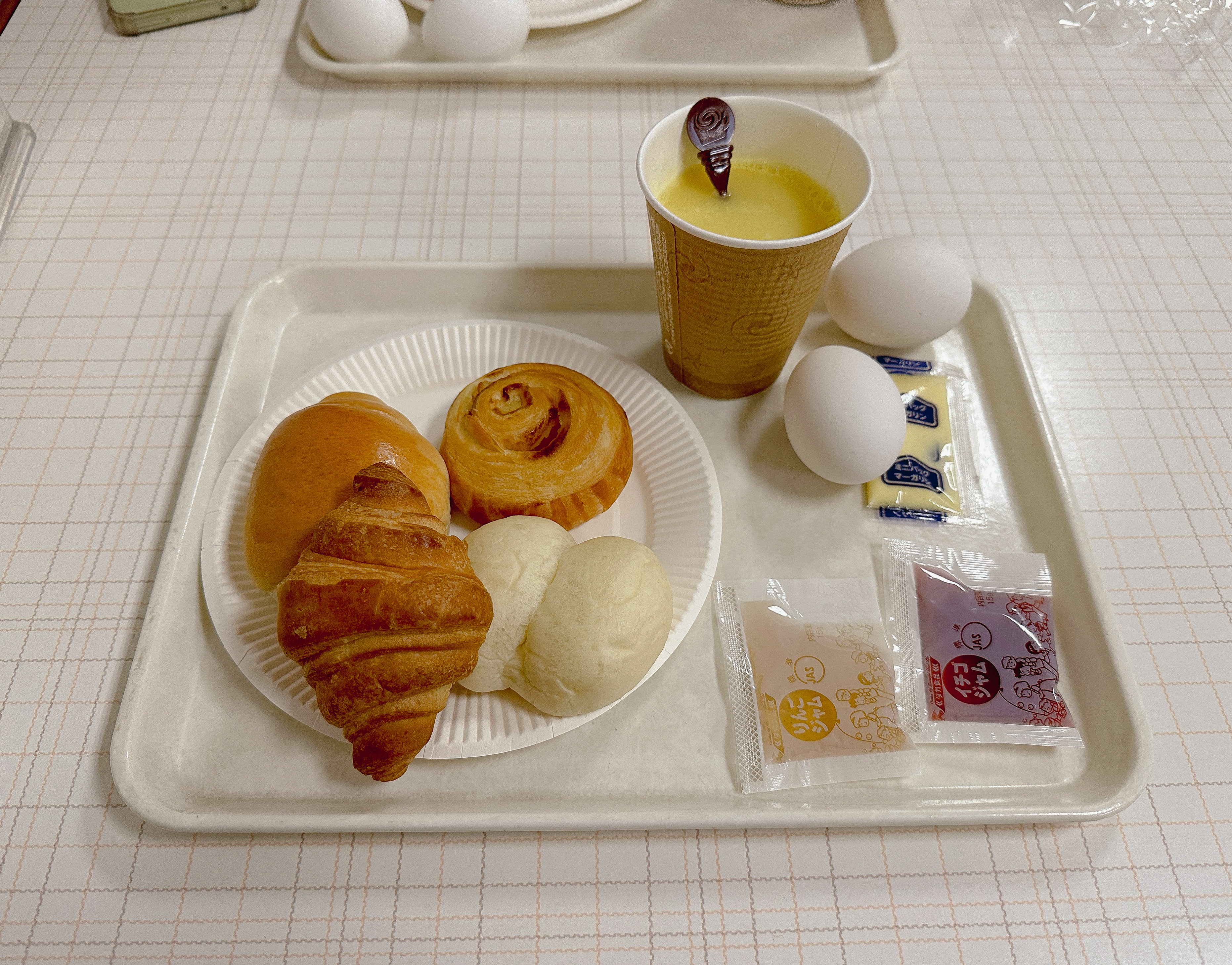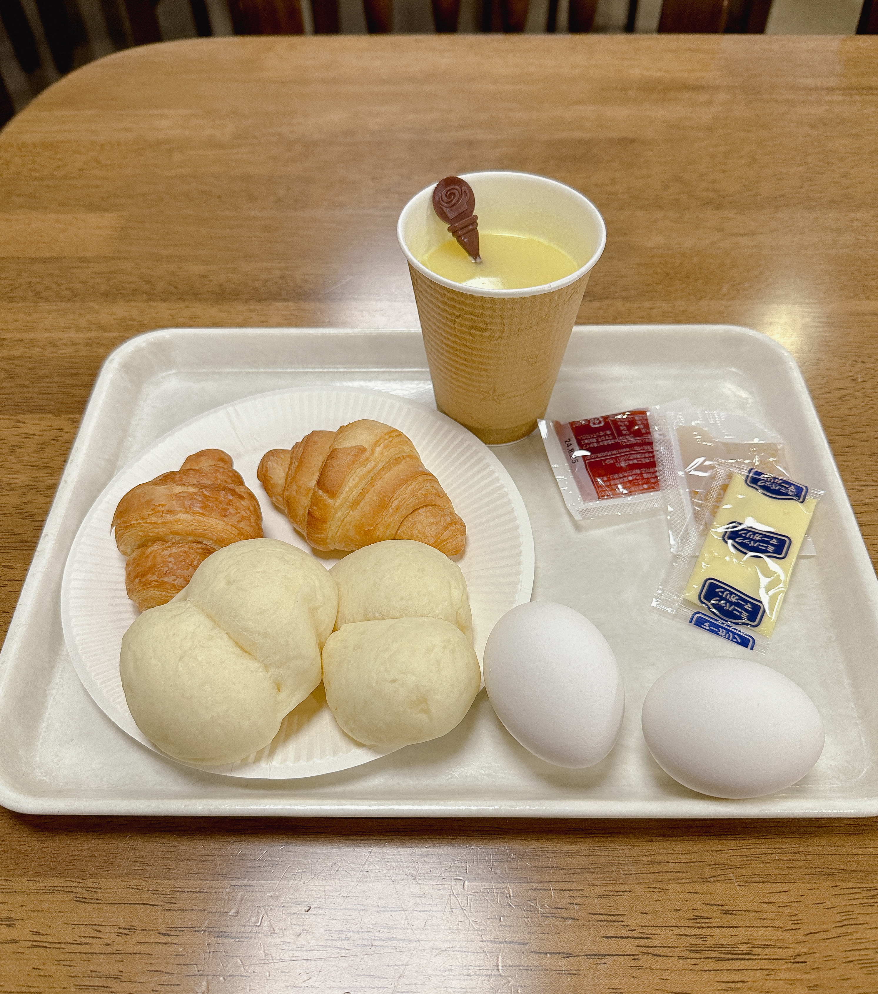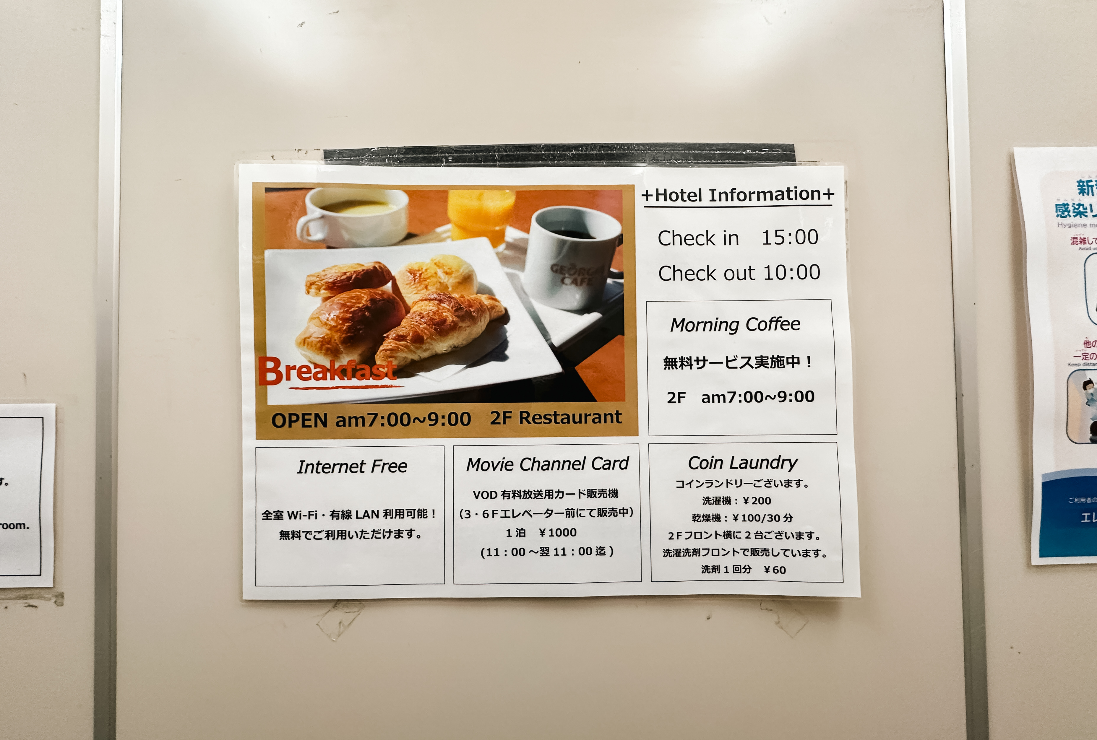 무료 조식에 대한 안내는 체크인 시에도 받을 수 있지만, 객실로 이동하는 엘리베이터에도 안내문이 게시되어 있어서 어렵지 않게 이용할 수 있었습니다. 이용시간은 07:00~09:00 까지였으며, 조식에는 빵과 달걀, 주스, 수프, 커피, 물 등이 제공되었습니다.