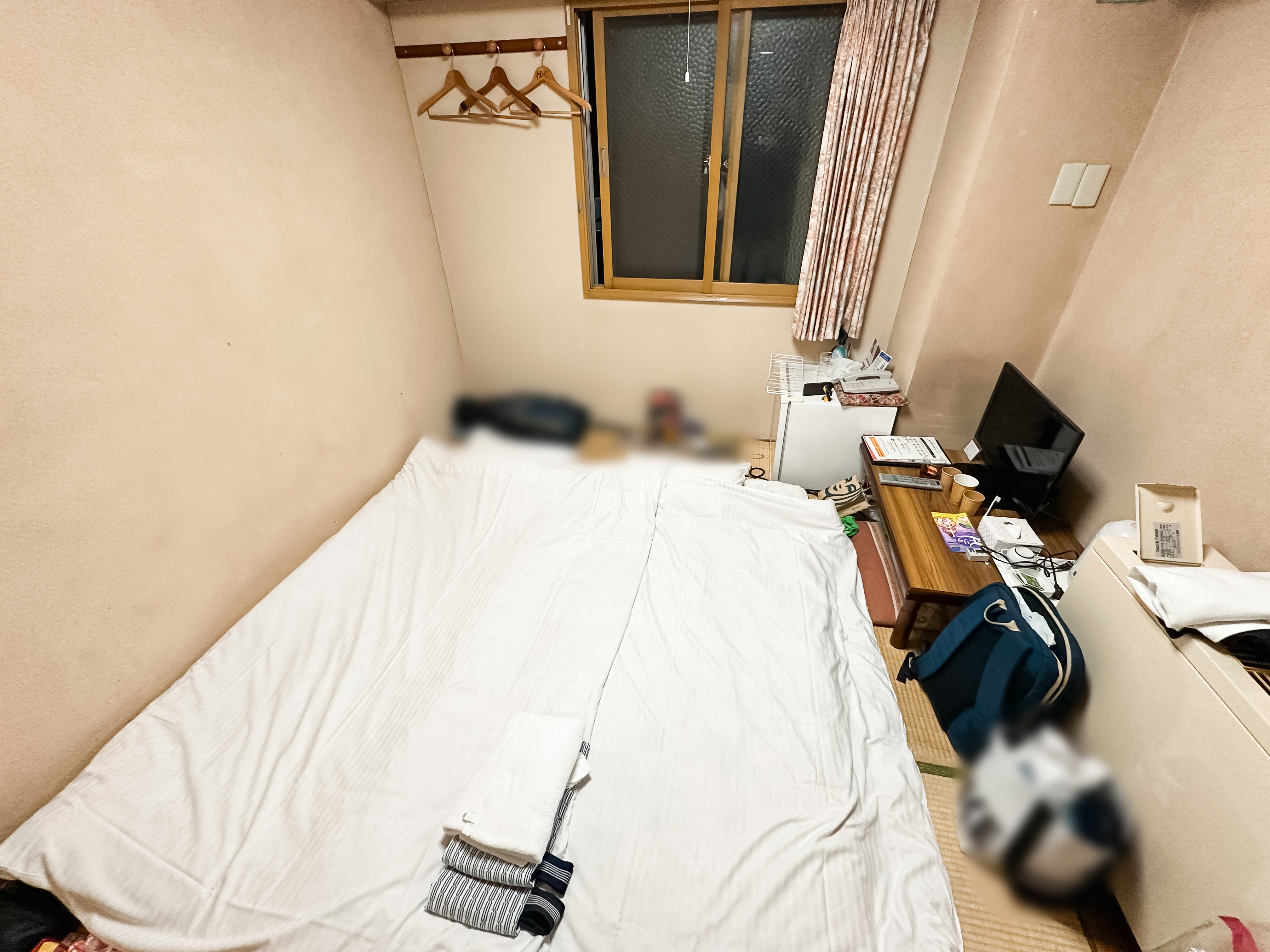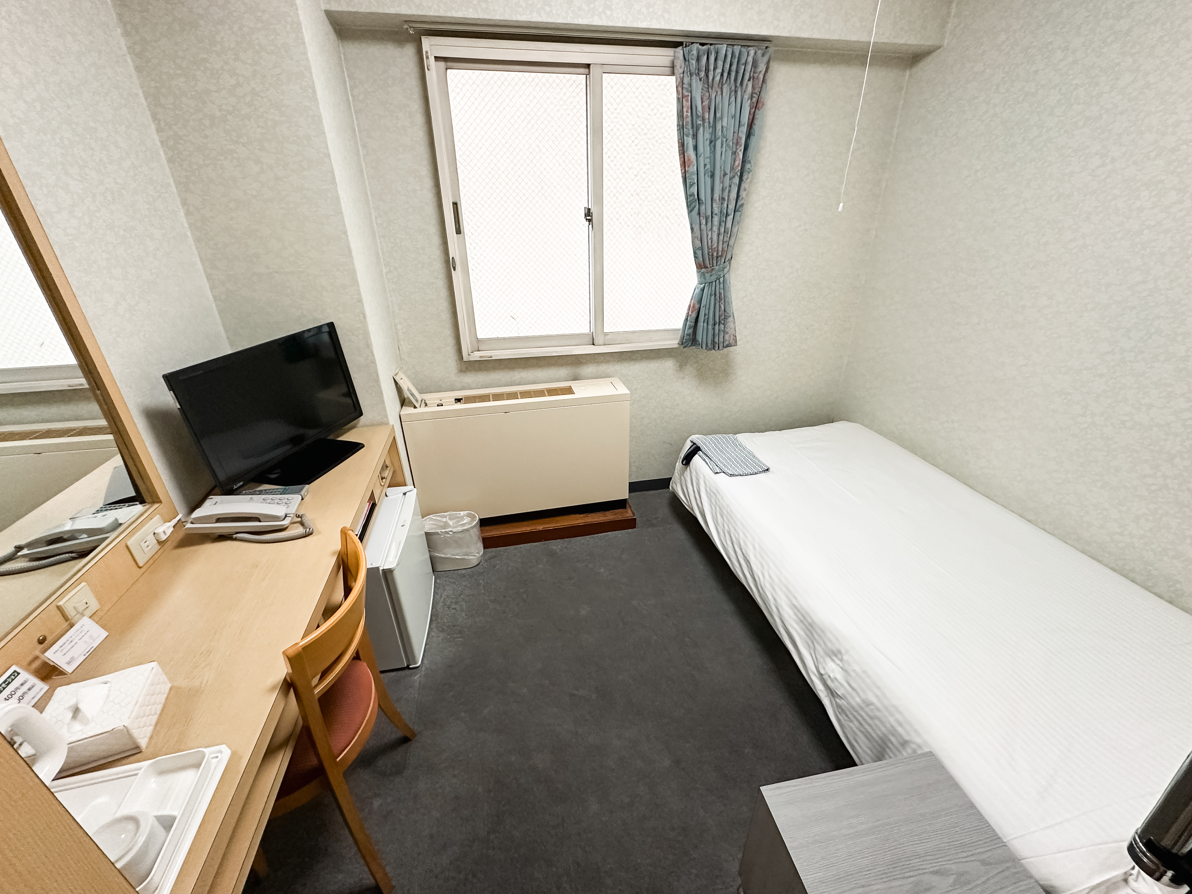저는 온돌방을 선택했지만, 침대방을 선택하시면 위와 같은 방을 선택하실 수 있습니다. 침대방은 다다미가 아니라 카펫으로 되어있어서 신발을 신고 돌아다닐 수도 있었습니다. 아무래도 가성비에 초점이 맞추어진 숙소인 만큼 숙소도 연식이 좀 있고, 방의 크기도 조금 작은 편이었습니다.