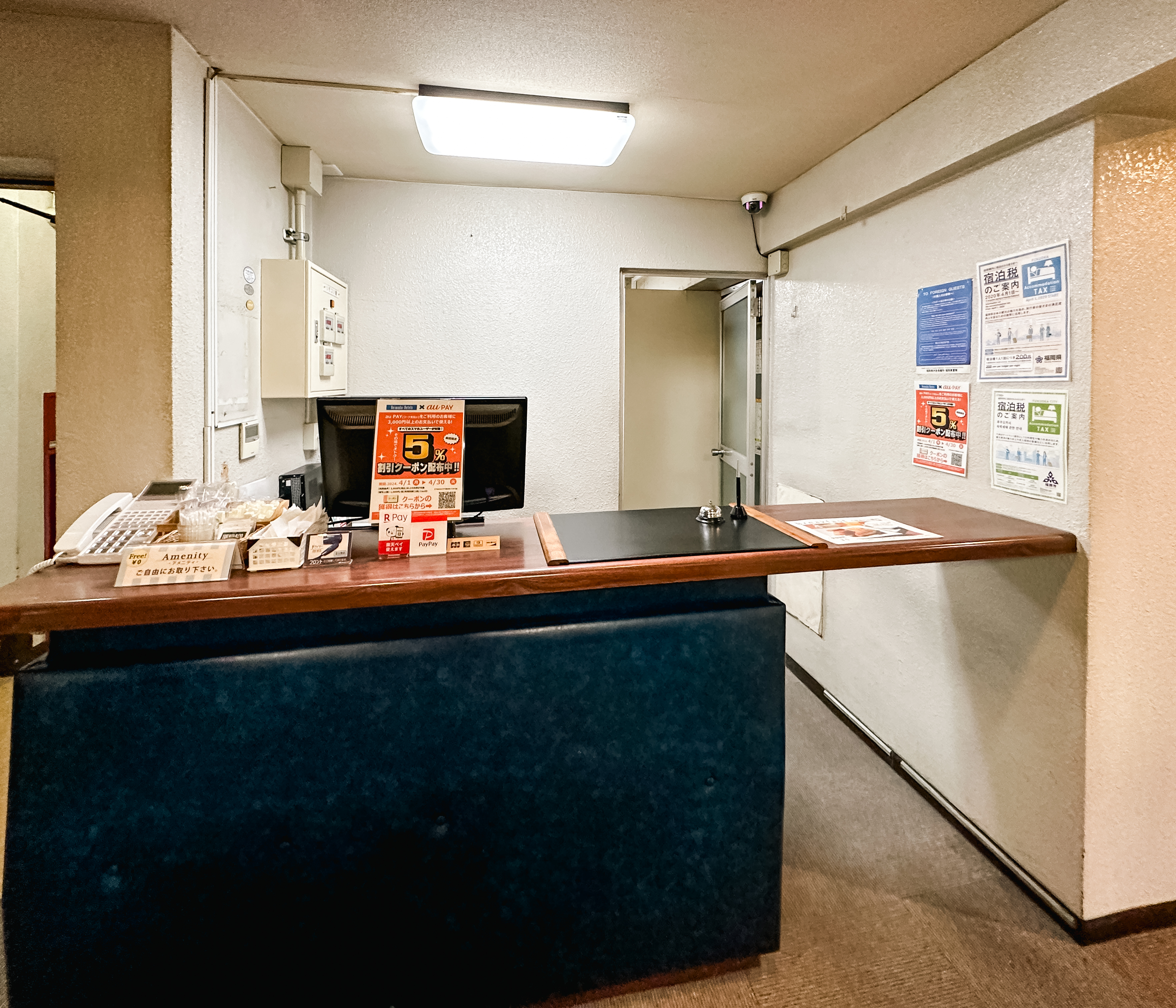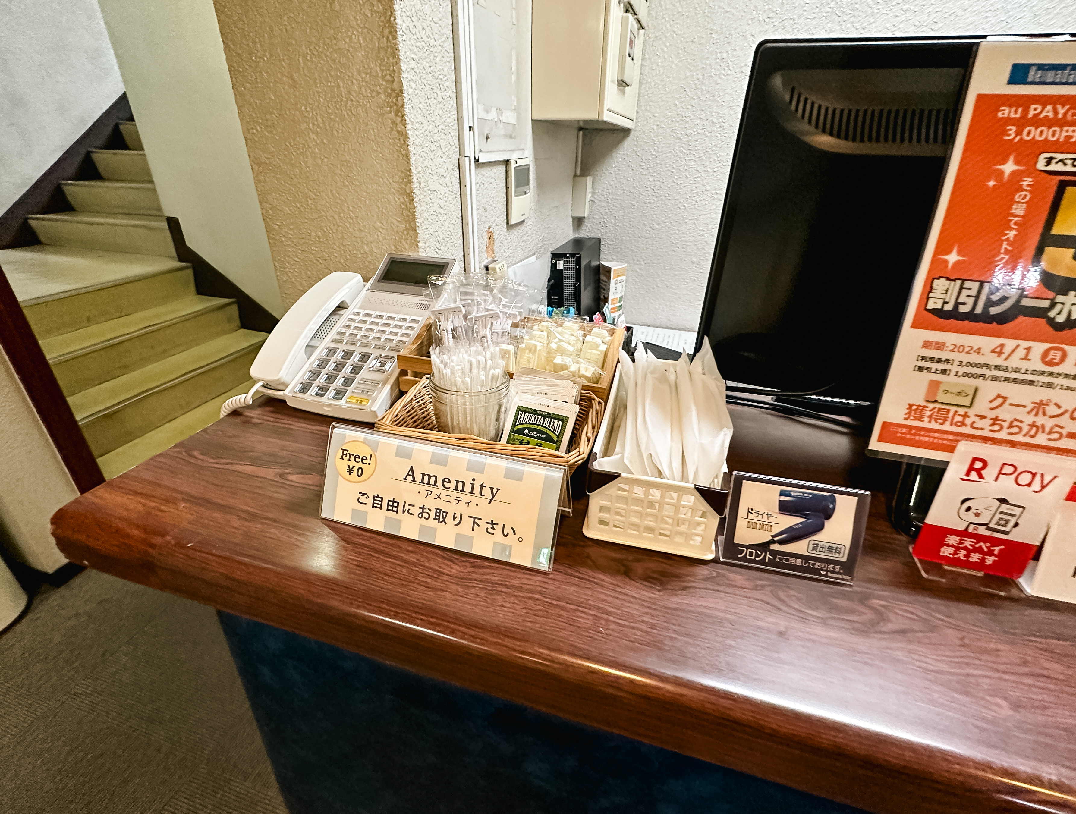 체크인은 2층에서 할 수 있었고, 제가 방문한 날에는 여성 직원분이 안내해 주셨는데, 외국인 방문이 많아서 그런지 제가 일본어에 능숙하지 않아도 곧잘 이해해서 예약내용을 확인해 주셨습니다. 이곳에서는 어매니티로 면도기와 일회용 빗, 녹차, 칫솔을 무료로 제공하고 있었고, 필요할 경우 드라이어도 대여해주고 있었습니다.