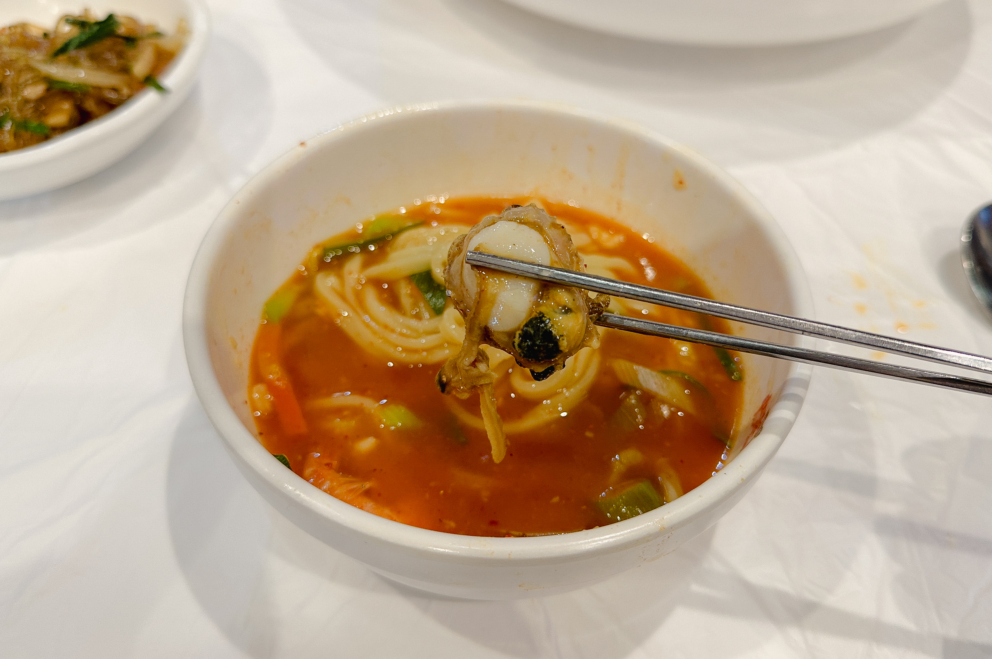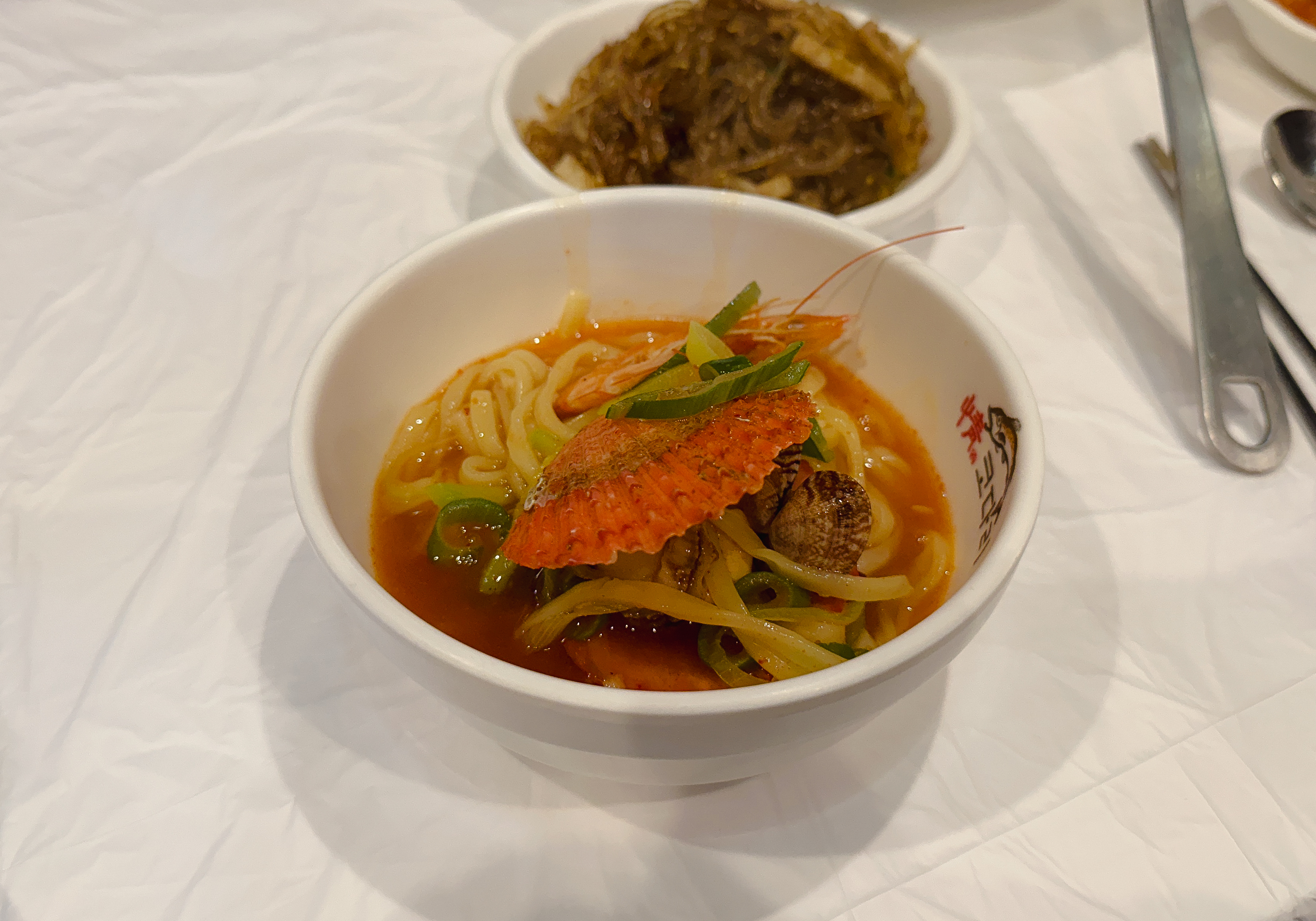 다음날 먹은 메뉴는 얼큰해물생칼국수였는데, 새우와 바지락, 가리비, 꽃게 등이 들어가 시원하면서도 감칠맛 있는 국물이 좋았습니다. 사실은 황태해물칼국수를 주문했는데, 엉뚱한 메뉴가 나와서 놀랐는데 그냥저냥 먹을만하더라고요.