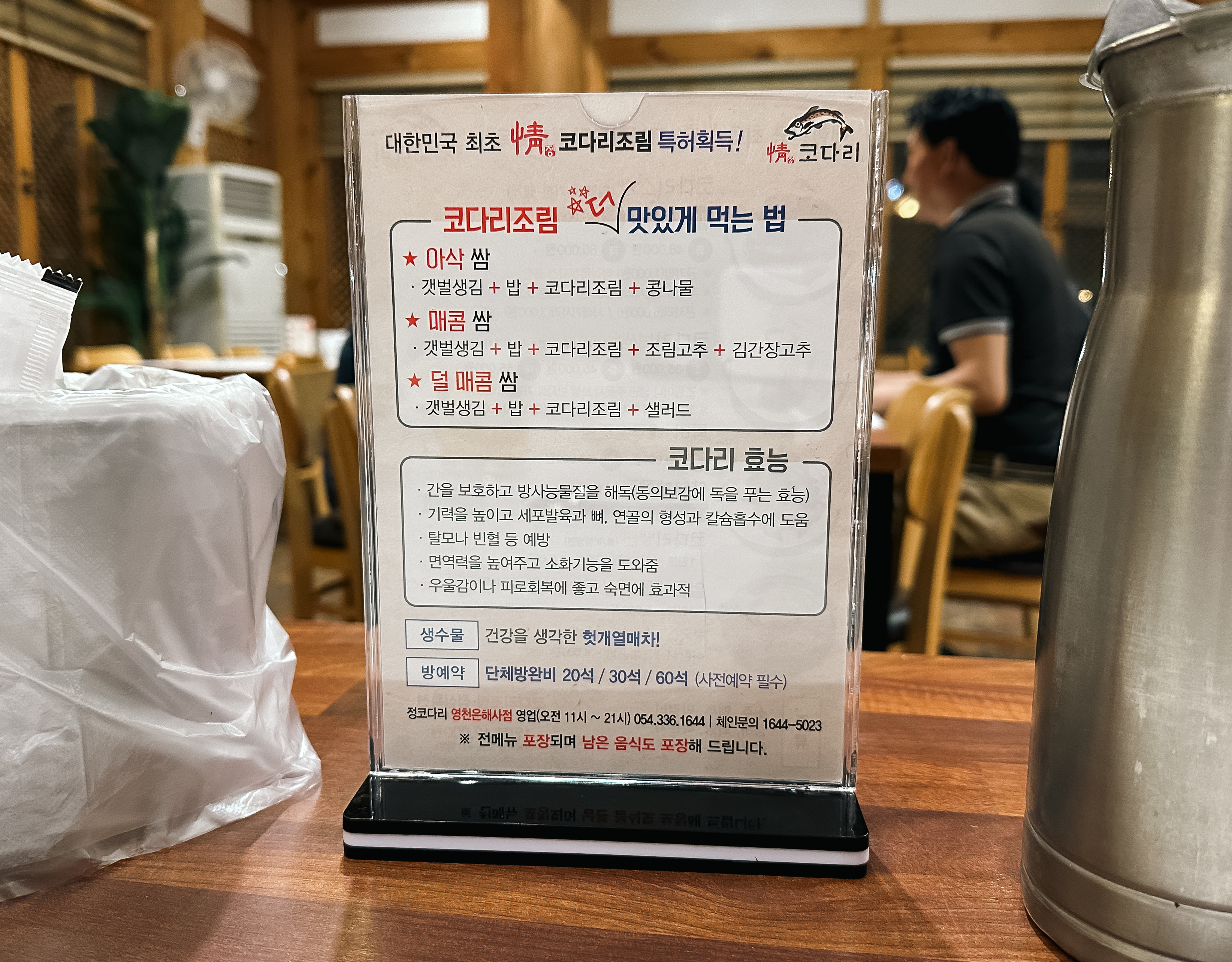 영천 정코다리의 메뉴는 코다리조림, 코다리보쌈, 대구뽈조림, 양념게장정식, 코다리냉면, 얼큰해물생칼국수, 황태해물생칼국수, 콩국수, 어린이새우볶음밥 등이 있었습니다. 가게에는 코다리조림 맛있게 먹는 법에 대해서 안내하고 있었는데, 갯벌생김은 어디에나 잘 어울리는 것 같더라고요. 식사는 배달로봇을 통해 전달되었습니다.