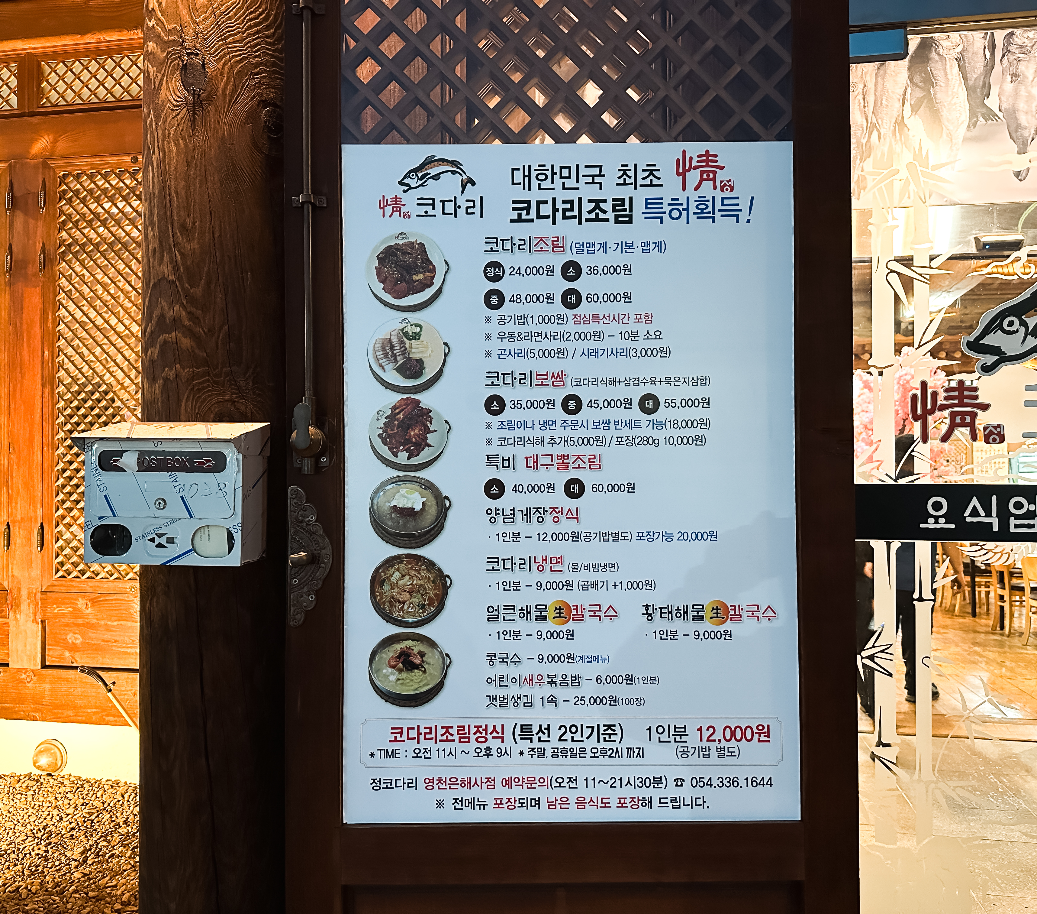 제가 다녀온 정코다리는 '영천은해사점'으로 경북 영천시 청통면 신학리 509 에 위치한 가게였으며, 한옥인데 꽤 큰 규모로 지어져 굉장히 넓고 쾌적했습니다. 이 근방에서 일을 마치고 숙박을 했는데, 마땅히 먹을만한 가게가 없어서(?) 이틀 연속으로 방문했습니다.