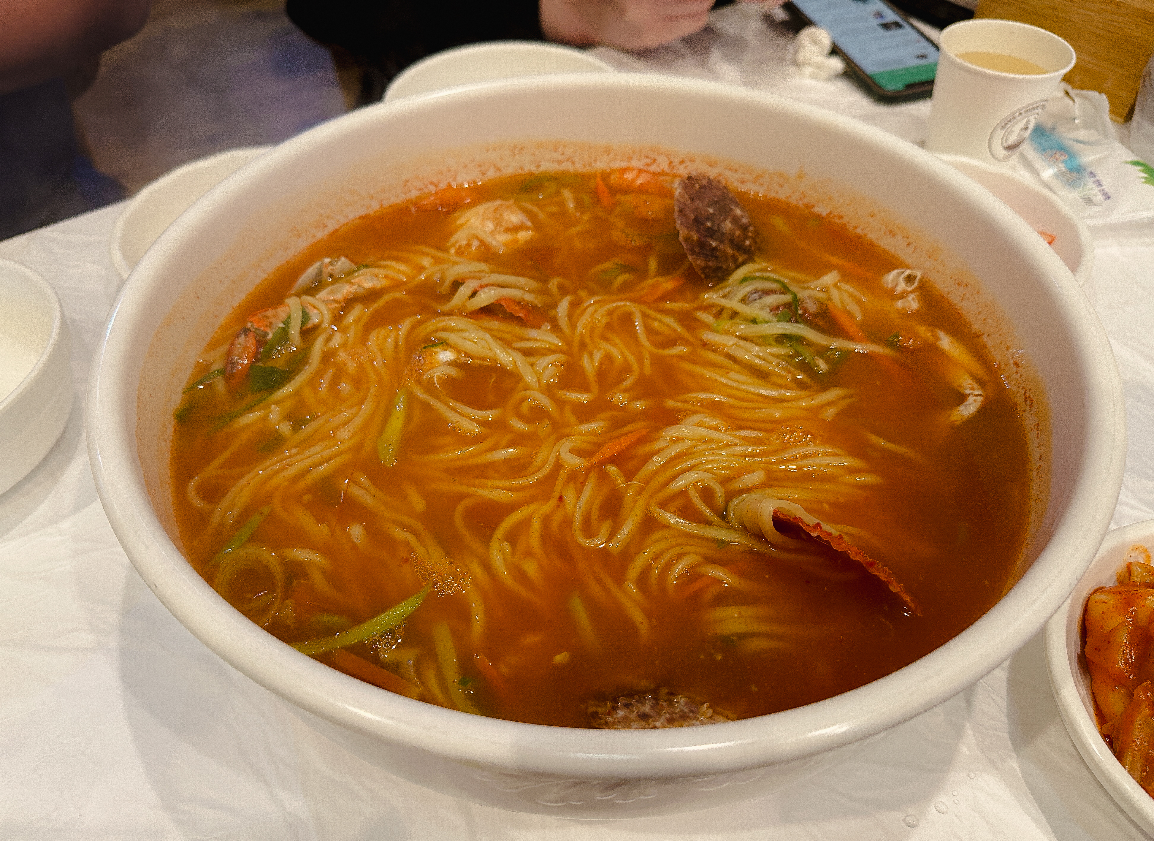 다음날 먹은 메뉴는 얼큰해물생칼국수였는데, 새우와 바지락, 가리비, 꽃게 등이 들어가 시원하면서도 감칠맛 있는 국물이 좋았습니다. 사실은 황태해물칼국수를 주문했는데, 엉뚱한 메뉴가 나와서 놀랐는데 그냥저냥 먹을만하더라고요.