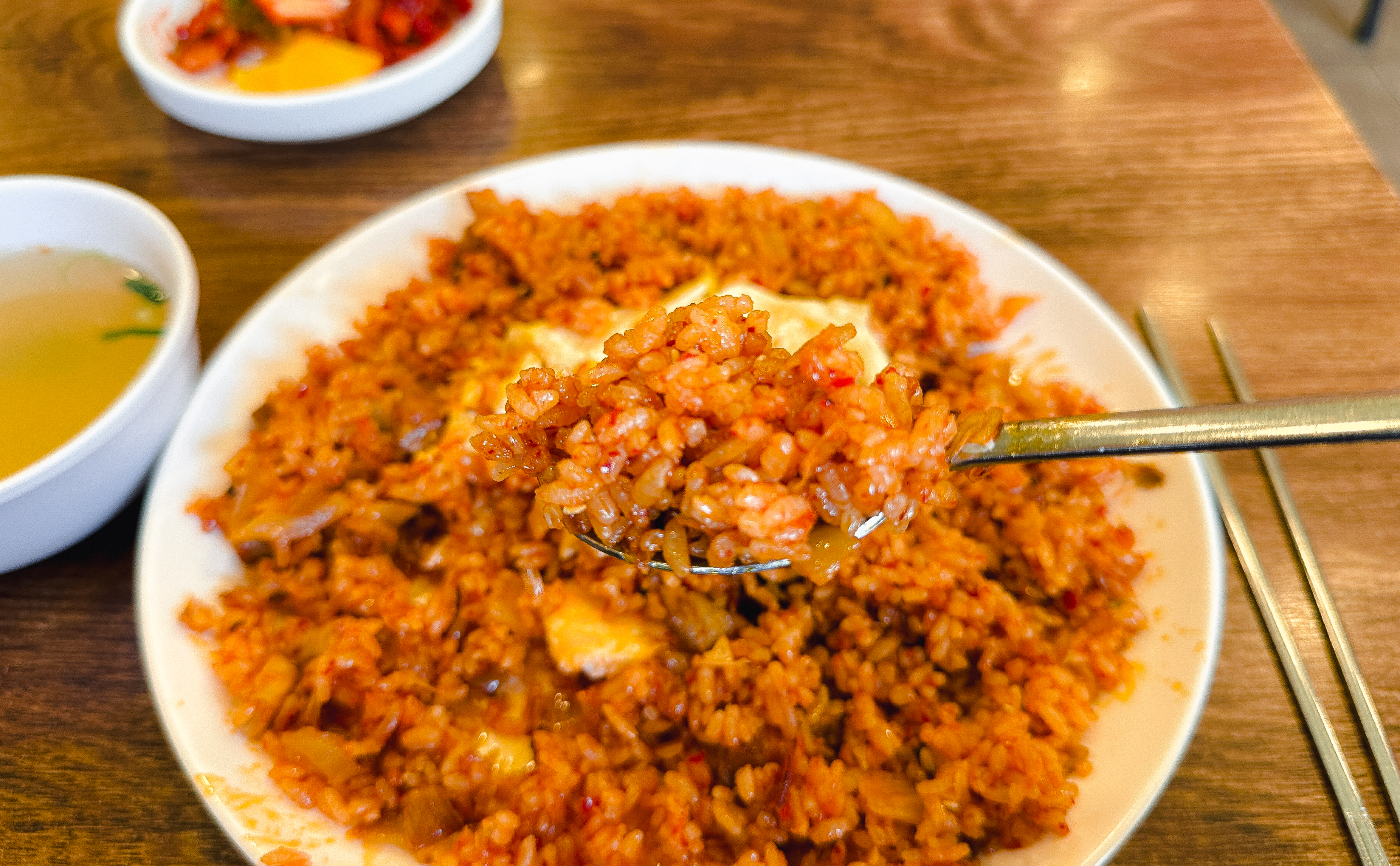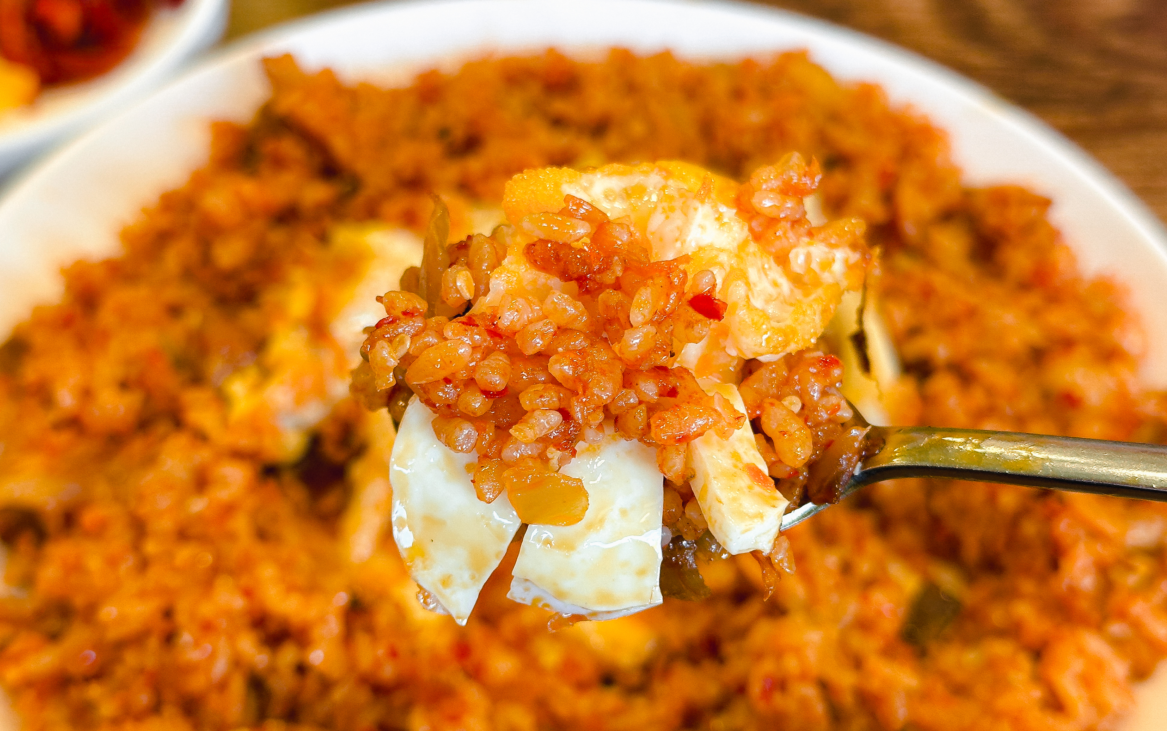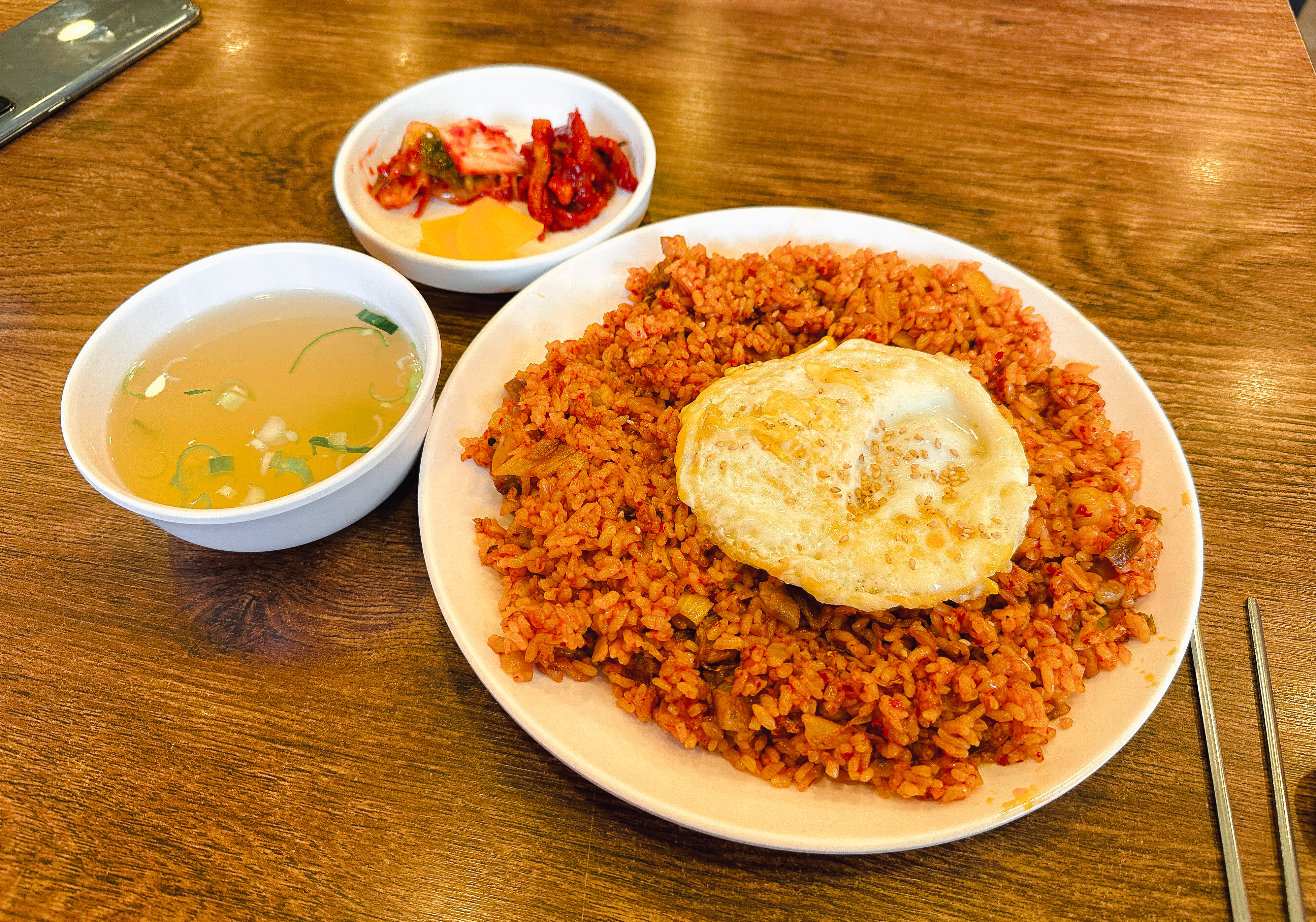 또래끼리 김치볶음밥은 메인 메뉴가 김치볶음밥인 만큼 메뉴가 주문과 동시에 빠르게 조리되어 나왔고, 반찬과 장국은 셀프로 가져다 먹을 수 있었습니다. 장국은 생각보다 자극적이었는데, 딱히 끌리는 맛은 아니었습니다. 그럼 김치볶음밥을 마저 살펴보실까요?