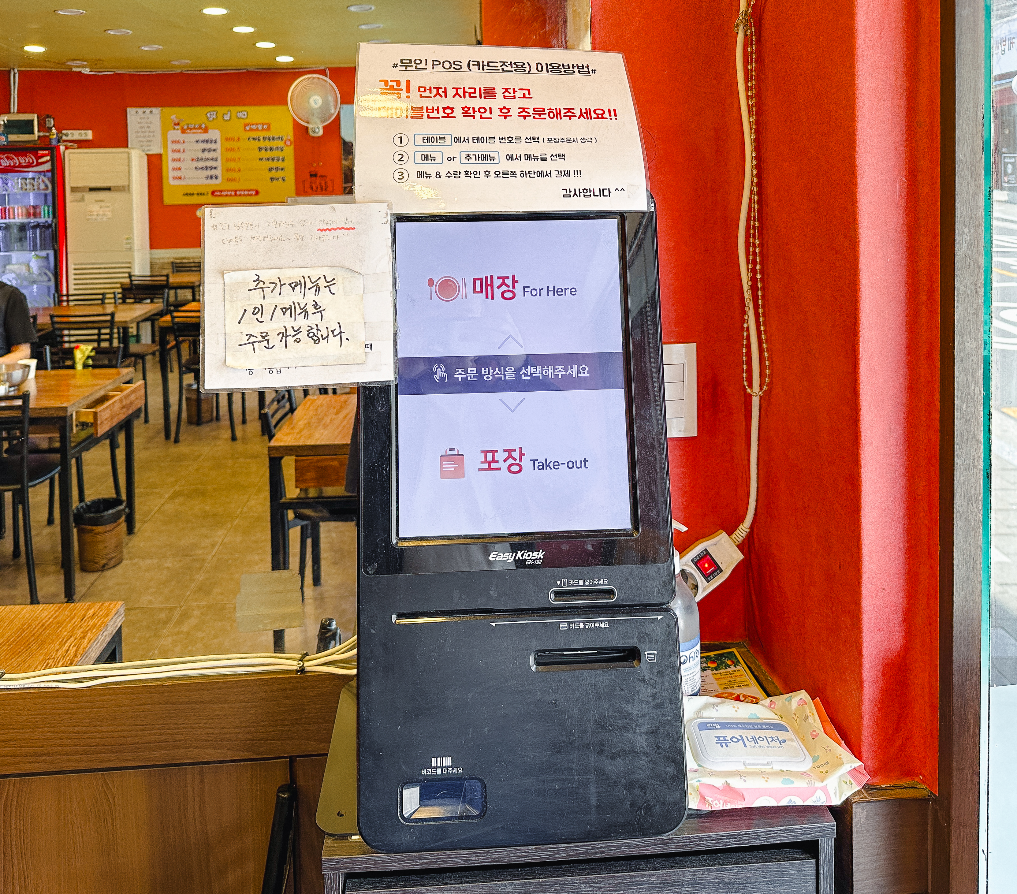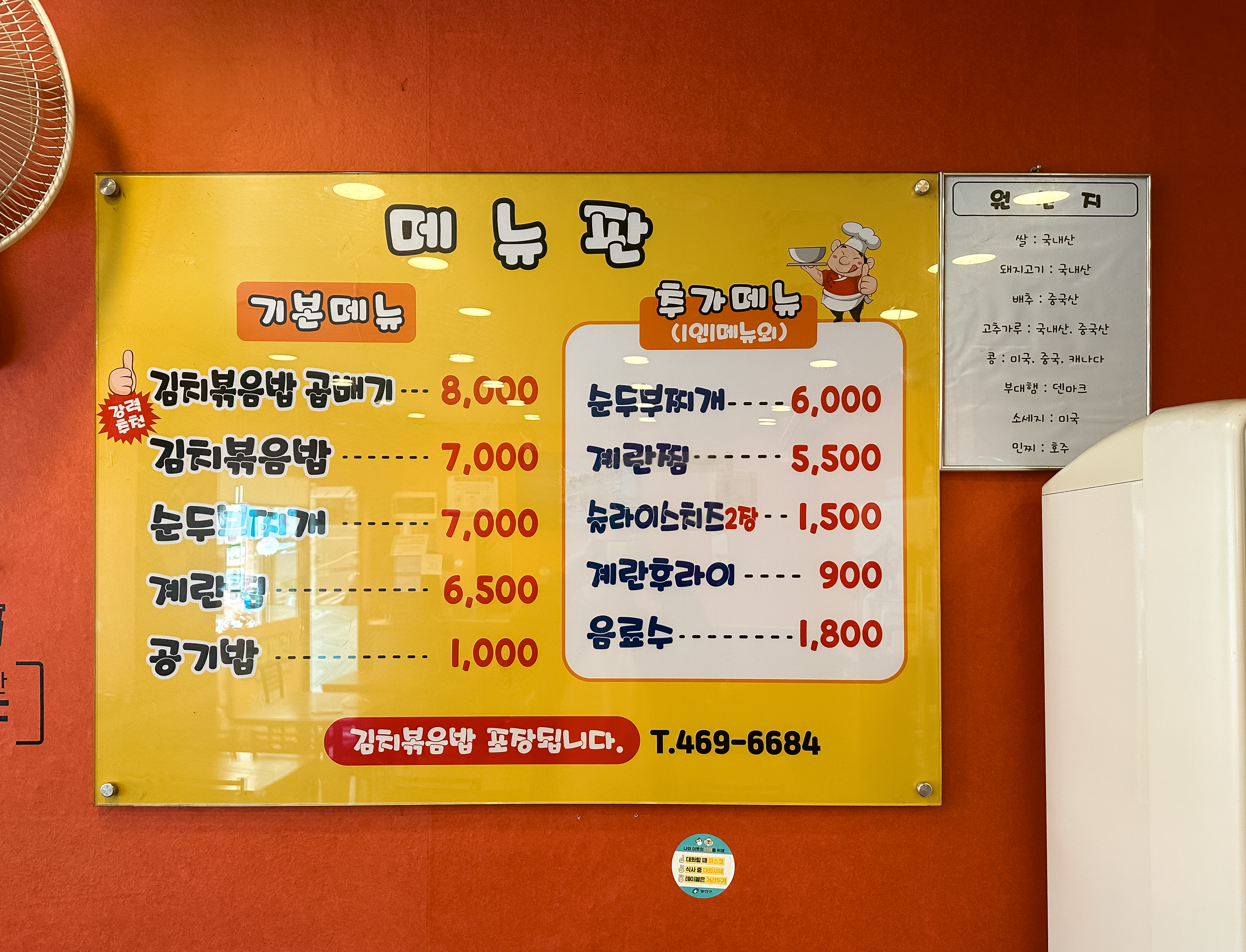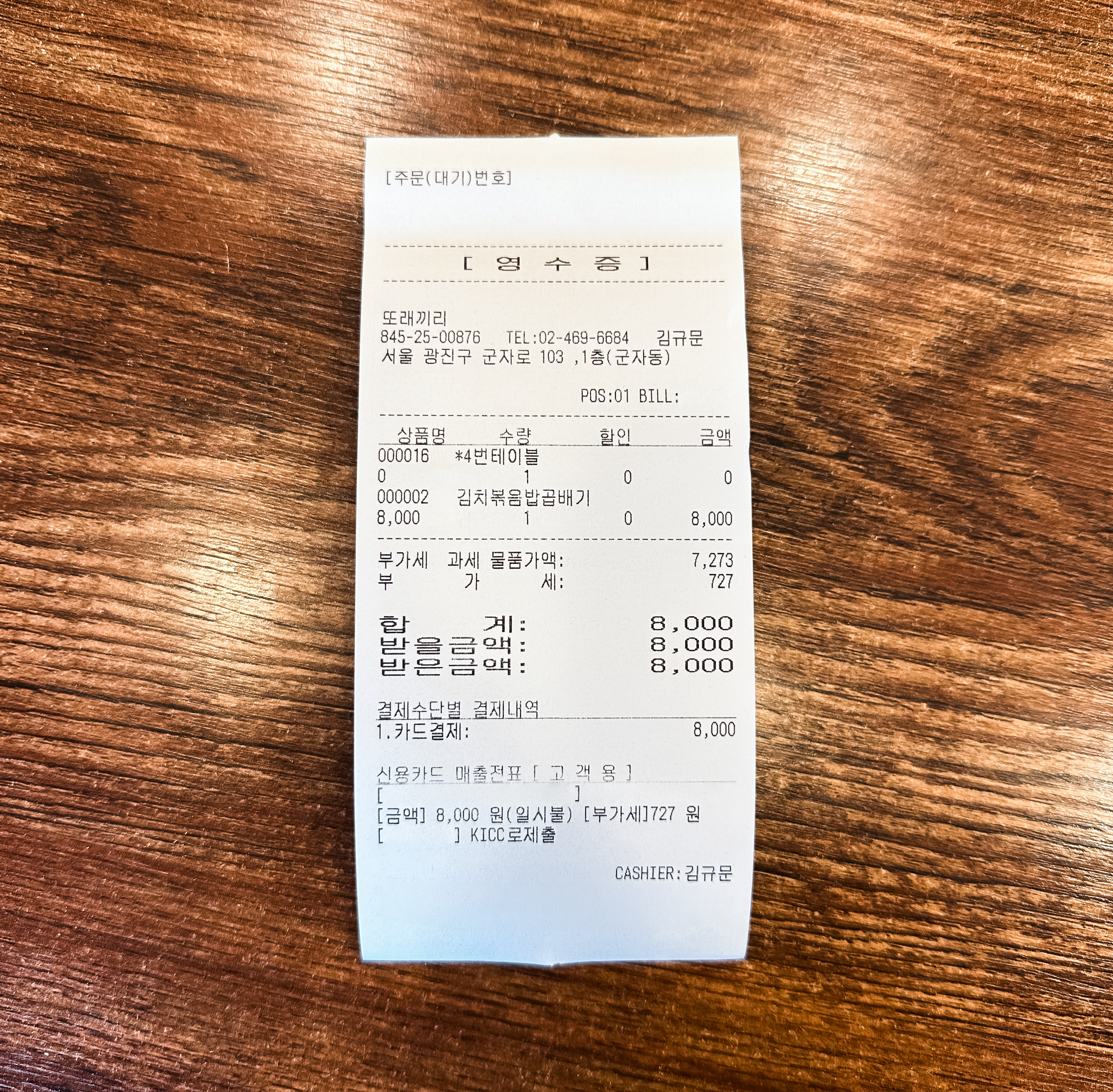군자동 또래끼리의 메뉴는 김치볶음밥곱빼기, 김치볶음밥, 순두부찌개, 계란찜 등이 있었습니다. 앞서 소개해드린 내용처럼 이 가게는 김치볶음밥이 메인이기 때문에 순두부찌개와 계란찜은 김치볶음밥에 곁들이는 메뉴정도로 생각하면 되지 않을까 생각합니다. 메뉴는 키오스크로 주문하면 되었고, 미리 계산을 하고 식사하기 때문에 식사를 마치면 따로 정리할 것 없이 나가면 되었습니다.