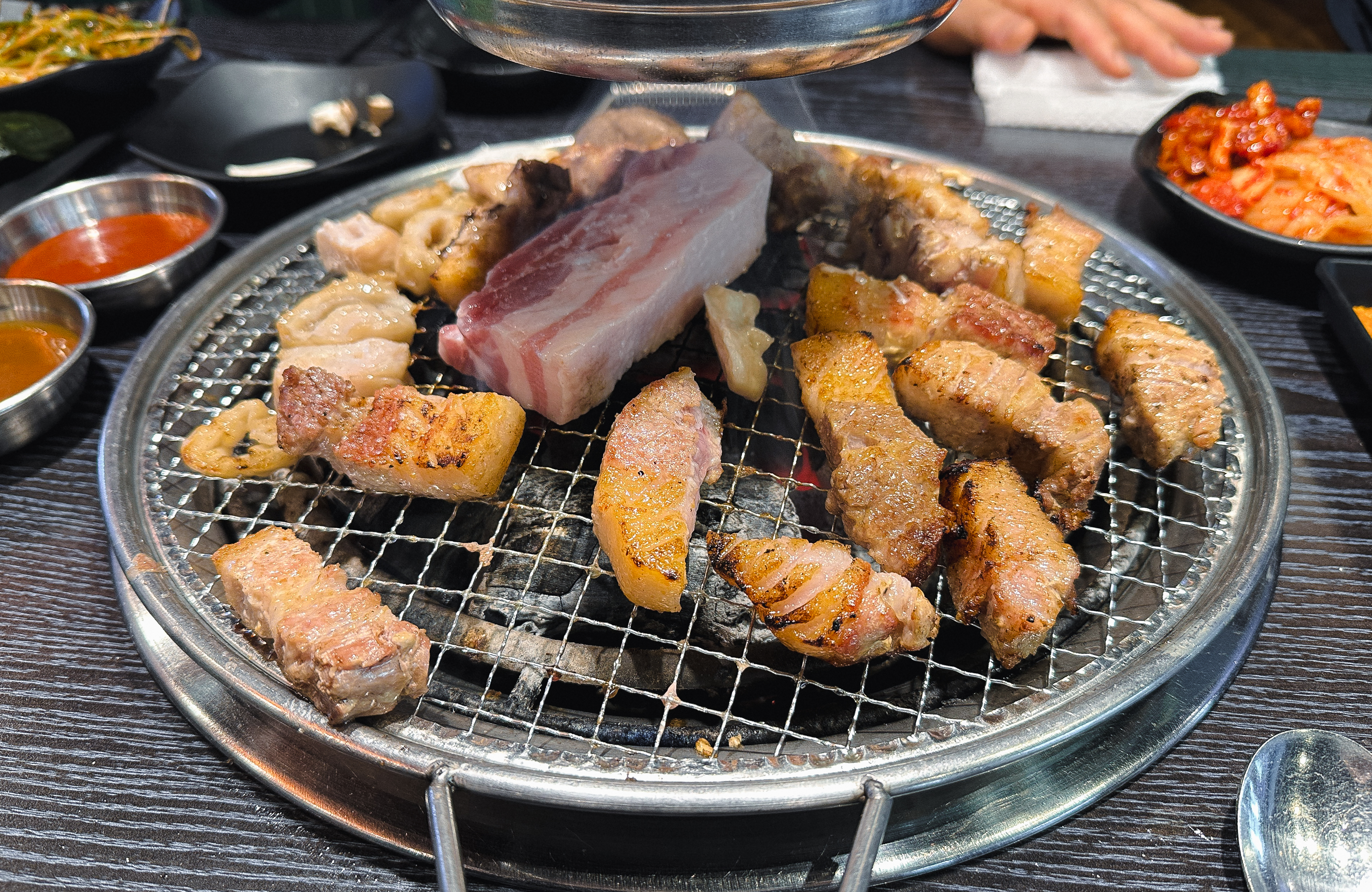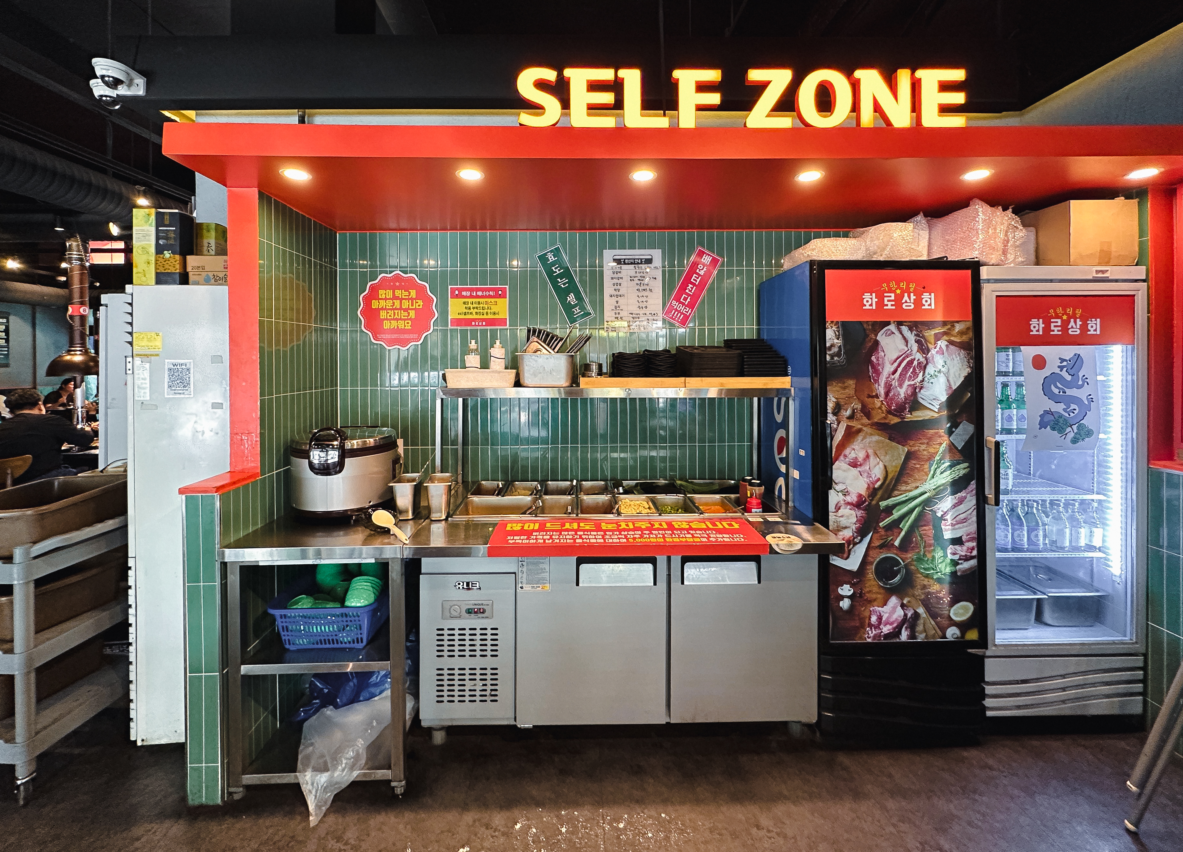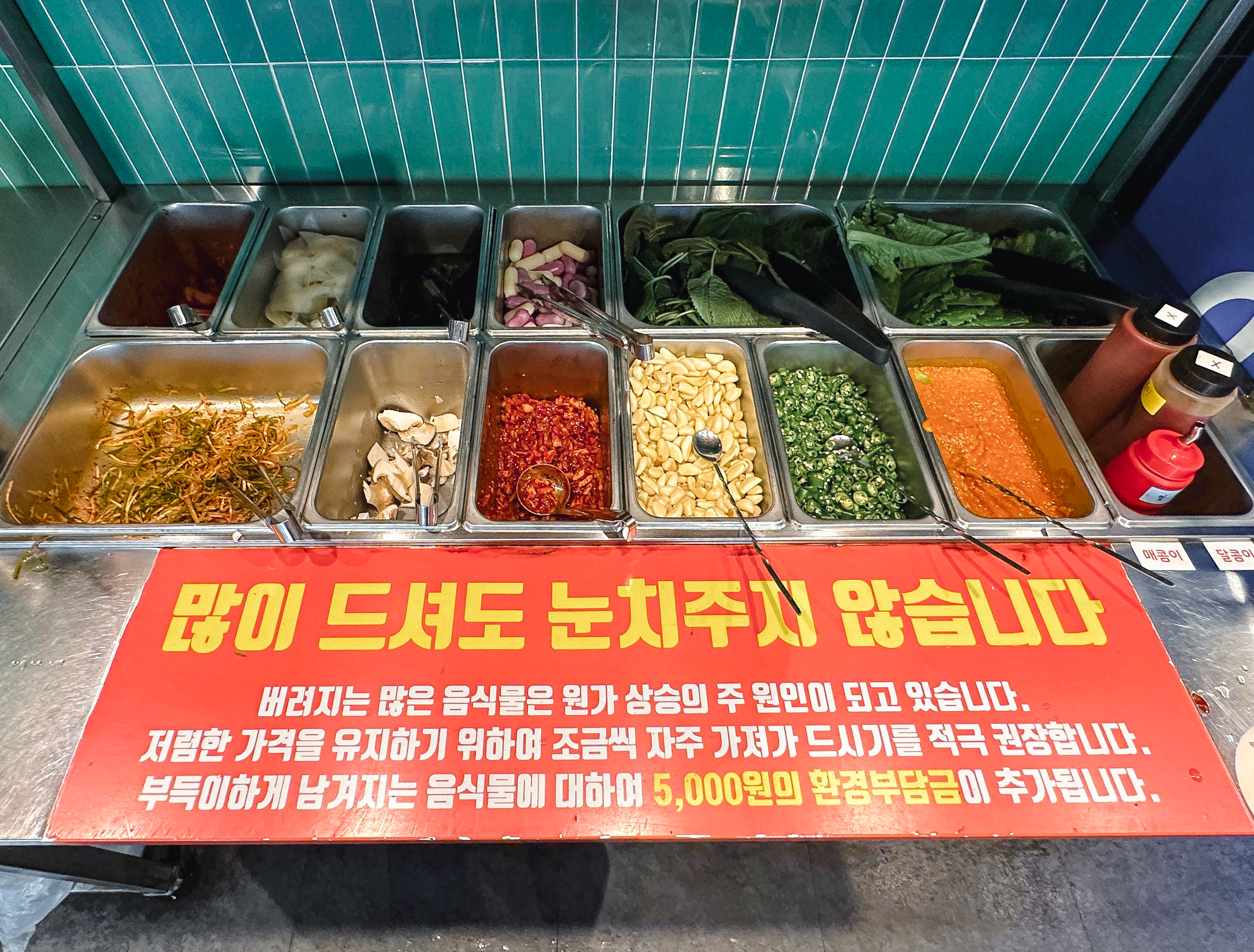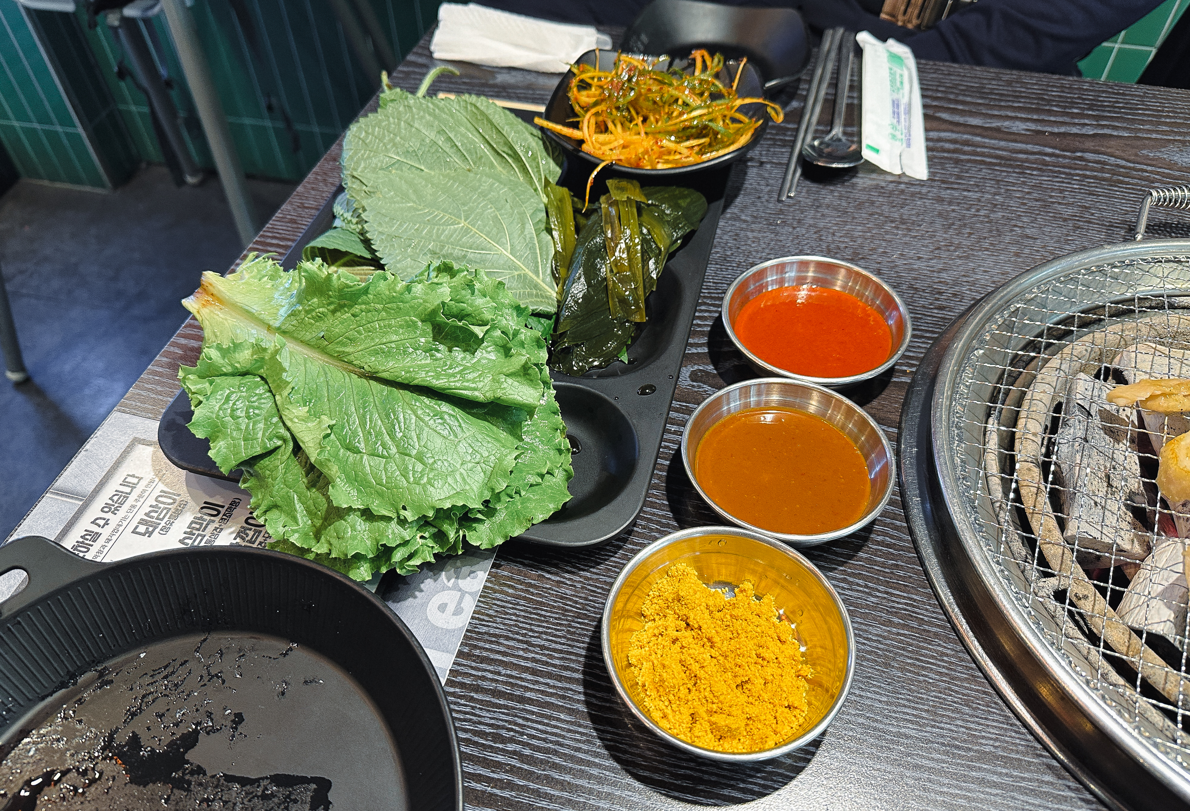 셀프바에는 파절이, 쌈채소, 마늘, 청양고추, 떡, 버섯, 쌈무, 젓갈, 명이나물, 밥 등이 있었고, 멜젓, 매콤한 소스, 달콤한 소스, 소금, 쌈장과 같이 고기와 곁들이는 소스류가 있었습니다.