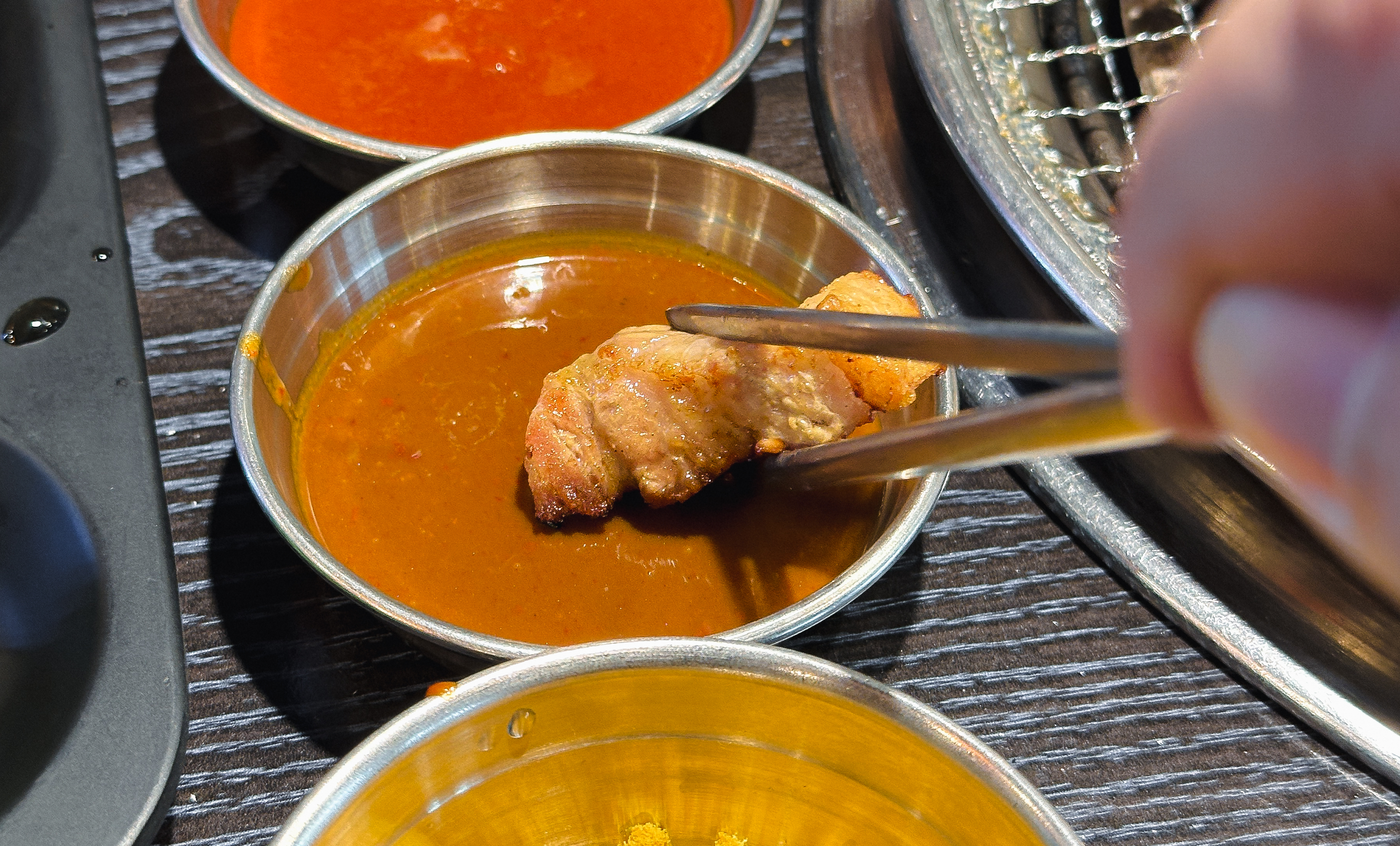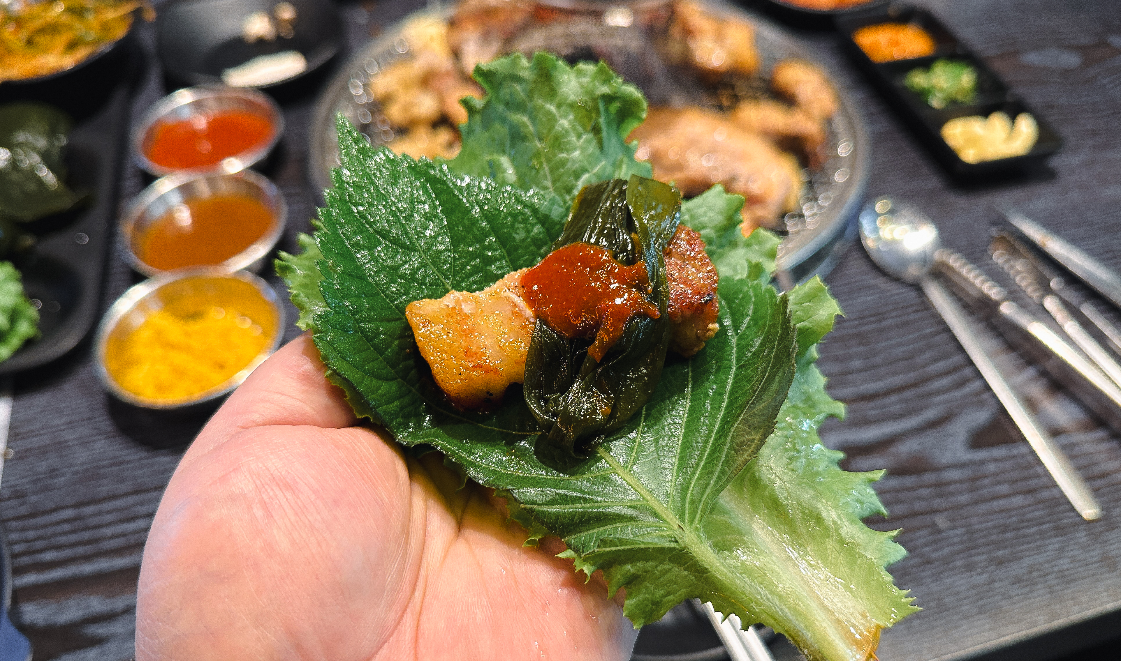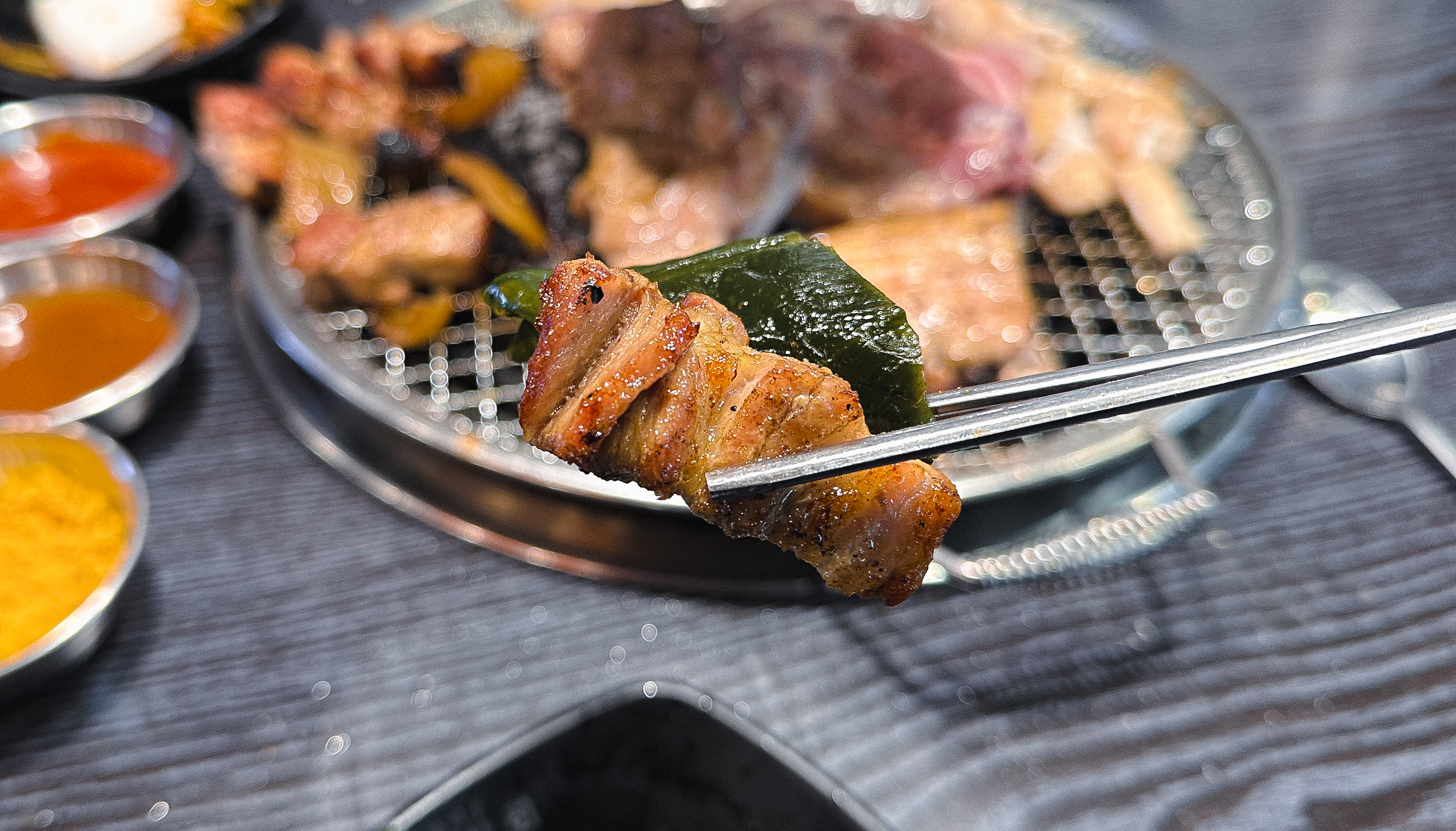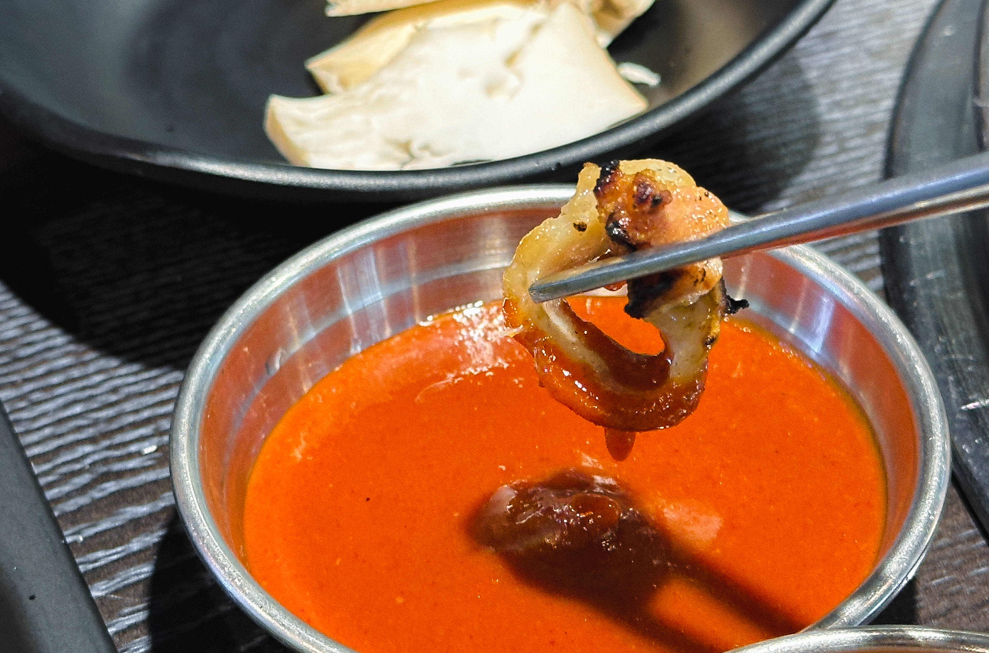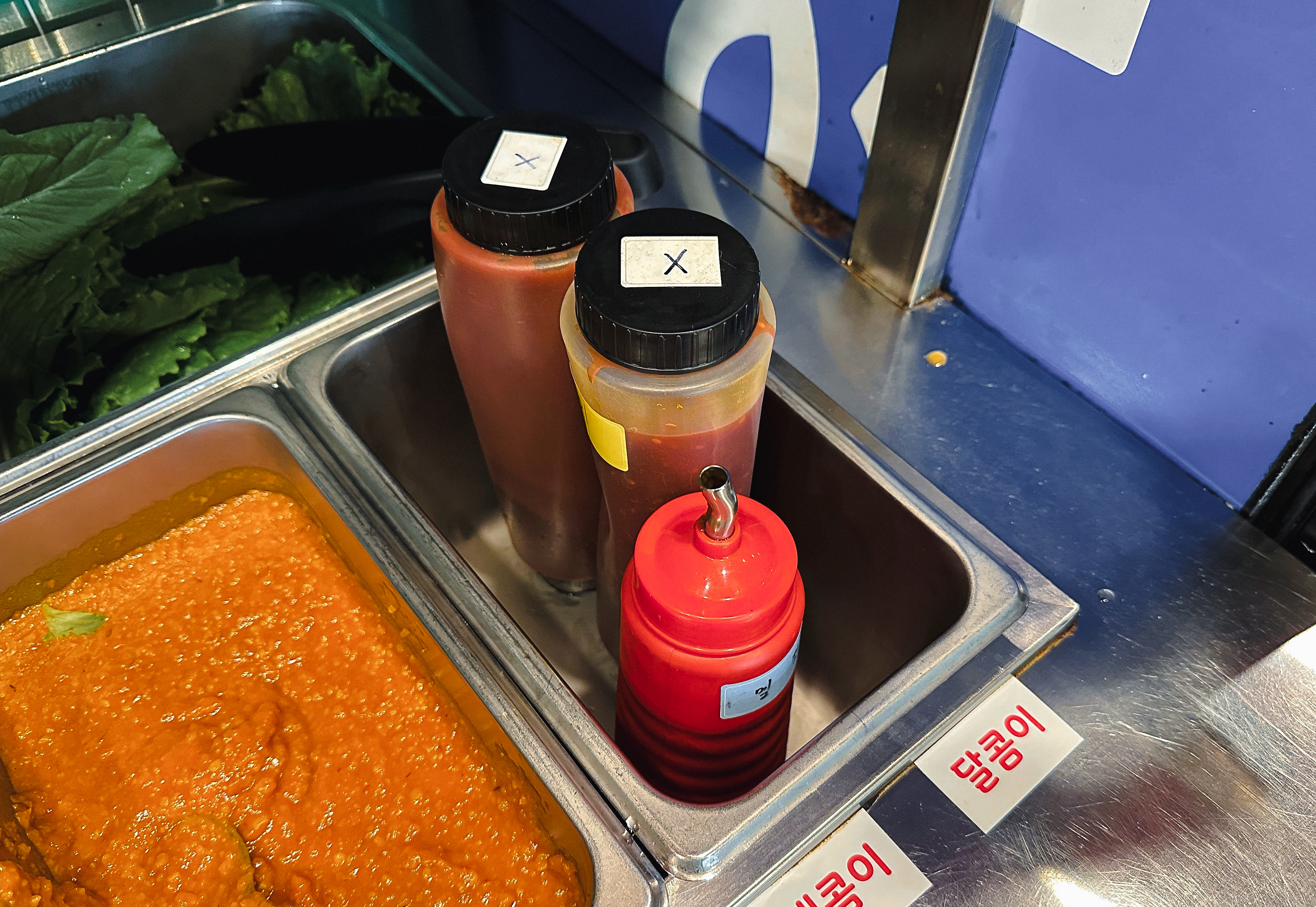 셀프바에는 파절이, 쌈채소, 마늘, 청양고추, 떡, 버섯, 쌈무, 젓갈, 명이나물, 밥 등이 있었고, 멜젓, 매콤한 소스, 달콤한 소스, 소금, 쌈장과 같이 고기와 곁들이는 소스류가 있었습니다.
