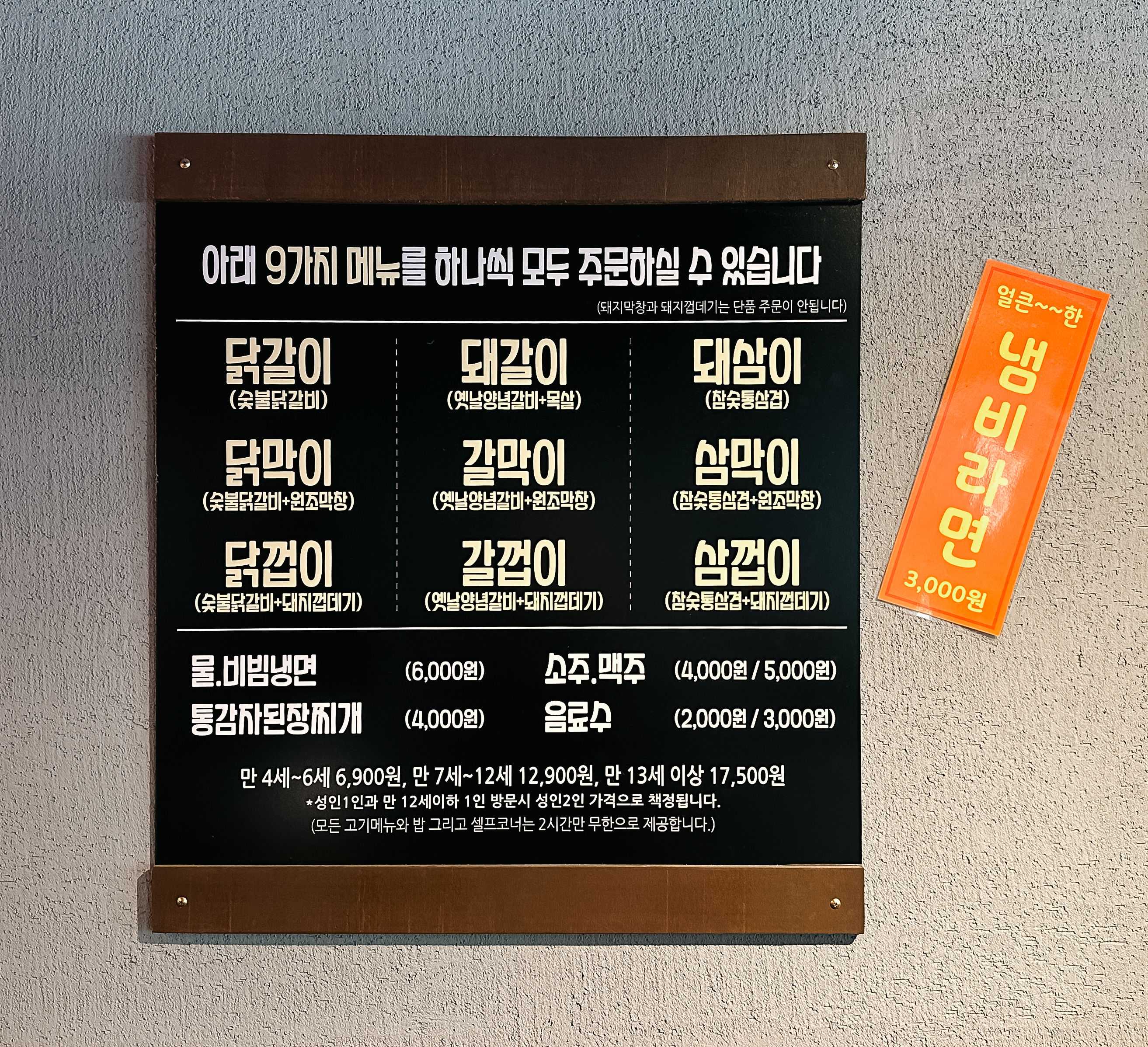 화로상회의 메뉴는 닭갈이, 돼갈이, 돼삼이, 닭막이, 갈막이, 삼막이, 닭껍이, 갈껍이, 삼껍이, 냉면, 통감자된장찌개, 냄비라면 등이 있었고, 가격은 성인기준 17,500원 이었습니다. 반찬은 셀프존에서 직접 가져다 먹으면 되었고, 고기나 식사메뉴는 테이블오더로 주문할 수 있었습니다.