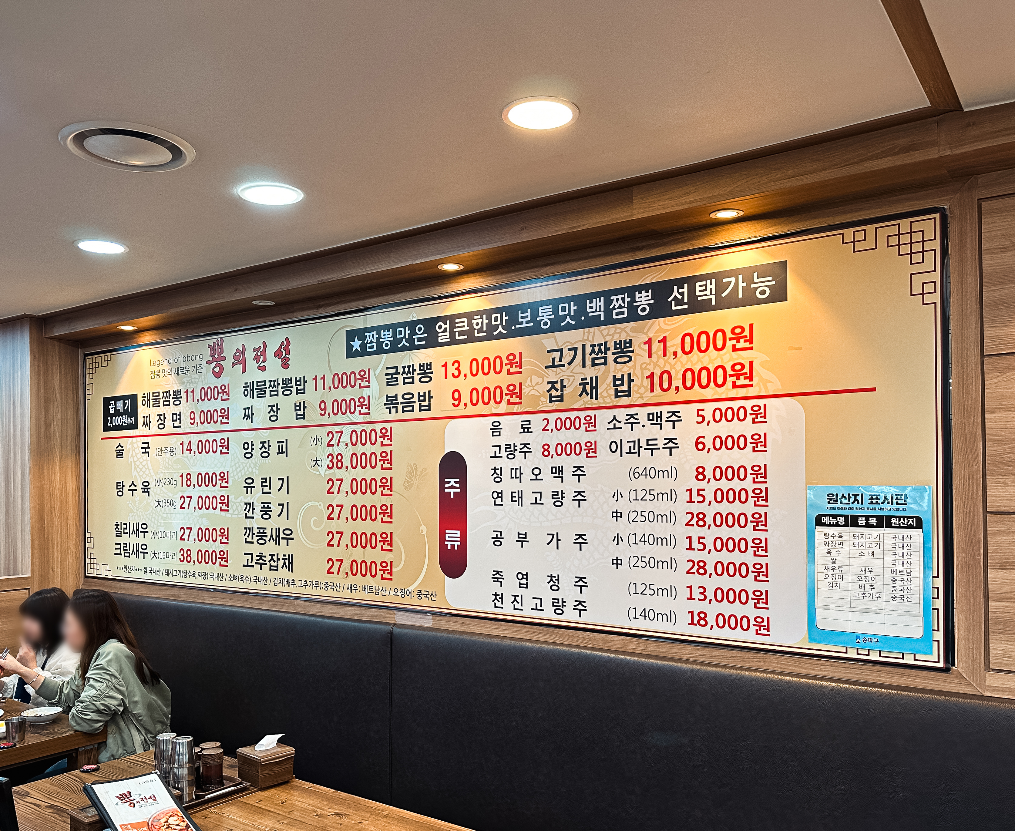 뿅의전설의 메뉴는 해물짬뽕, 해물짬뽕밥, 굴짬뽕, 고기짬뽕, 짜장면, 짜장밥, 볶음밥, 잡채밥, 술국, 탕수육, 칠리새우, 크림새우, 양장피, 유린기, 깐풍기, 깐풍새우, 고추잡채 등이 있었습니다. 저는 해물짬뽕을 주문했습니다.