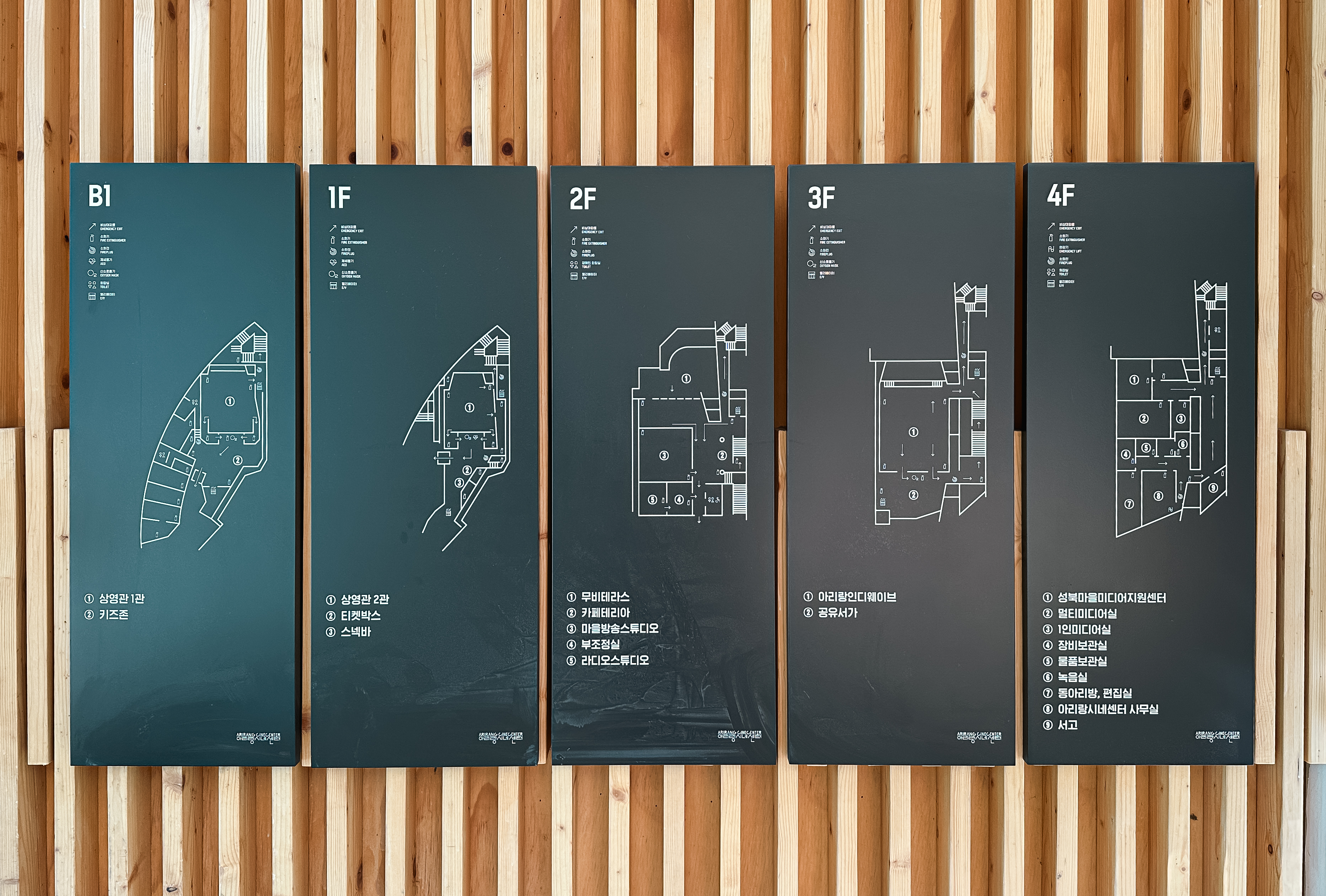 아리랑시네센터 층별 안내도를 보면 지하1층에는 상영관 1관, 키즈존, 1층에는 상영관 2관, 티켓박스, 스낵바, 2층에는 무비테라스, 카페테리아, 마을방송스튜디오, 부조정실, 라디오스튜디오, 3층에는 아리랑인디웨이브, 공유서가, 4층에는 성북마을미디어지원센터, 멀티미디어실, 1인미디어실, 장비보관실, 물품보관실, 녹음실, 동아리방・편집실, 아리랑시네센터사무실, 서고가 있었습니다.