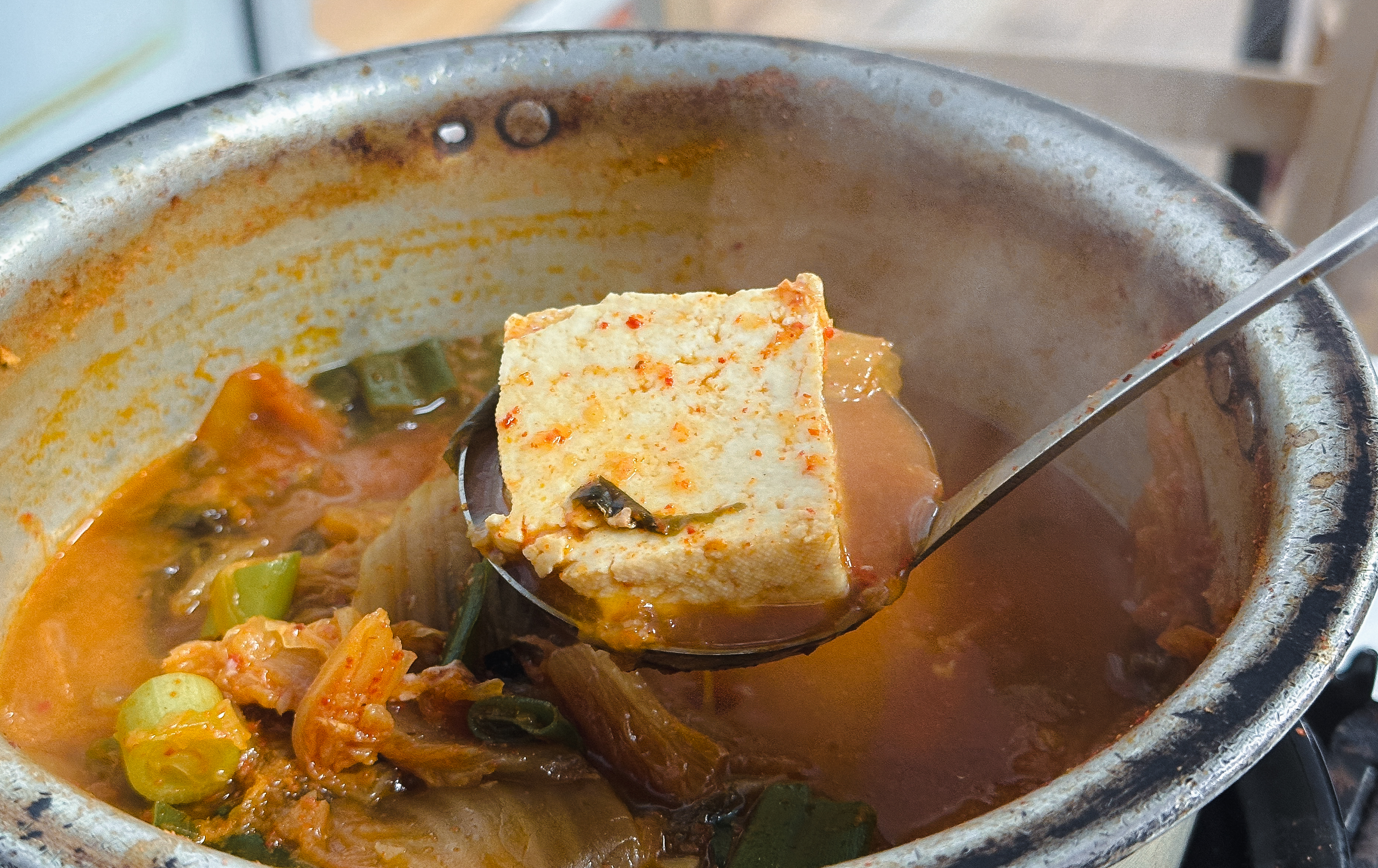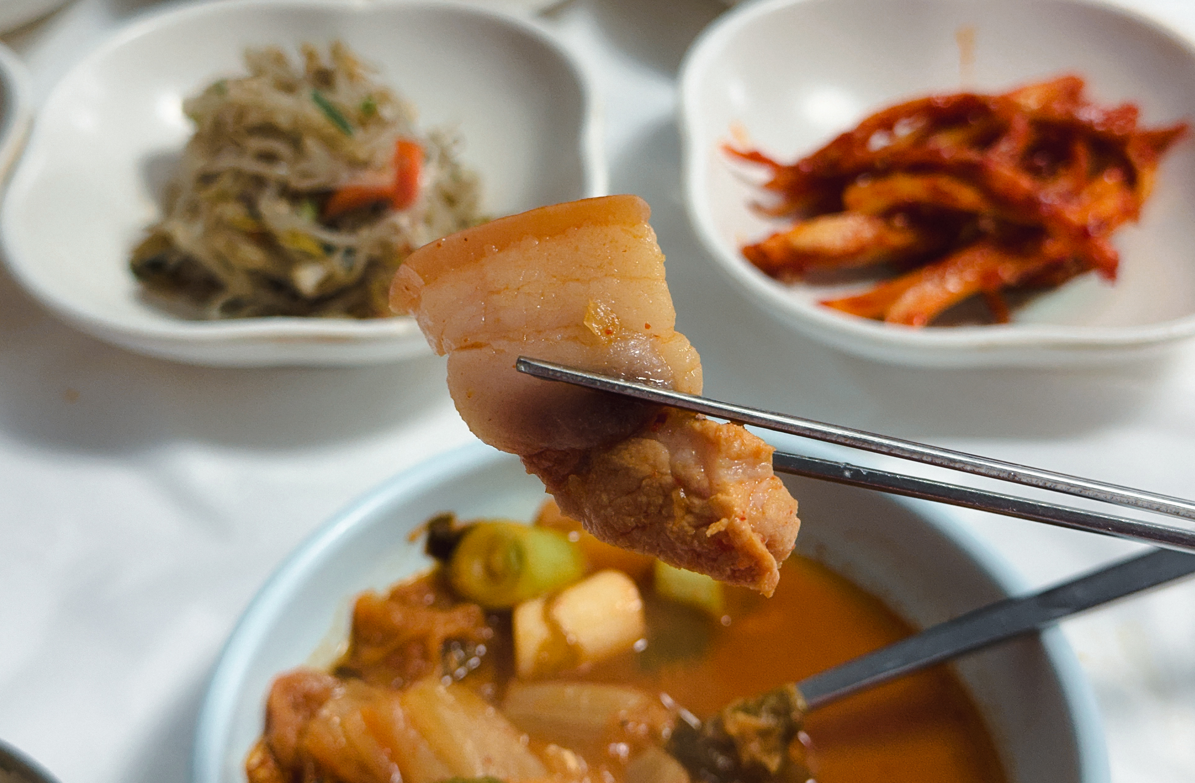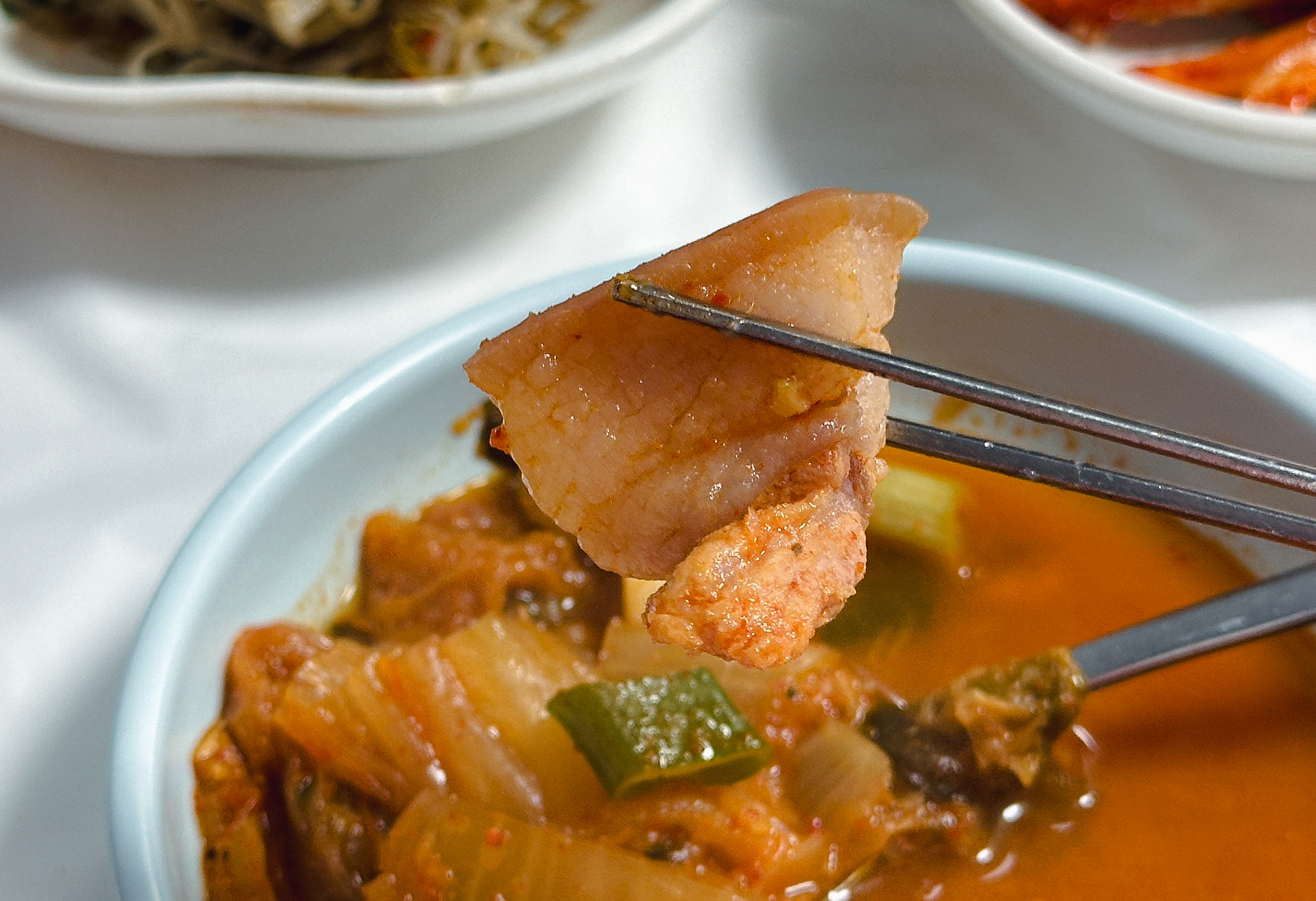 삼거리식당의 돼지비계찌개는 아마 예상하였겠지만, 김치찌개라고 보시면 될 것 같습니다. 살코기보다는 비계가 많이 포함된 고기가 들어있는 찌개였는데, 돼지비계찌개라 해서 비계만 있는 것은 아니었고, 쫄깃한 부분의 돼지 껍데기 부위가 포함되어 식감도 좋았고, 국물에 돼지기름이 잘 녹아들어 더 고소하고 부드러운 맛이 있었습니다.