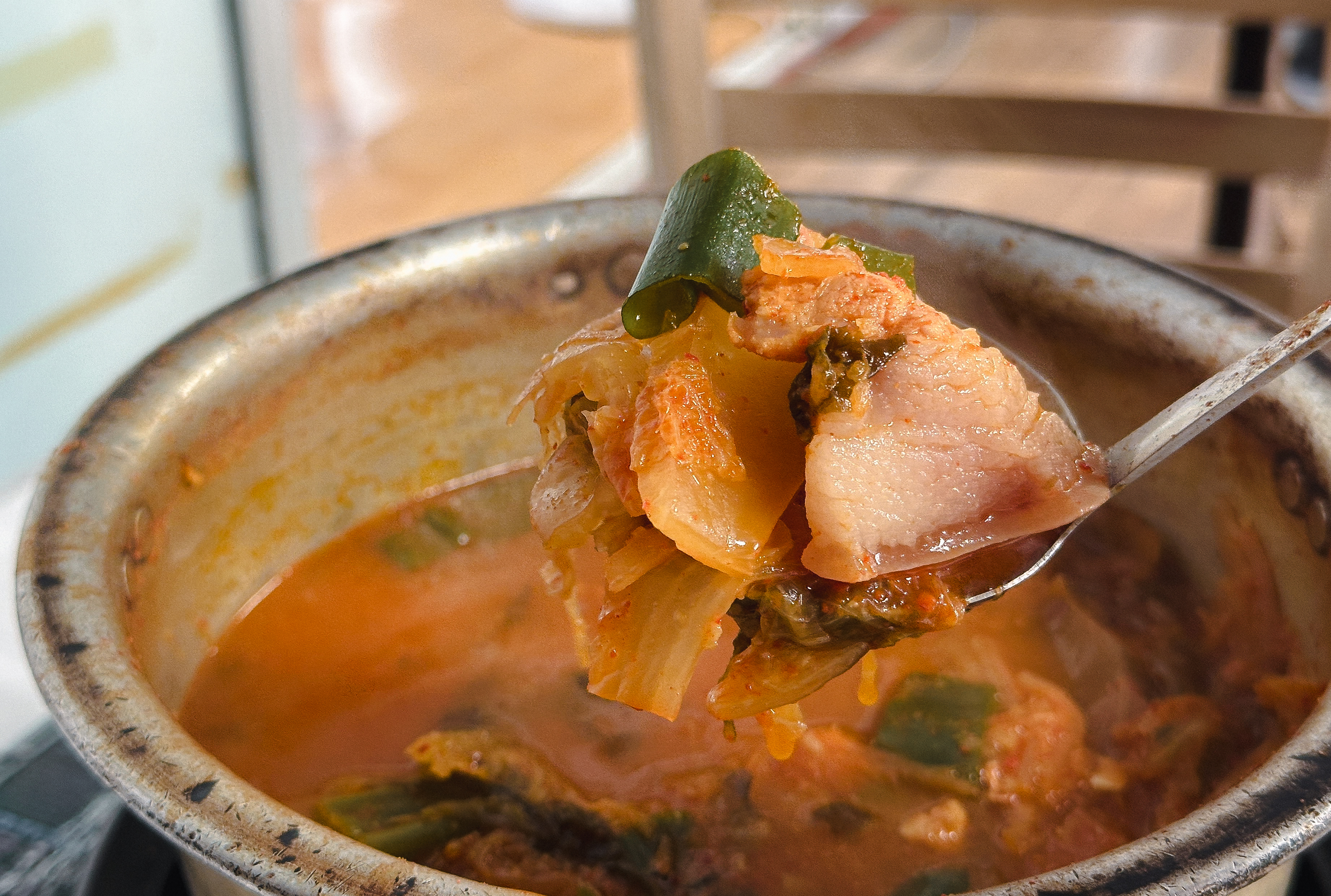김치도 잘 익었고 고기와 너무 잘 어울렸습니다. 솔직히 요즘 돼지비계로 논란이 있어서 제가 소개하고 있는 이 가게가 피해를 입지 않을까 걱정이 되기는 하는데, 저는 분명히 말씀드리지만 살코기도 들어있고, 돼지의 껍데기 부위가 포함되어 쫄깃한 식감도 있었고 맛도 좋았습니다. 식사 중에도 손님들이 꾸준히 방문하고 있었는데, 가게의 허름해 보이는 분위기에도 불구하고 제가 식사한 이후에도 손님들이 4~5 팀 이상 더 들어오셨습니다.