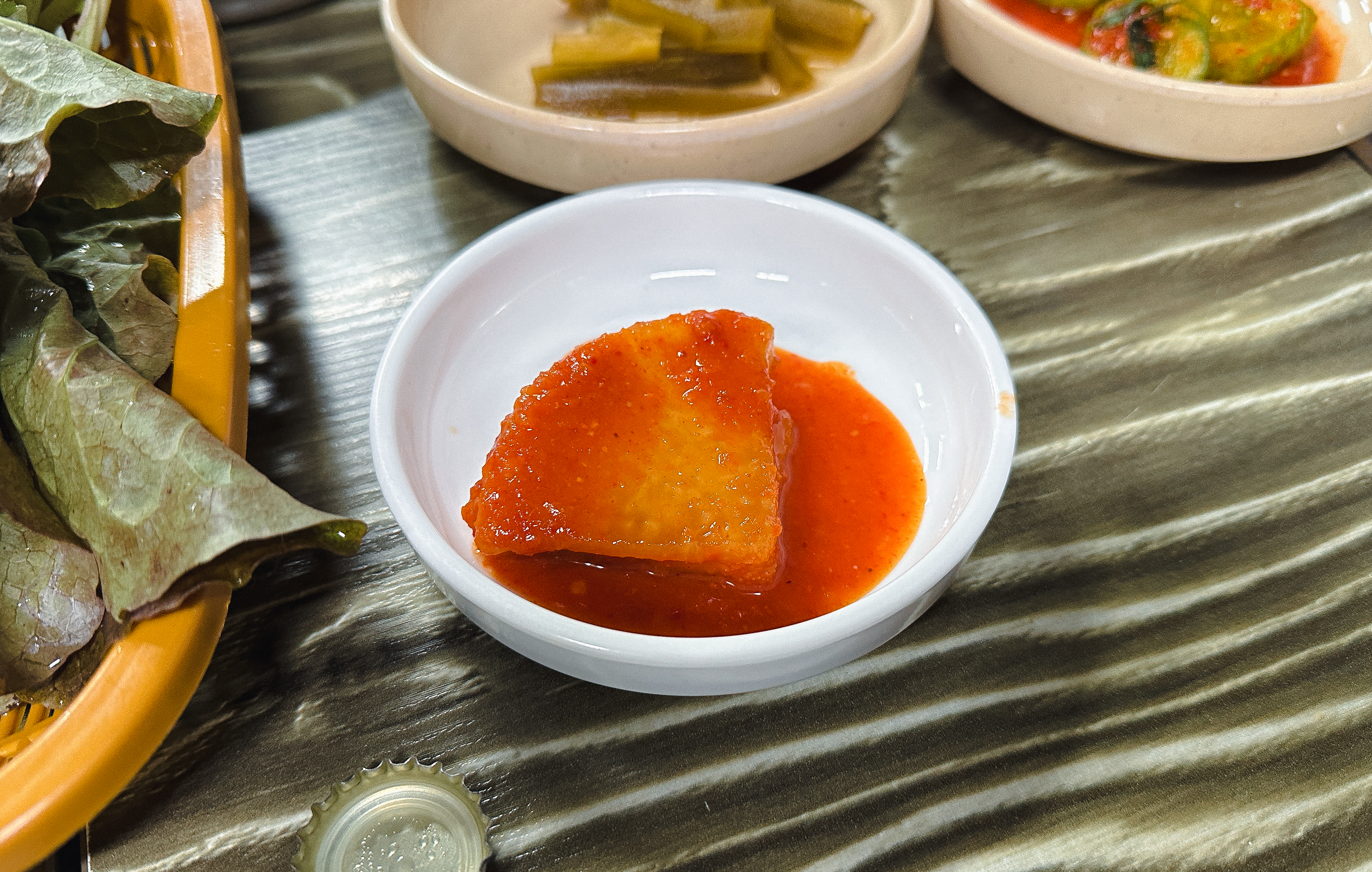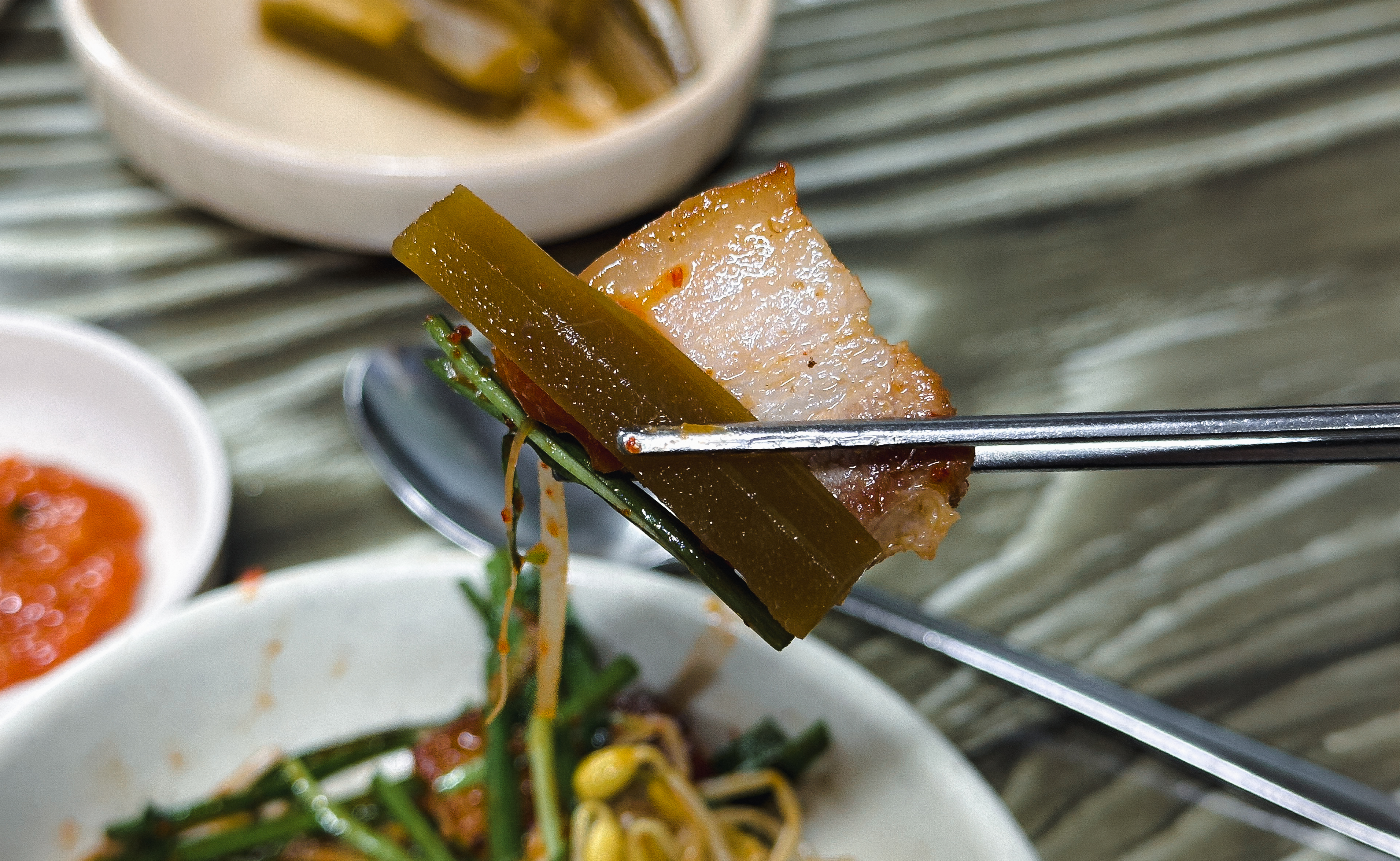 고기는 돼지의 껍데기 부위와 함께 섞인 부분으로 적당히 쫄깃하면서도 기름기가 있는 것이, 고소하면서도 맛있었습니다. 앞서 소개해드린 부추무침이나 궁채나물과도 곁들이니 느끼하지 않고 맛있었고요.