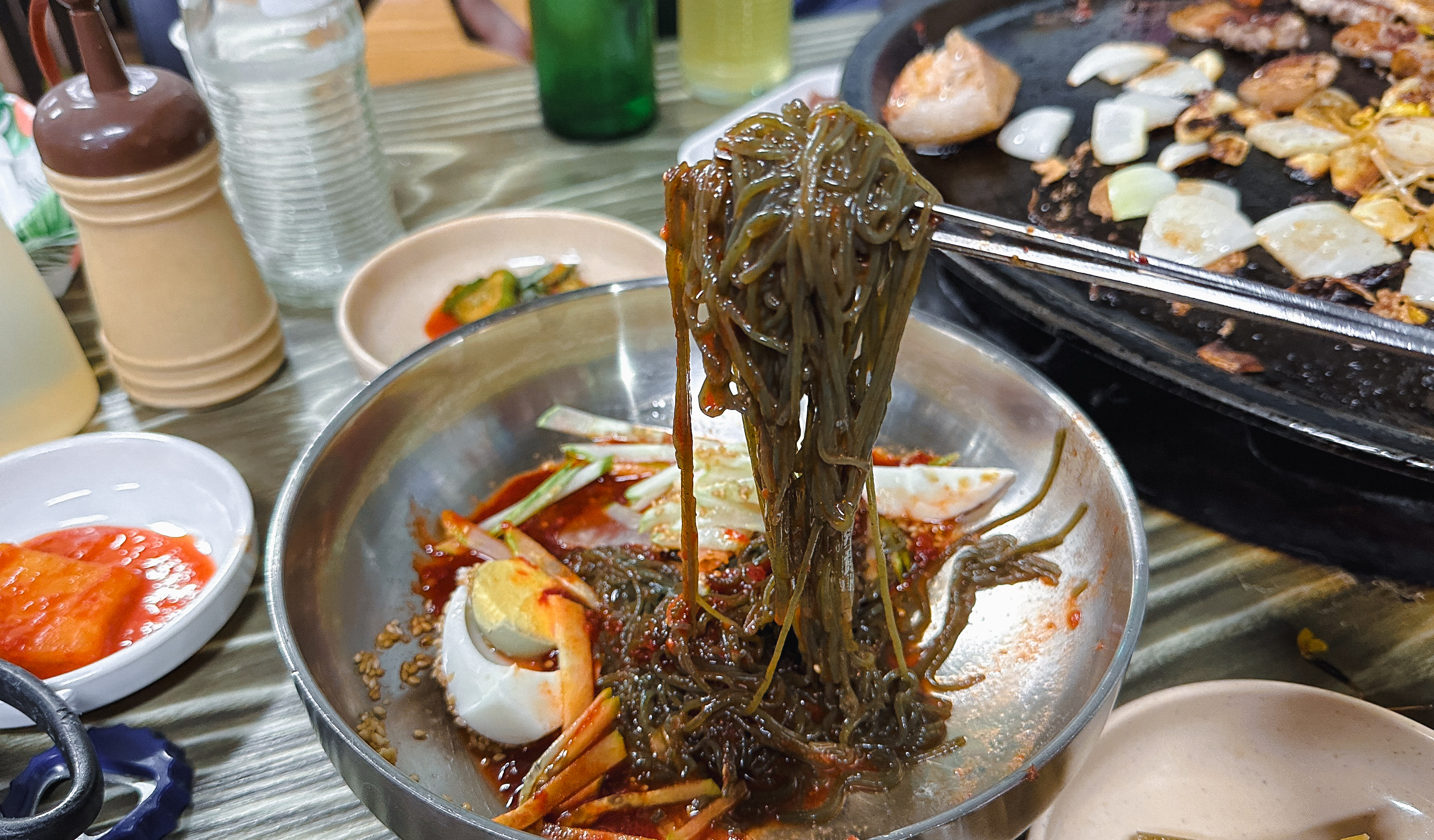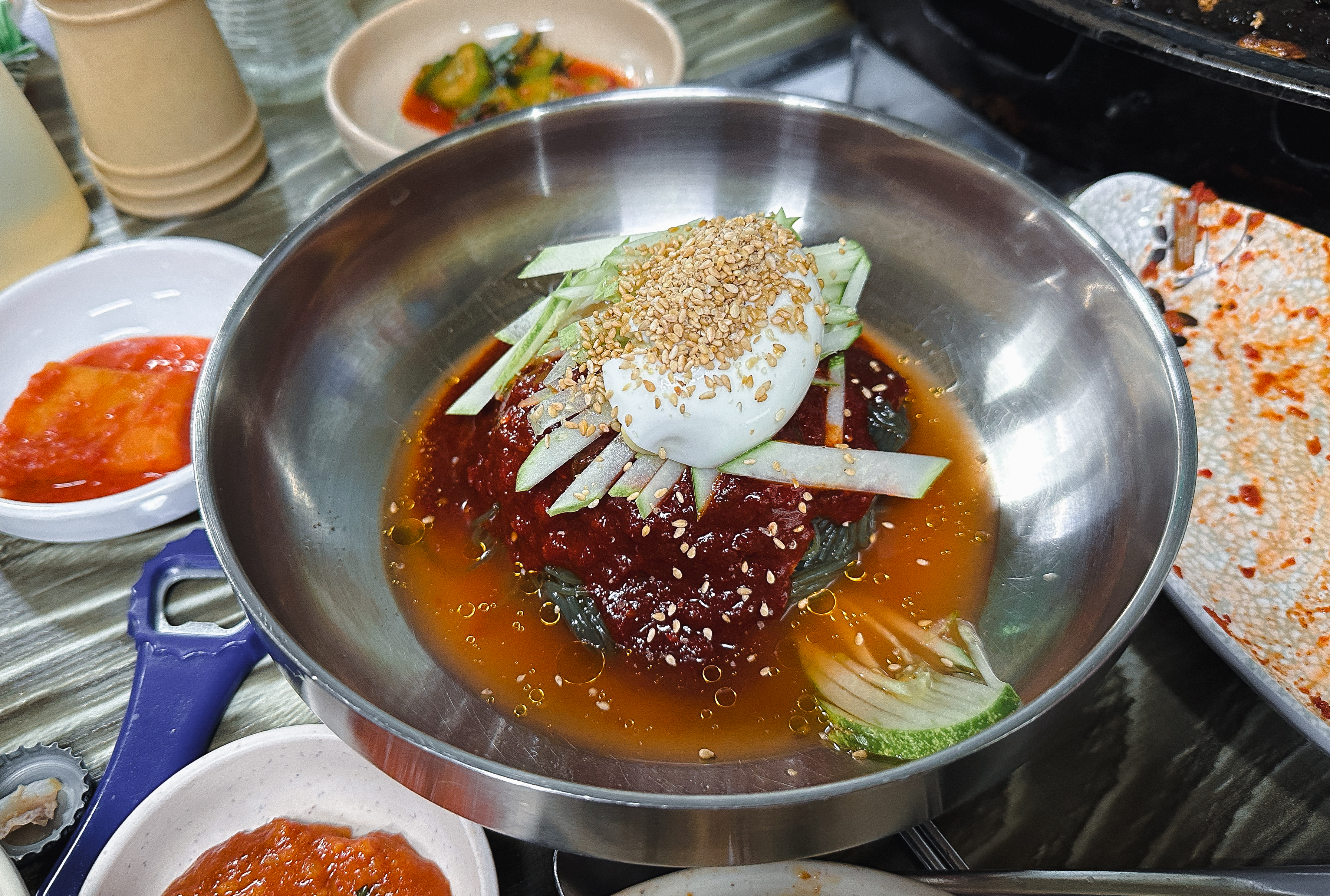 이후에 곰취냉면도 먹어보았습니다. 사실 특별한 맛을 기대하고 주문한 메뉴였는데, 생각보다 크게 특별한 맛이 있지는 않았고 그냥 부드러운 식감의 냉면이었습니다.
