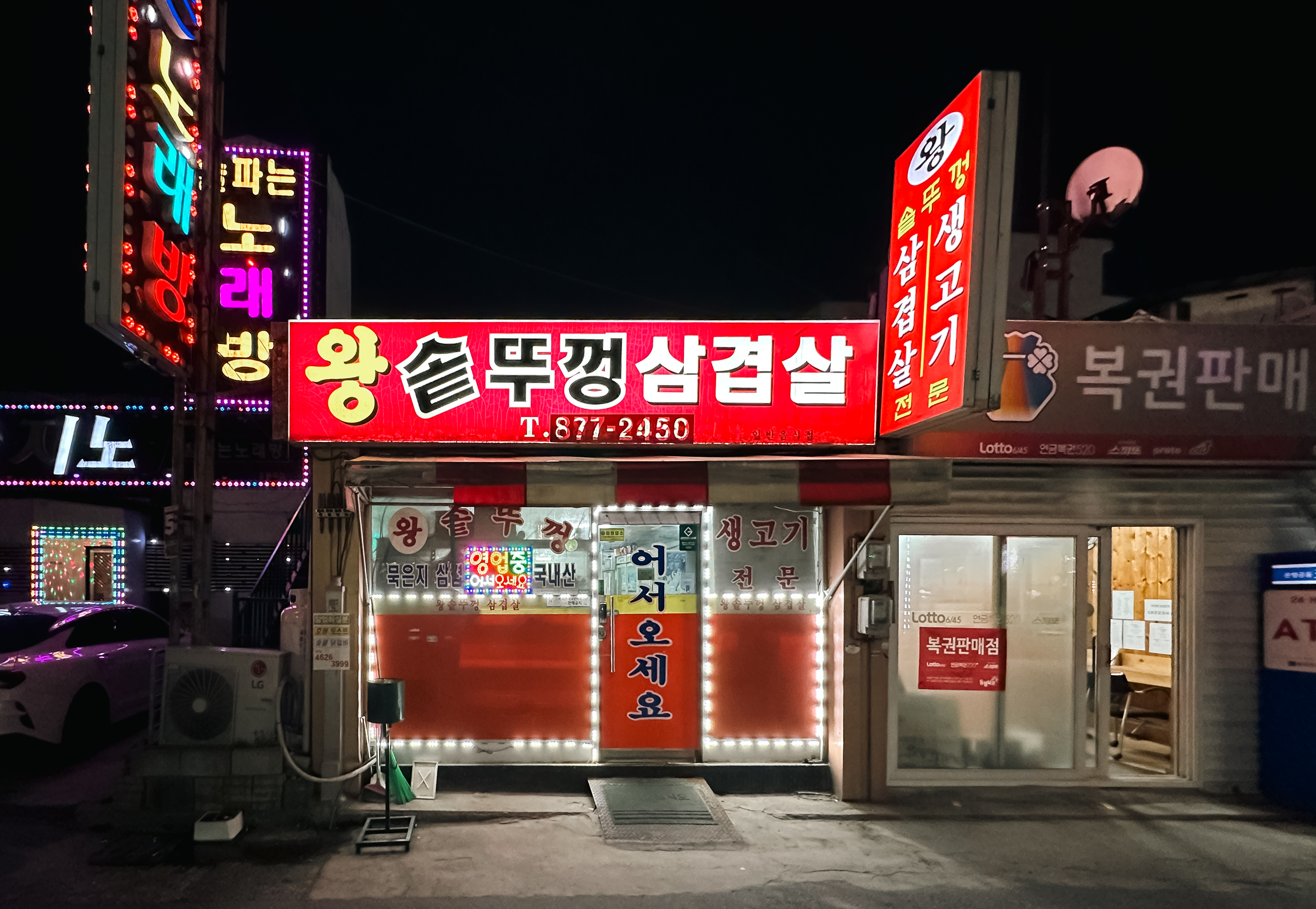 왕솥뚜껑삼겹살은 충북 음성군 대소면 오산리 122-6 에 위치해 있었습니다. 음성군의 번화가(?)에 위치한 이 가게는 작은 규모의 식당이었지만, 인근에 거주하거나 근무하는 분들이 많이 찾는 듯했고, 가게 인근 커다란 공터가 있어서 주차도 편리했습니다. 가게에는 연통형 후드가 아닌 화장실(?)에서 볼 법한 환기장치를 사용하고 있었는데, 생각보다 출력이 좋아서 그런지 고기 굽는 내내 냄새가 덜나고 고깃집임에도 공기가 탁하지 않았습니다.