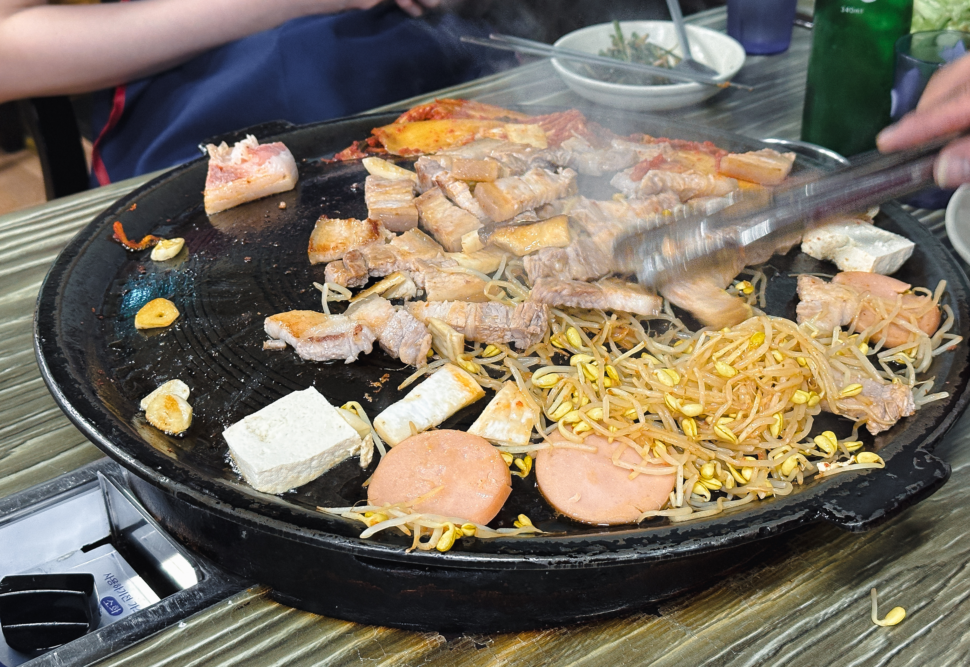 먹다가 중간에 찍는 바람에 사진이 이쁘게 나오지는 않았지만, 가게 이름처럼 커다란 솥뚜껑에 삼겹살을 구워 먹을 수 있었고, 삼겹살은 숯불에 구워 먹듯이 두툼한 두께가 아니라 적당히 식감이 있는 두께의 삼겹살이었고, 불판에 같이 구울 수 있도록 분홍 소시지와 두부 콩나물, 김치등이 함께 제공되었습니다.
