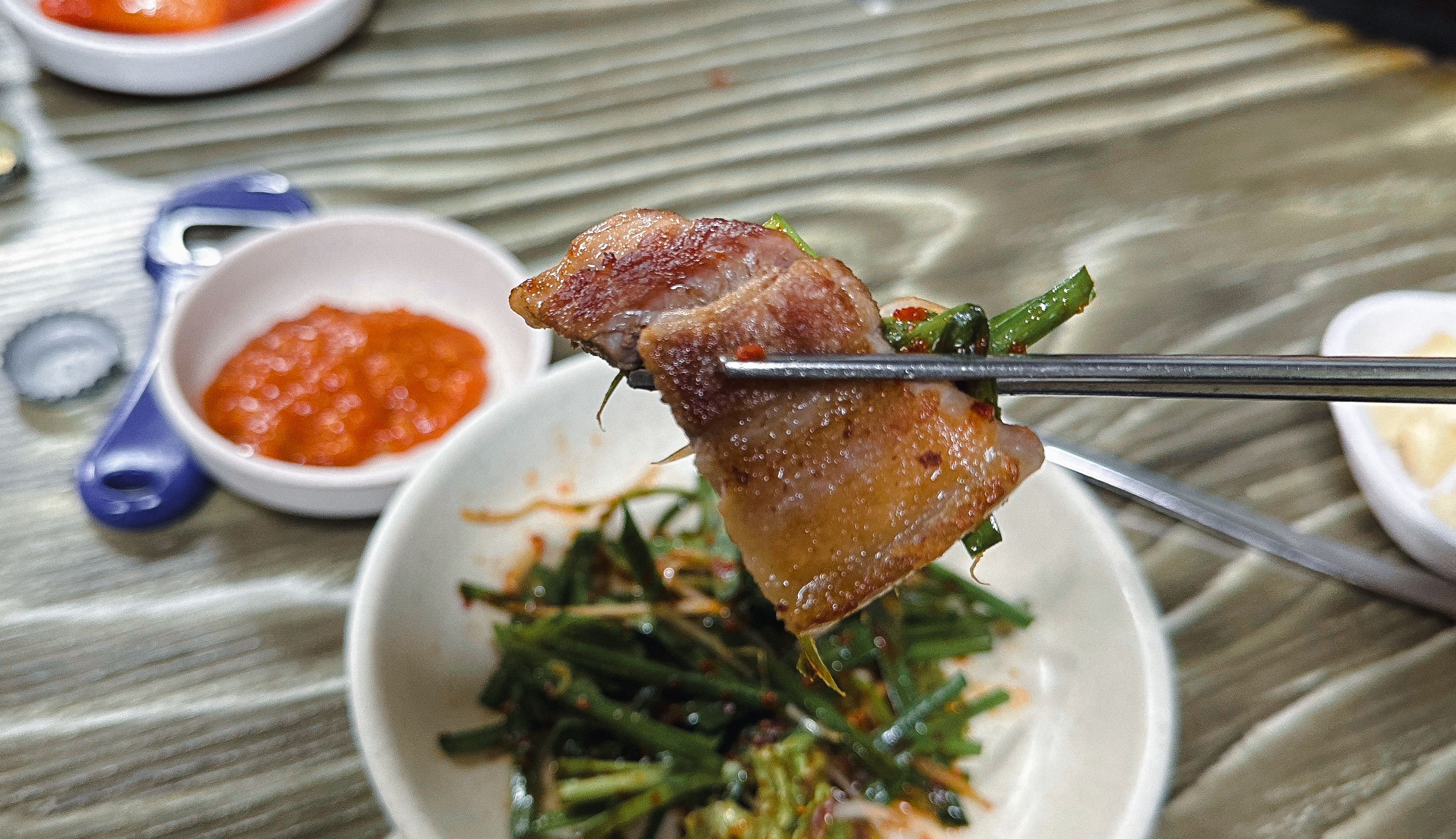 고기는 돼지의 껍데기 부위와 함께 섞인 부분으로 적당히 쫄깃하면서도 기름기가 있는 것이, 고소하면서도 맛있었습니다. 앞서 소개해드린 부추무침이나 궁채나물과도 곁들이니 느끼하지 않고 맛있었고요.