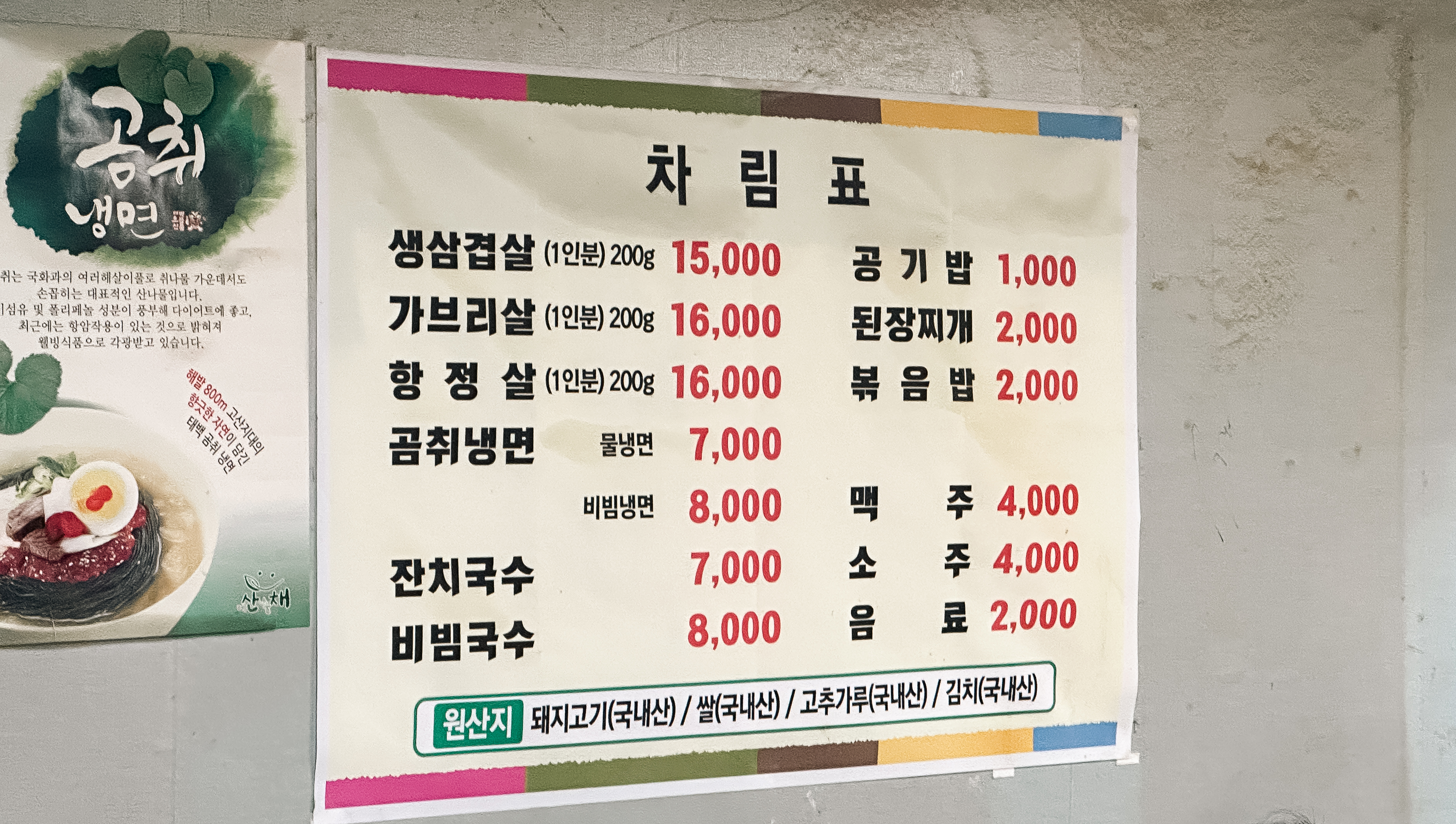 음성 왕솥뚜껑삼겹살의 메뉴는 위와 같습니다. 생삼겹살, 가브리살, 항정살, 곰취냉면, 잔치국수, 비빔국수, 된장찌개, 볶음밥 등이 있었고, 원산지는 돼지고기, 쌀, 고춧가루, 김치까지 모두 국내산이라 적혀있었습니다. 생삼겹살 200g 기준 가격은 15,000원 이었습니다.
