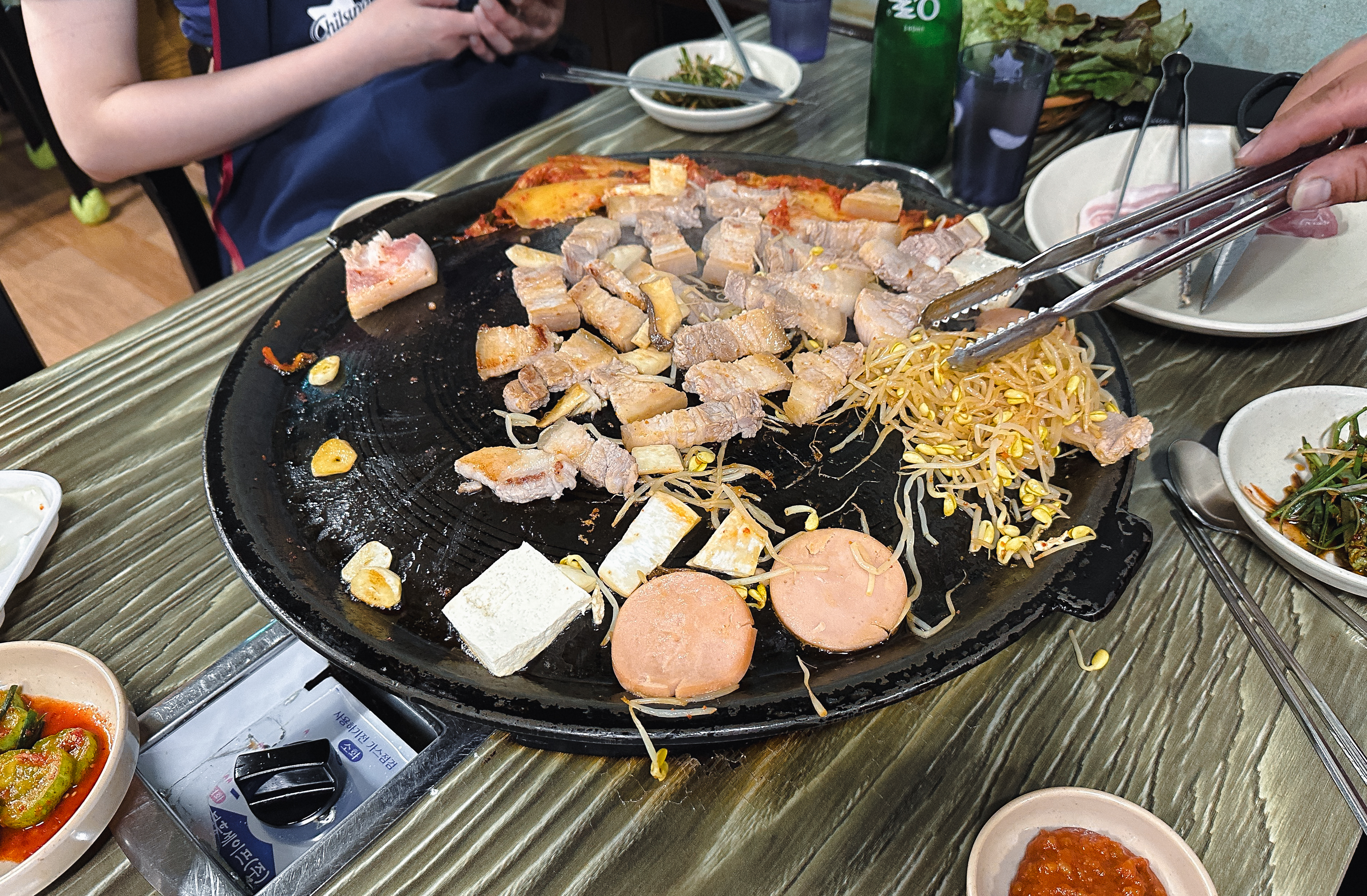 먹다가 중간에 찍는 바람에 사진이 이쁘게 나오지는 않았지만, 가게 이름처럼 커다란 솥뚜껑에 삼겹살을 구워 먹을 수 있었고, 삼겹살은 숯불에 구워 먹듯이 두툼한 두께가 아니라 적당히 식감이 있는 두께의 삼겹살이었고, 불판에 같이 구울 수 있도록 분홍 소시지와 두부 콩나물, 김치등이 함께 제공되었습니다.
