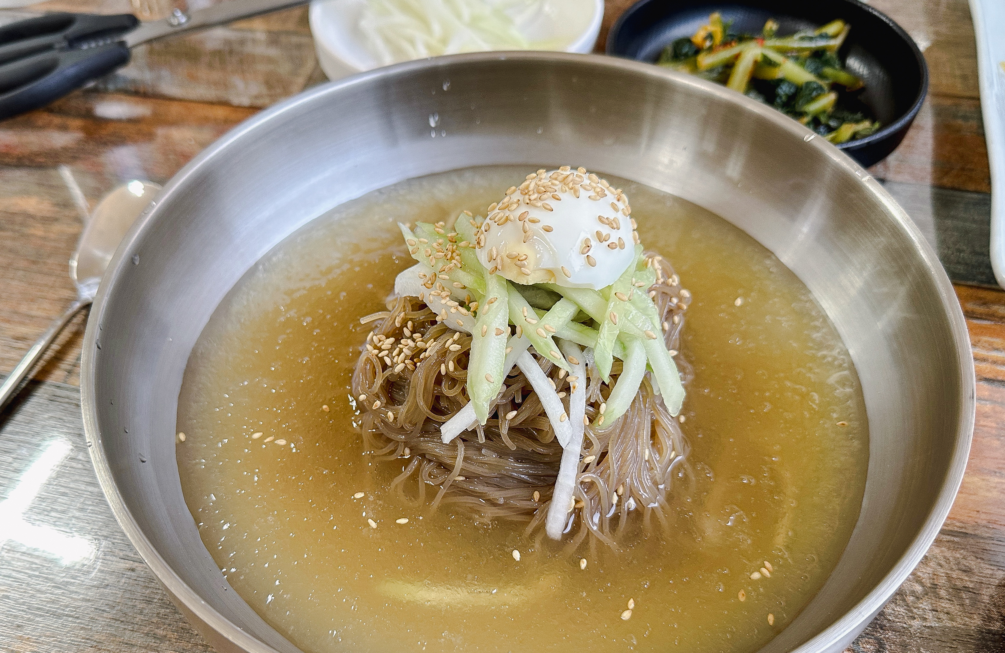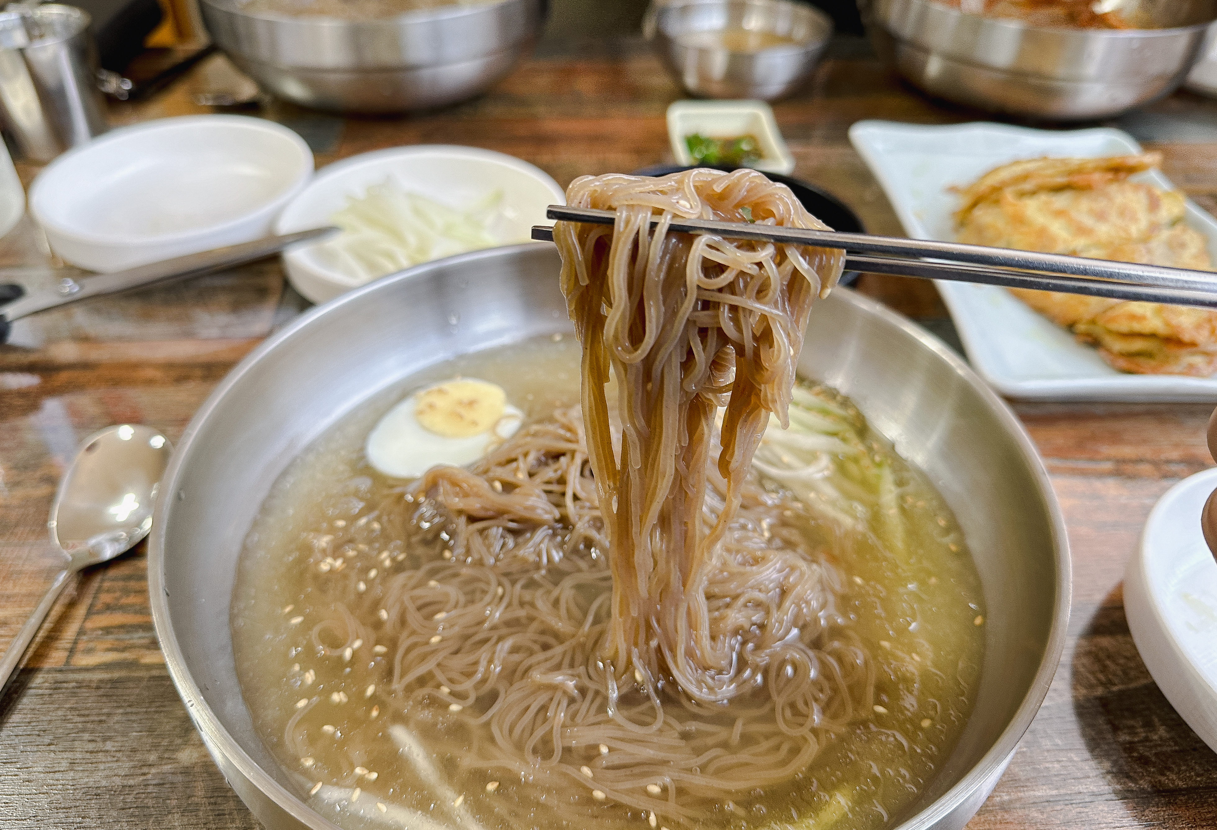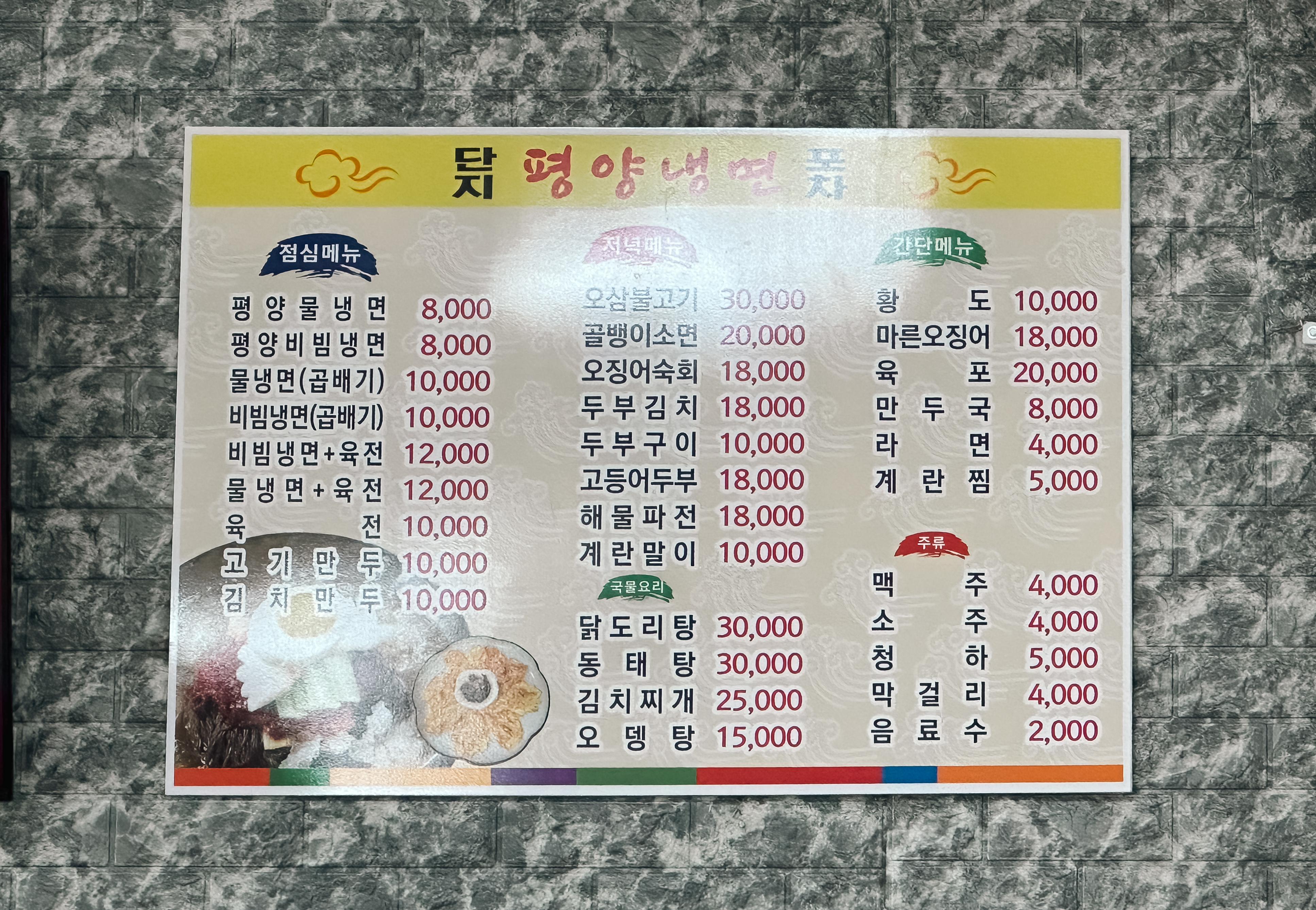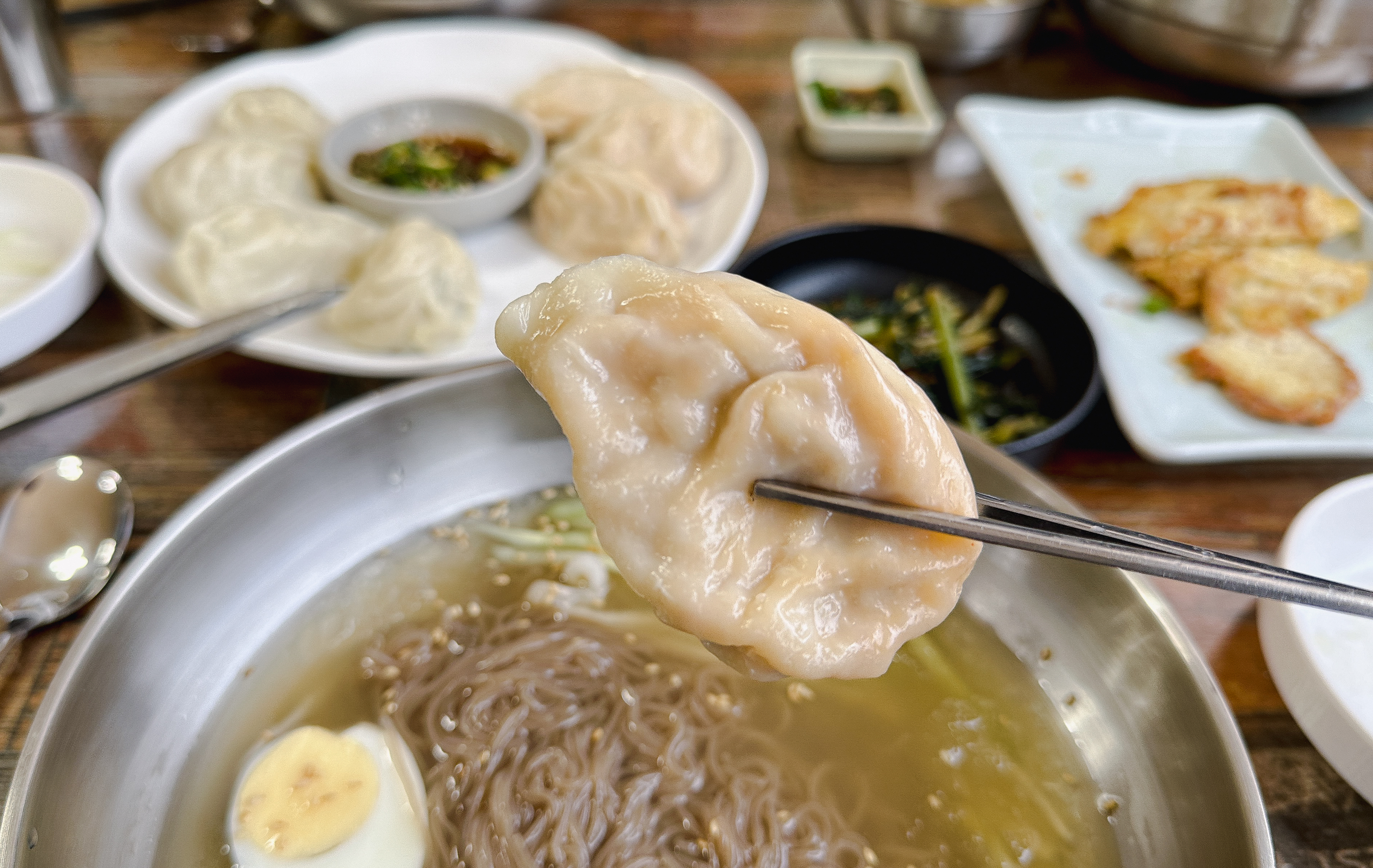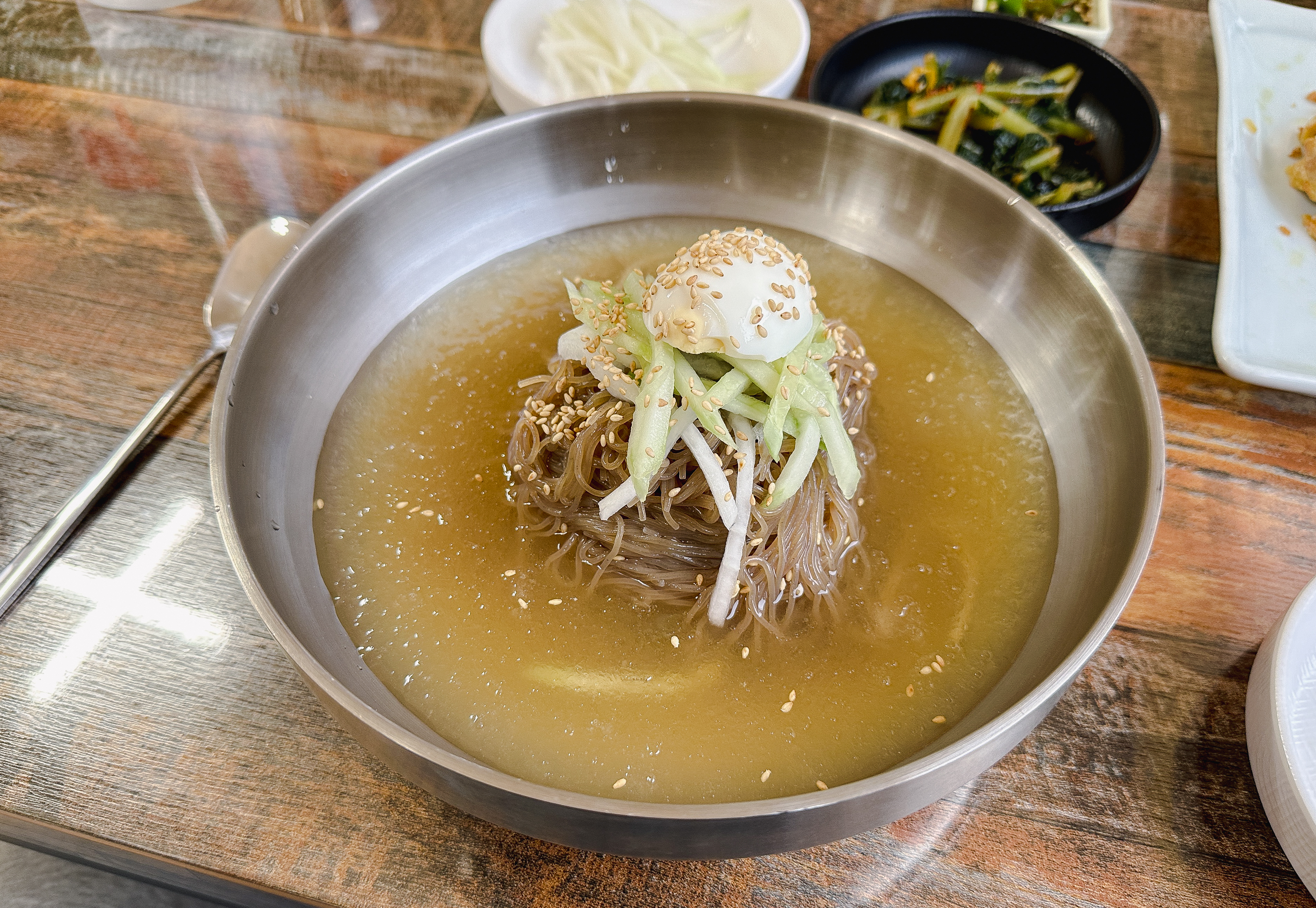 평양냉면이 8,000원이라니 가격으로 보면 꽤 가성비 좋은 것 같은데, 육전과 함께 나오는 세트구성의 메뉴가 일반 냉면인지 평양냉면인지는 모르겠지만 평양냉면이라면 제가 아는 맛이랑 전혀 다르기 때문에 아쉬운 것 같고, 일반 냉면이라면 톡 쏘는 국물이 아닌 약간 연한 느낌의 국물이었습니다. 육전과 만두는 그래도 꽤 괜찮게 먹었는데 무난한 맛으로 드실 수는 있겠지만 적극 추천하기에는 조금 어려운 느낌의 가게였습니다.