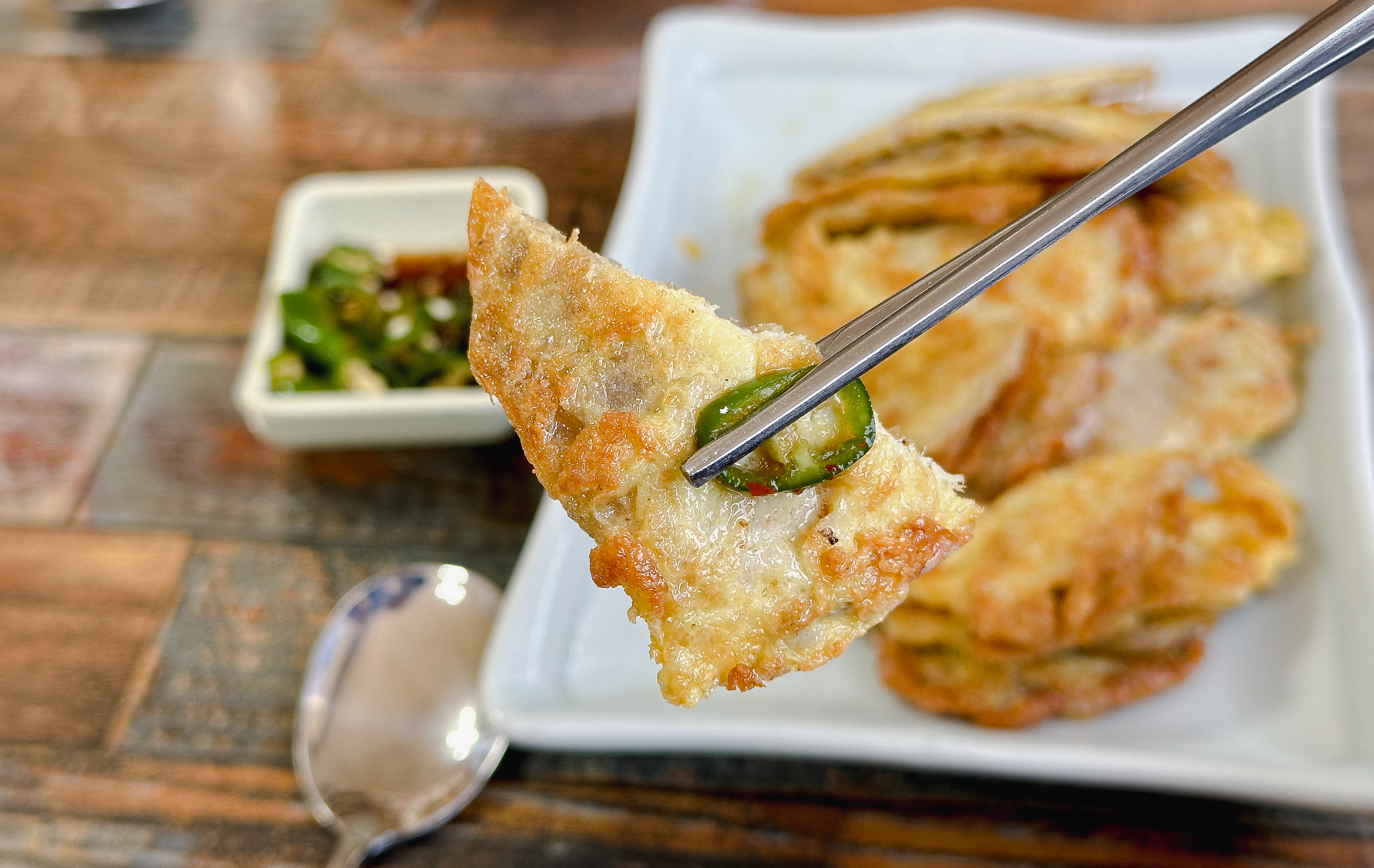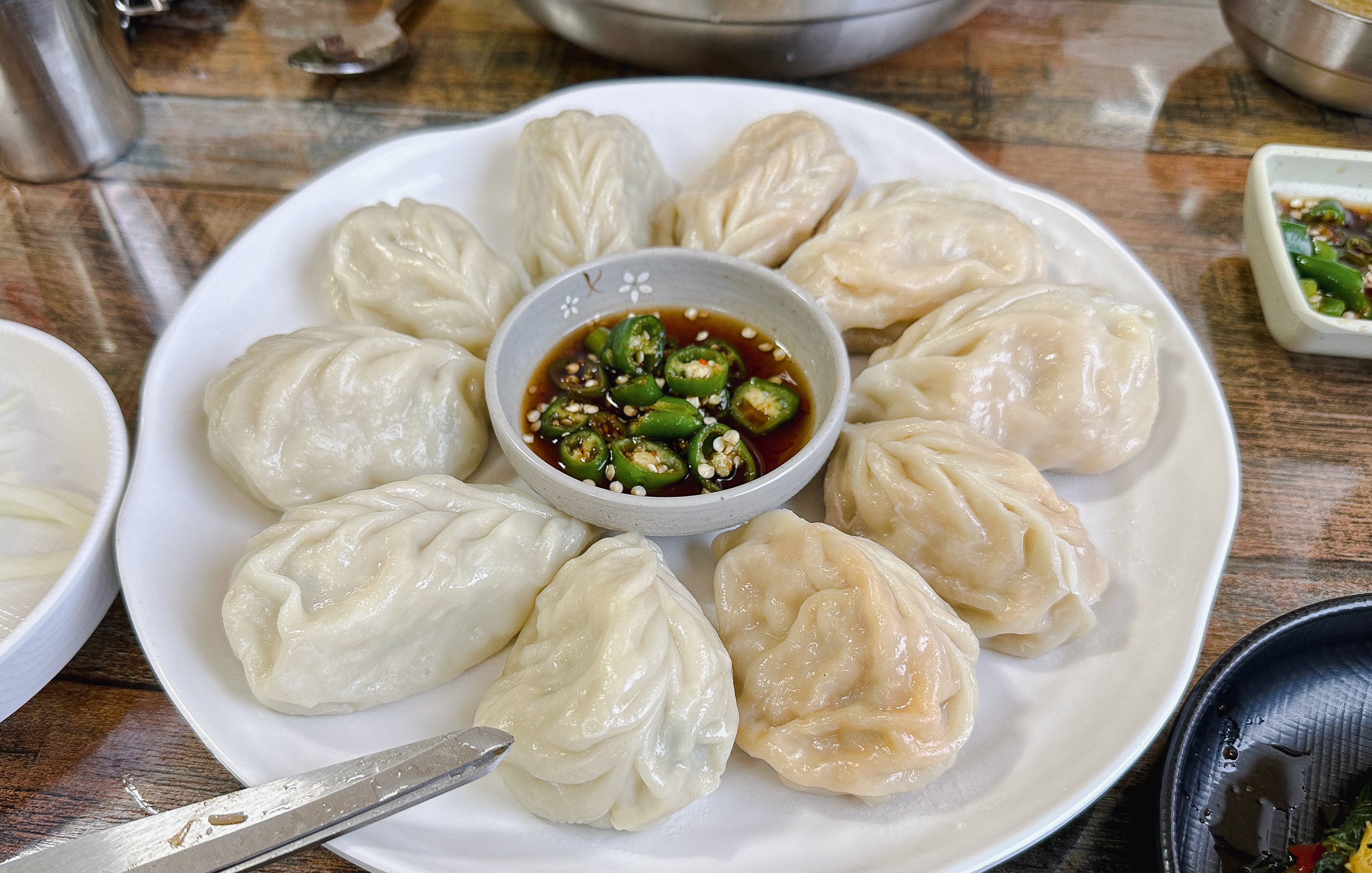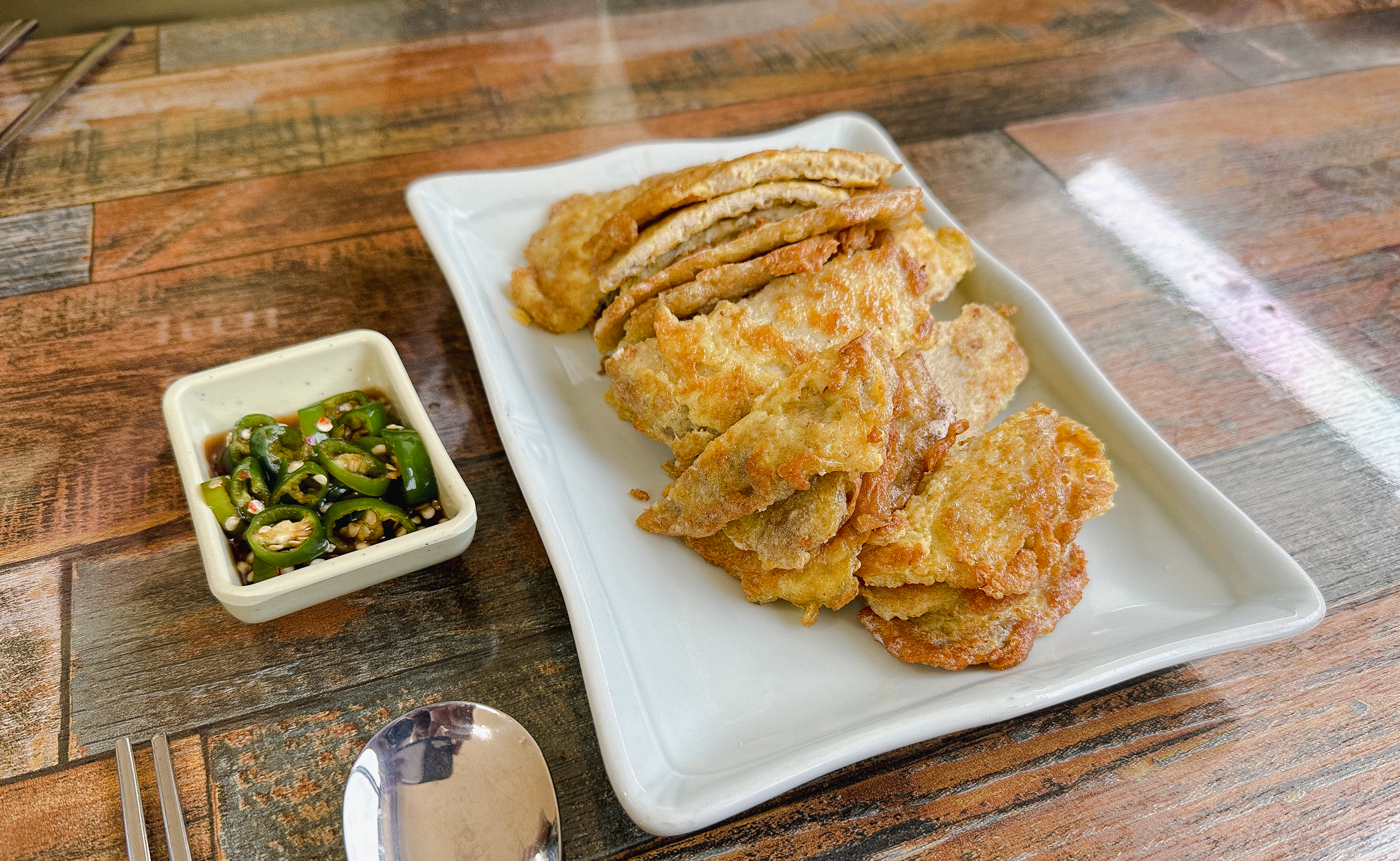 냉면이랑 같이 주문했던 육전인데, 단지평양냉면의 육전은 꽤 두툼한 고기를 사용해 식감도 좋았고 맛도 좋았습니다. 그밖에 만두도 적당히 심심한 맛이었고 맛있더라고요. 육전은 같이 내어주신 간장소스와 청양고추를 같이 곁들여서 드시는 것을 추천드리고요. 김치만두 같은 경우에는 약간 매운맛이 강했습니다.