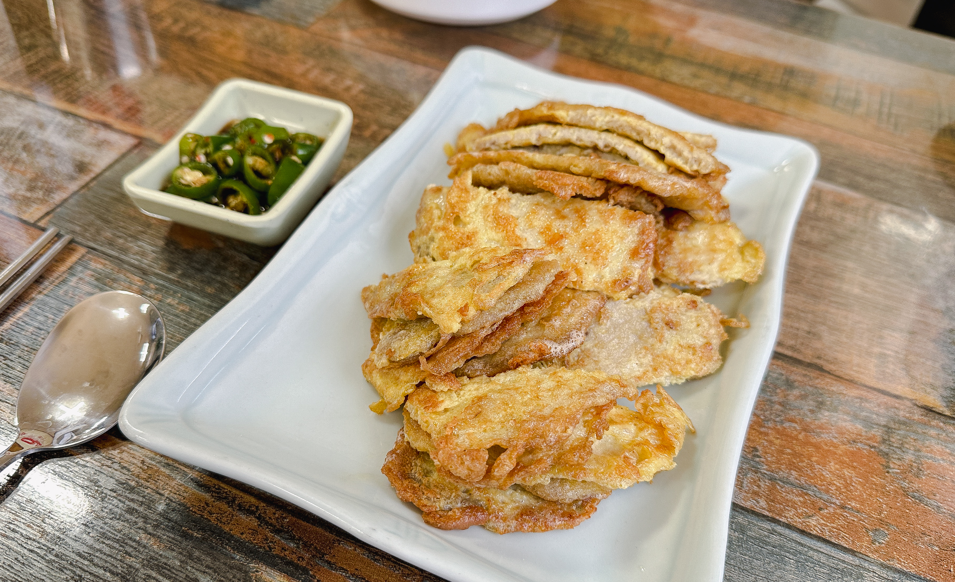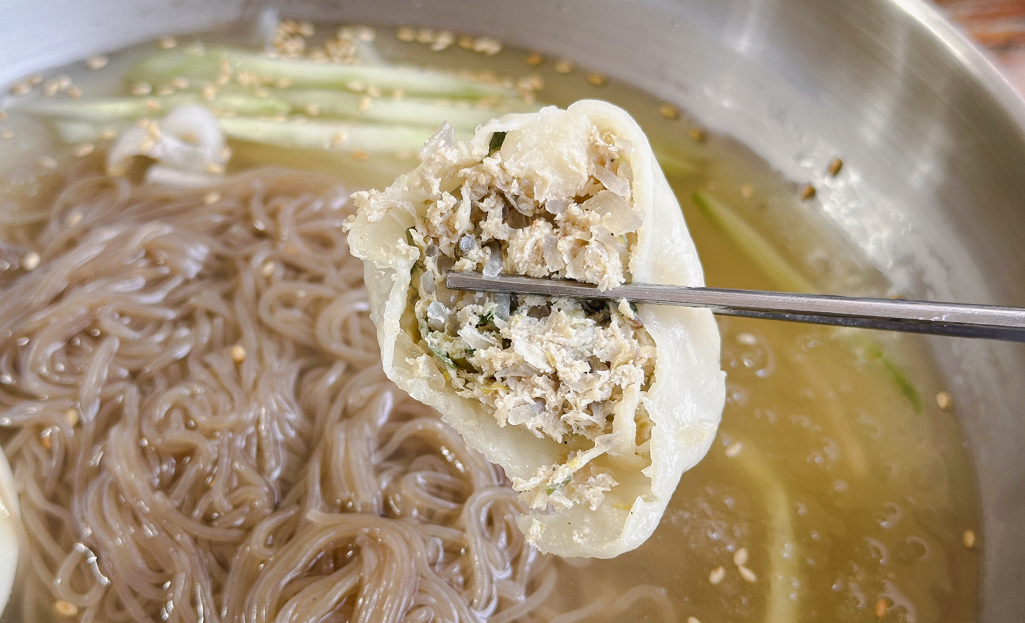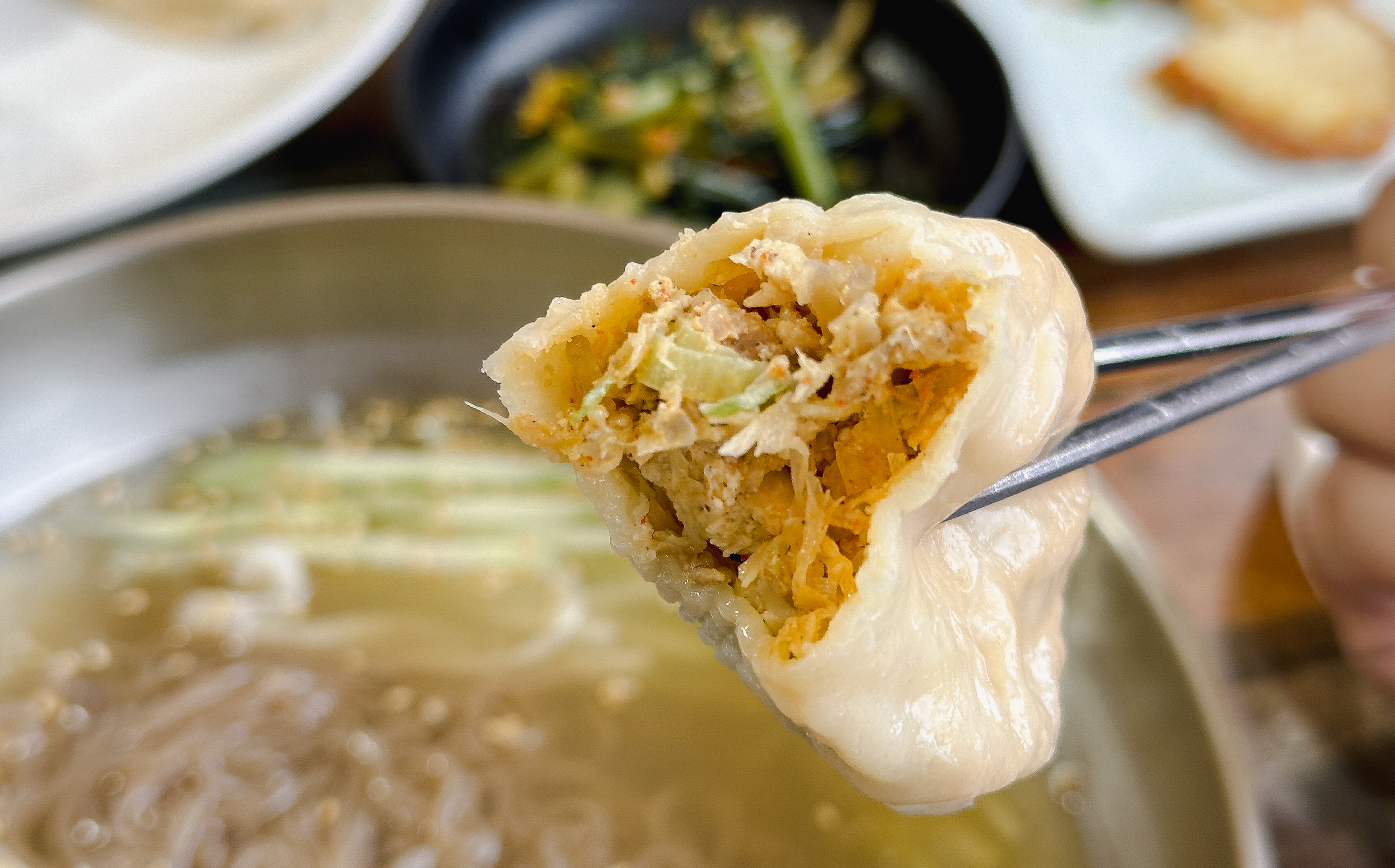 냉면이랑 같이 주문했던 육전인데, 단지평양냉면의 육전은 꽤 두툼한 고기를 사용해 식감도 좋았고 맛도 좋았습니다. 그밖에 만두도 적당히 심심한 맛이었고 맛있더라고요. 육전은 같이 내어주신 간장소스와 청양고추를 같이 곁들여서 드시는 것을 추천드리고요. 김치만두 같은 경우에는 약간 매운맛이 강했습니다.