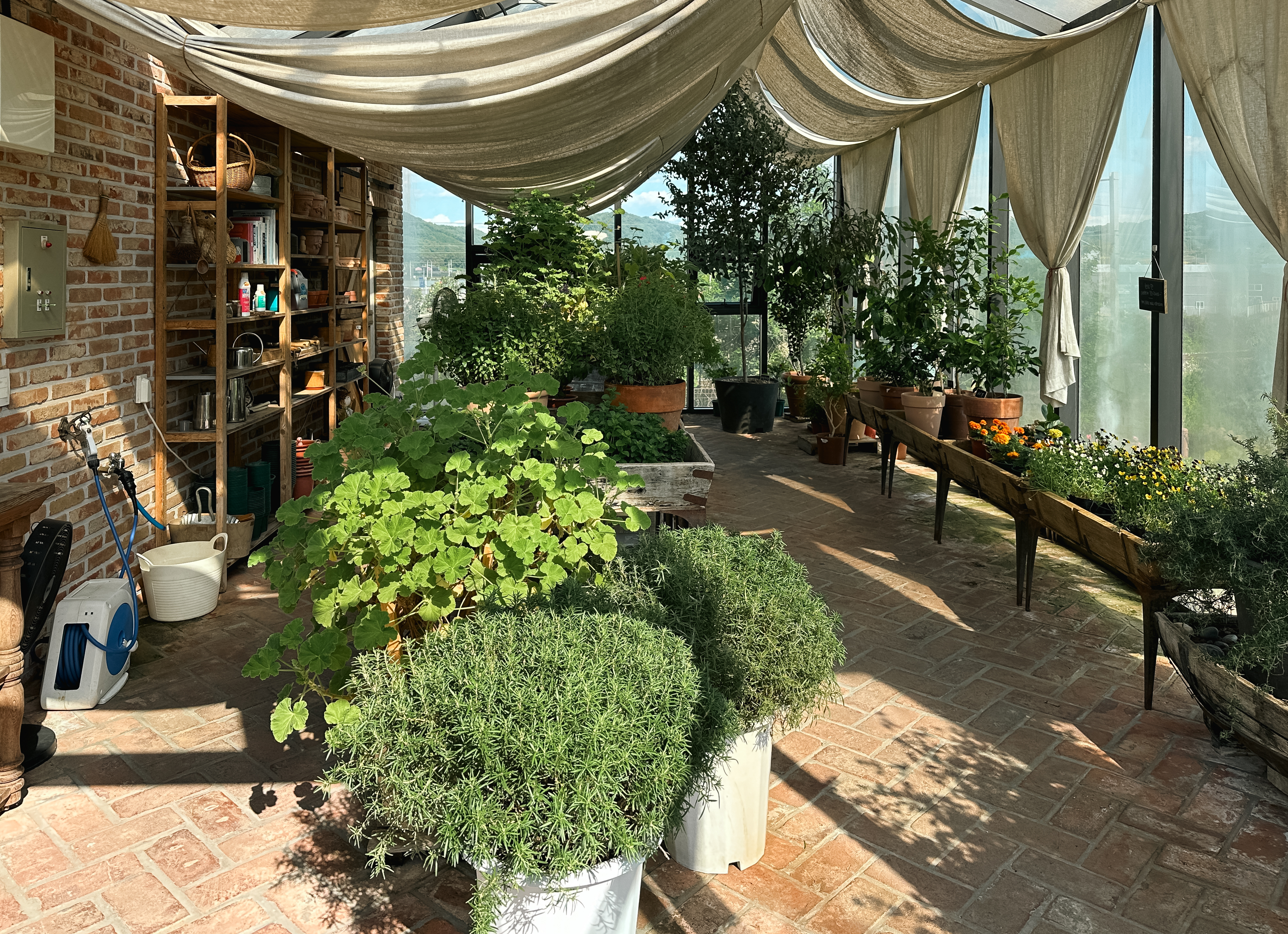 마지막으로 살펴볼 곳은 어린이베이커리와 먹는꽃허브하우스, 밀밭체험입니다. 뚜쥬루 빵돌마을을 돌아다니며 전체적으로 사진 찍기에 좋은 이쁜 장소들이 많았지만, 저는 제일 마음에 들었던 장소는 먹는꽃허브하우스였습니다. 조용하면서도 허브의 향이 은은하게 느껴지는 이 장소는 약간 더웠지만, 제가 나중에 집을 짓는다면 저런 공간 하나쯤 있었으면 좋겠다 싶은 장소였습니다.