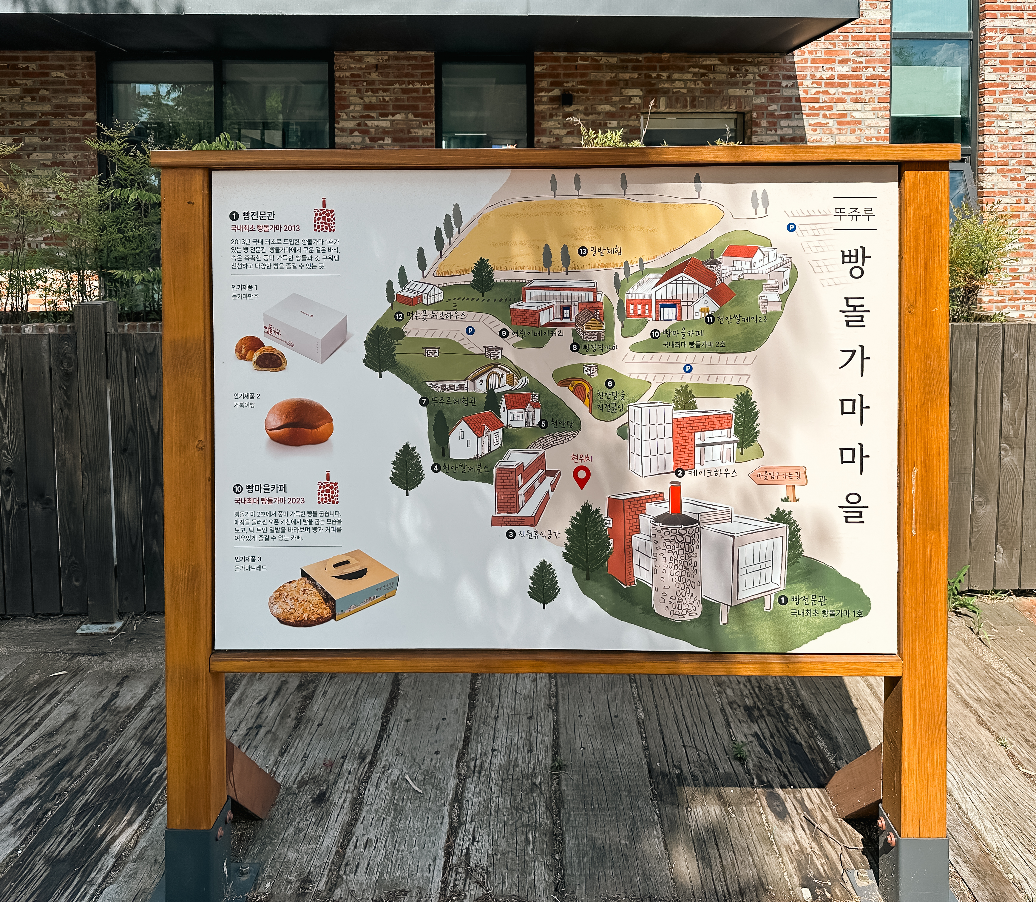 천안 뚜쥬루는 빵전문관, 케이크하우스, 천안쌀제분소, 천안당, 뚜쥬루체험관, 천안팥을직접끓임, 빵장작가마, 빵마을카페, 천안쌀케익23, 어린이베이커리, 먹는꽃허브하우스, 밀밭체험으로 구성되어 있었습니다.