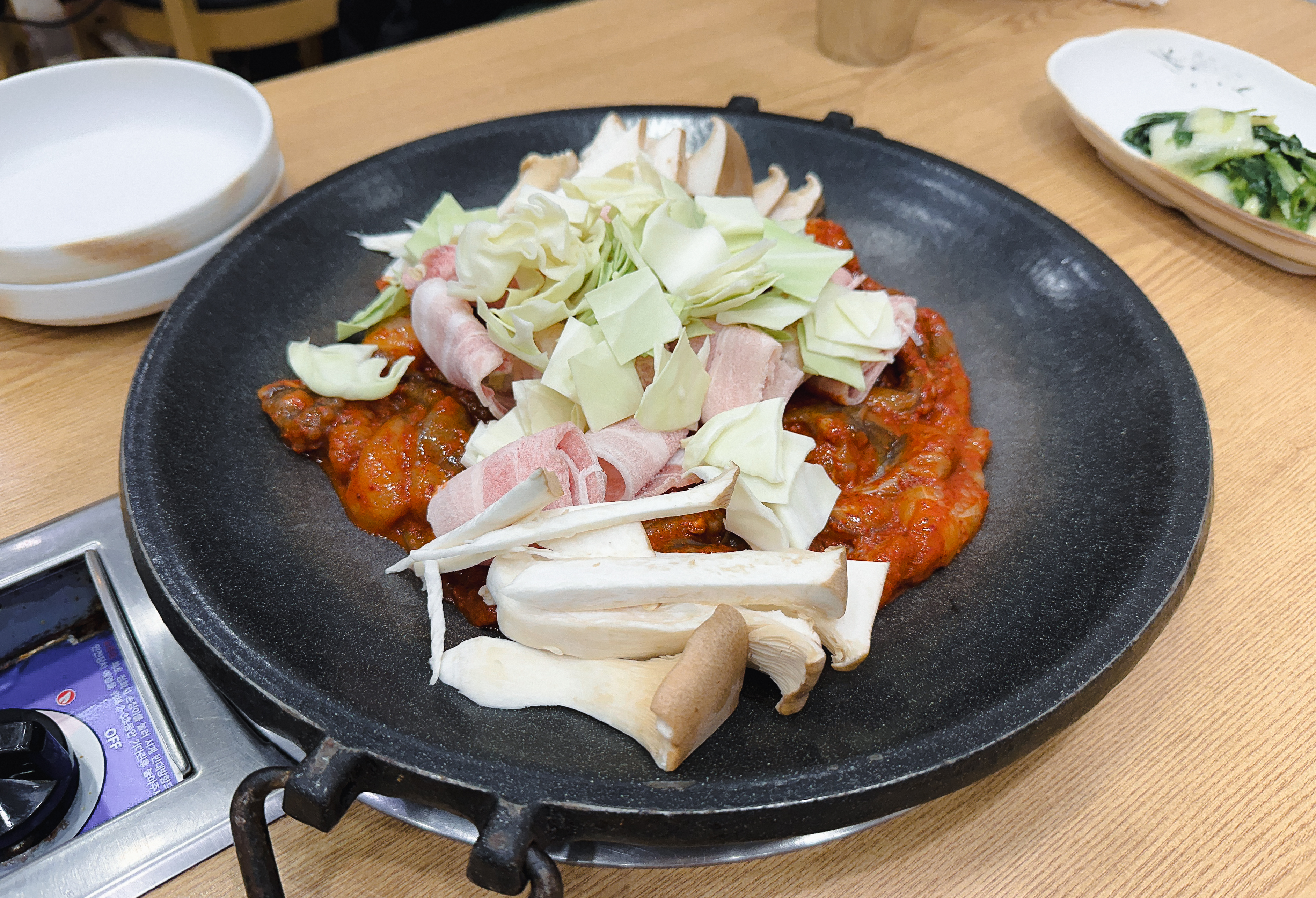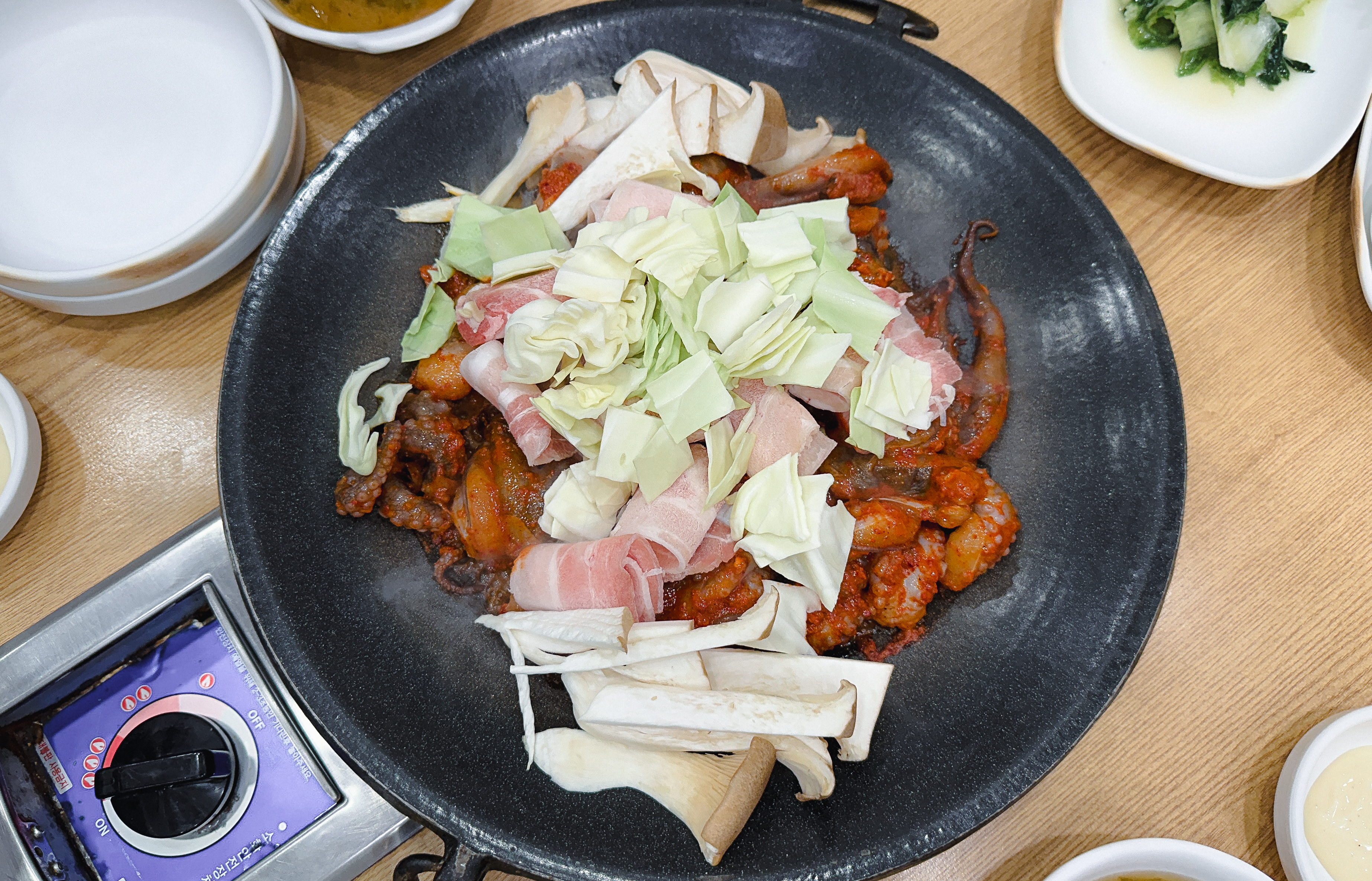 음성 그집쭈꾸미의 알쌈철판쭈꾸미가 나왔습니다. 주꾸미볶음은 양배추, 버섯, 대패삼겹살이 매콤한 양념과 함께 볶아서 먹는 메뉴였습니다. 이 메뉴는 된장국과 함께 날치알이 나오고 있었습니다.