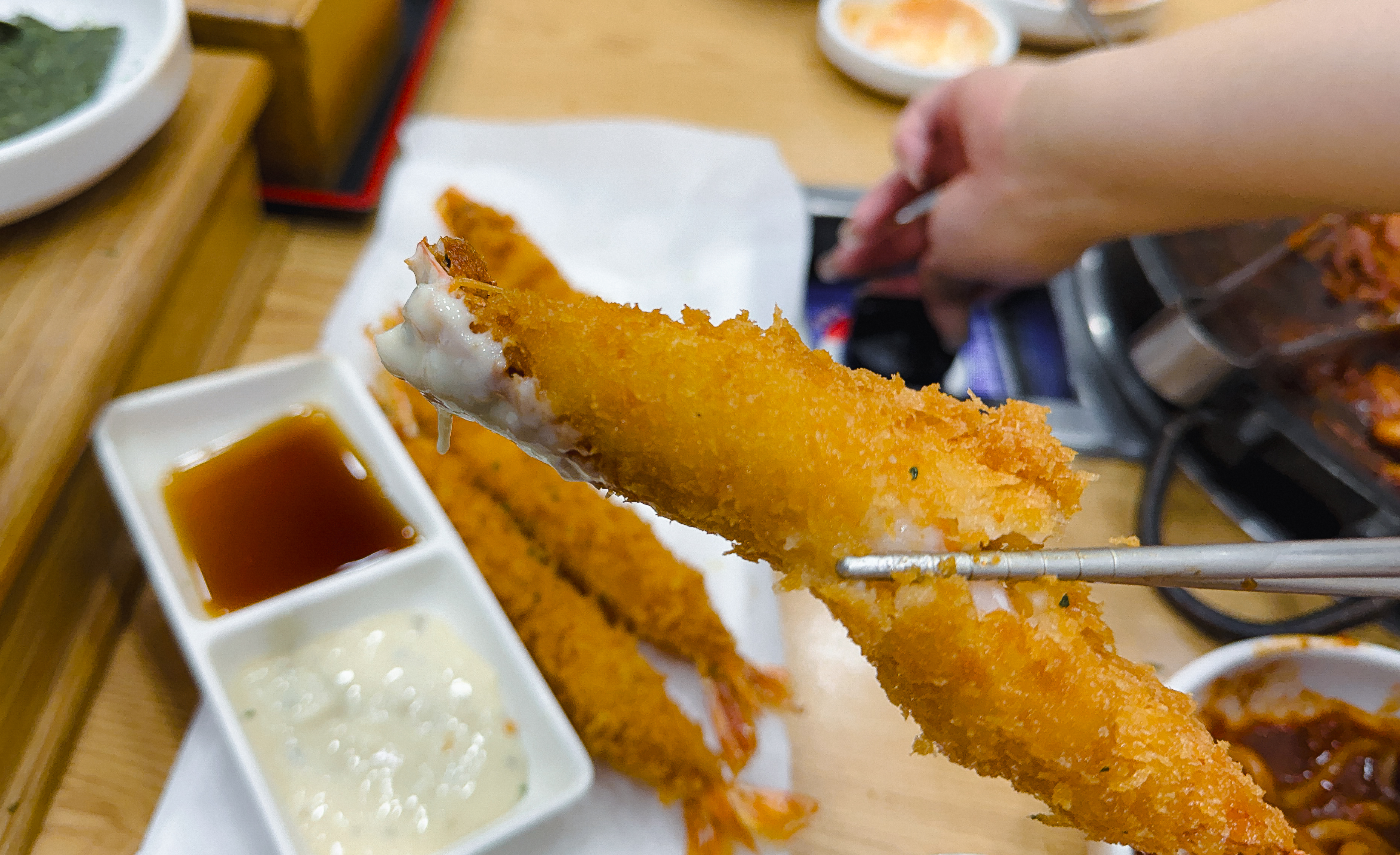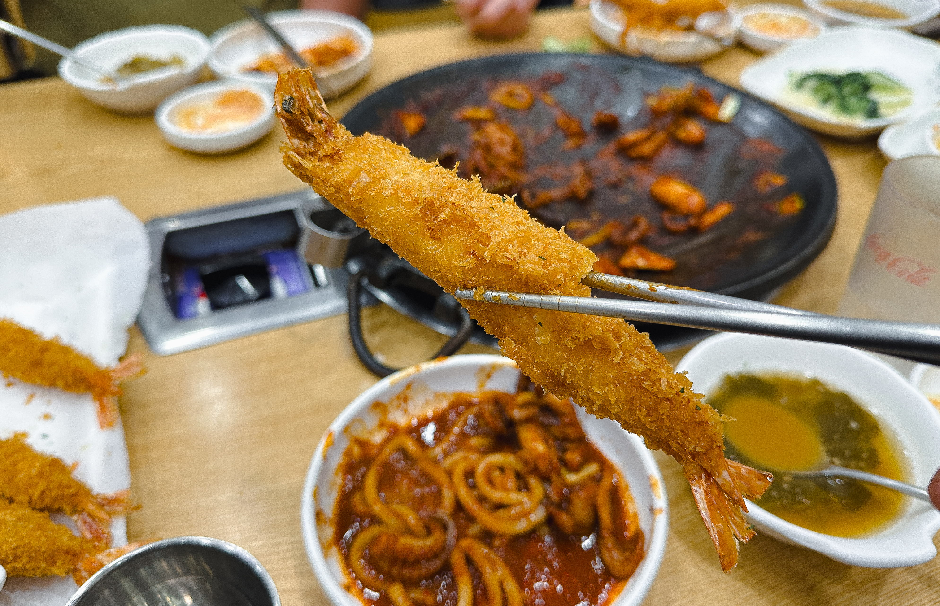 주꾸미볶음은 상추나 김에 싸 먹으면 되었고, 주꾸미볶음이랑 같이 제공되는 갈릭디핑소스와 날치알을 함께 곁들여 먹으면 맛있게 먹을 수 있었습니다. 이후에 주문한 새우튀김도 나왔습니다.