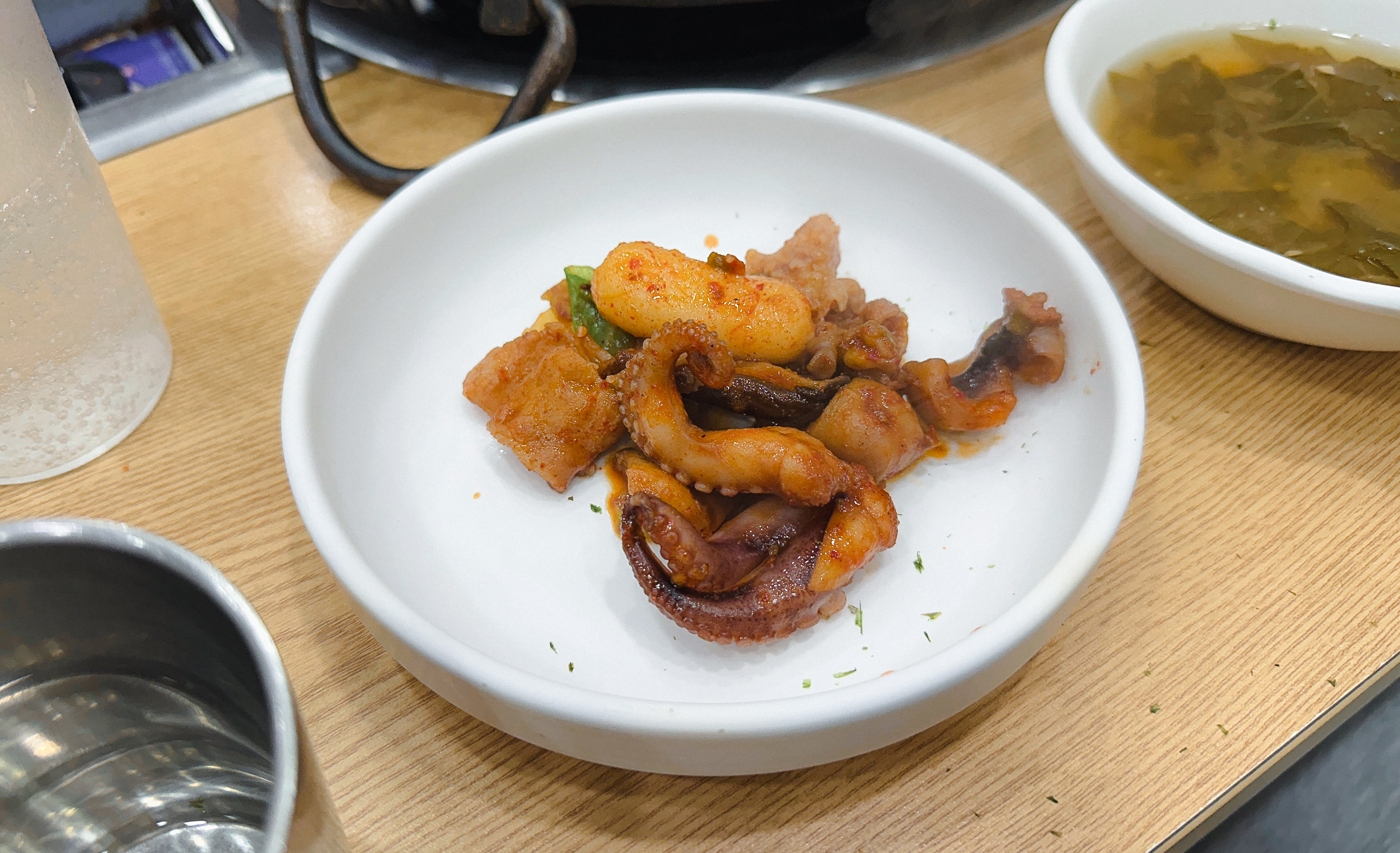 음성 그집쭈꾸미의 알쌈철판쭈꾸미가 나왔습니다. 주꾸미볶음은 양배추, 버섯, 대패삼겹살이 매콤한 양념과 함께 볶아서 먹는 메뉴였습니다. 이 메뉴는 된장국과 함께 날치알이 나오고 있었습니다.