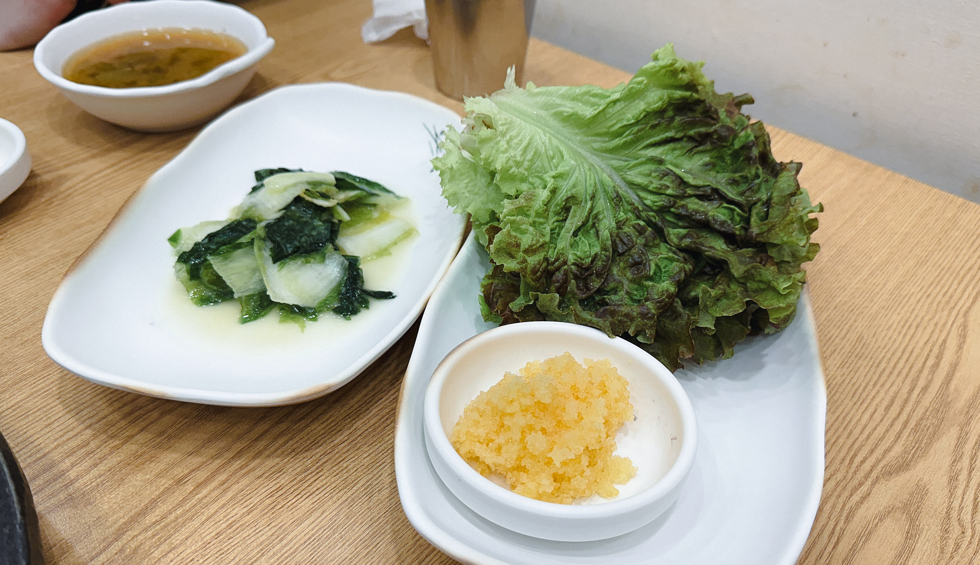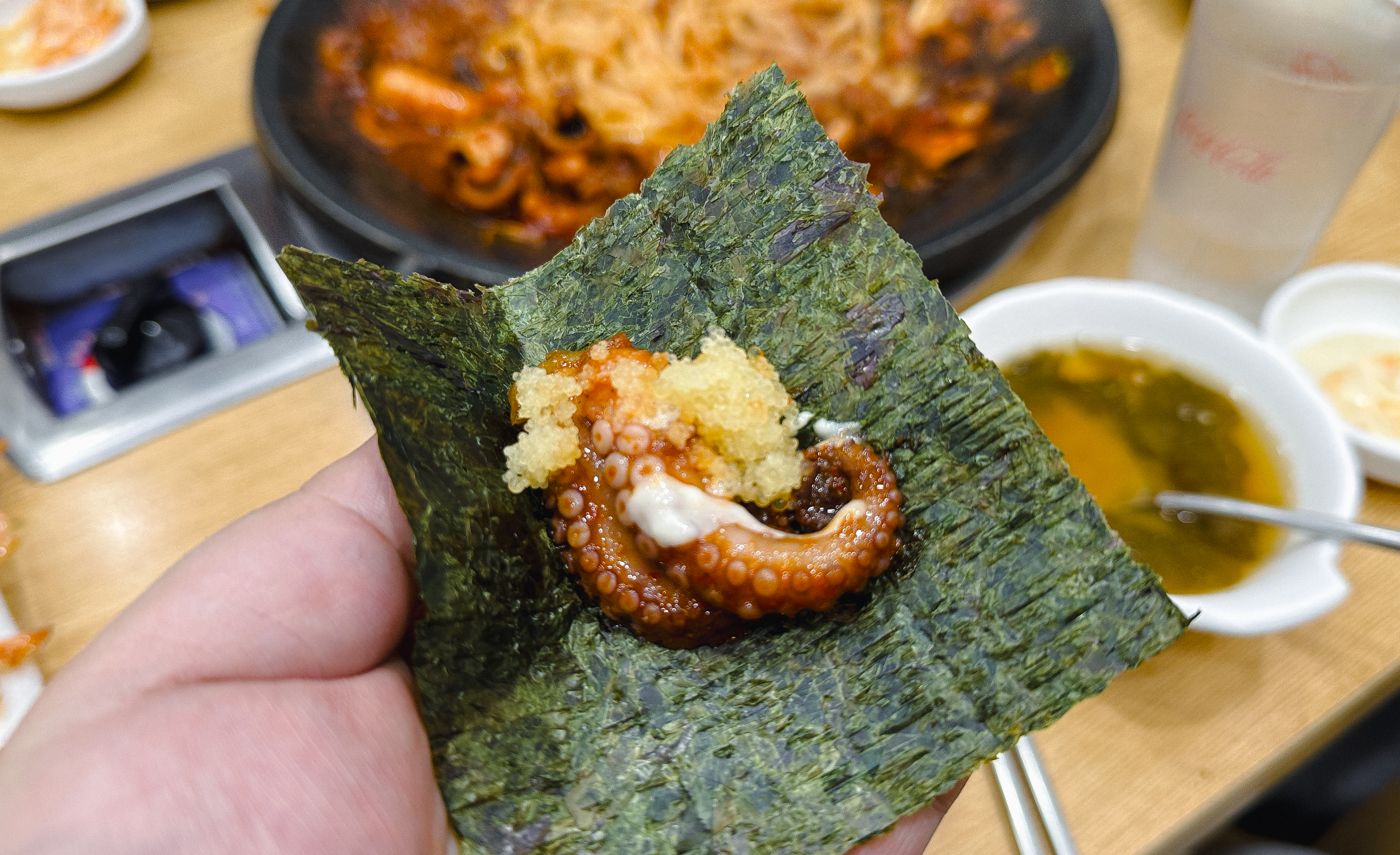 주꾸미볶음은 상추나 김에 싸 먹으면 되었고, 주꾸미볶음이랑 같이 제공되는 갈릭디핑소스와 날치알을 함께 곁들여 먹으면 맛있게 먹을 수 있었습니다. 이후에 주문한 새우튀김도 나왔습니다.