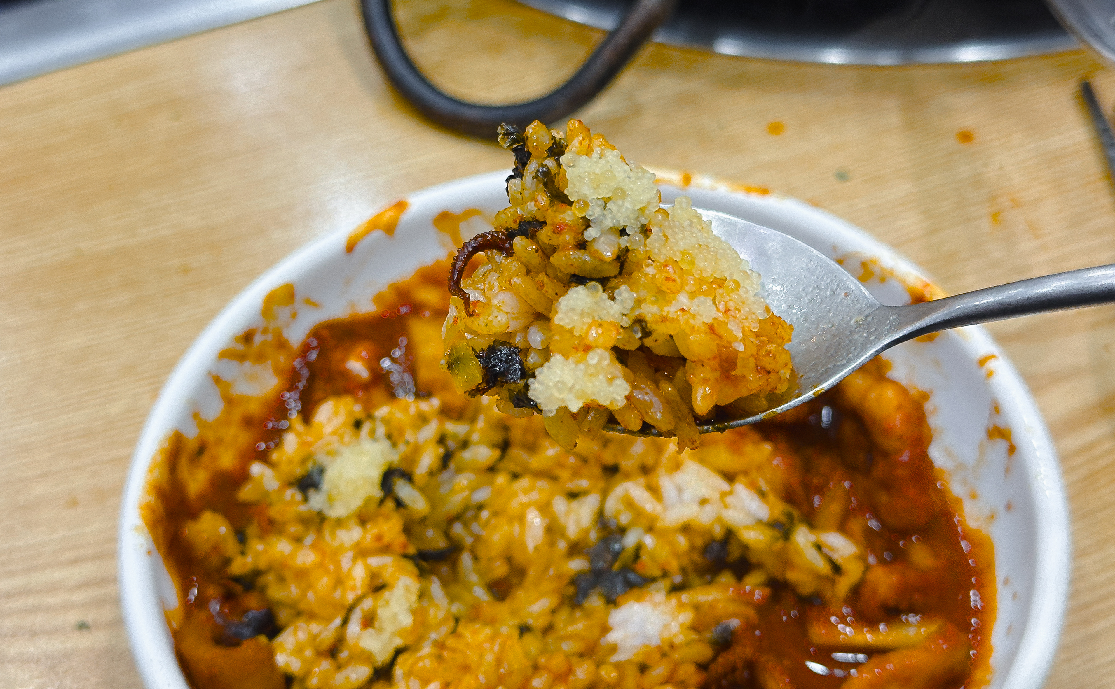대소 그집쭈꾸미의 메뉴는 불향쭈꾸미비빔밥, 알쌈철판쭈꾸미, 우쭈쭈, 왕새우튀김 등이 있었습니다. 저희는 알쌈철판쭈꾸미를 주문했고 우동, 치즈떡사리와 함께 왕새우튀김 6마리를 주문하였습니다. 식후에 볶음밥을 추가했습니다.