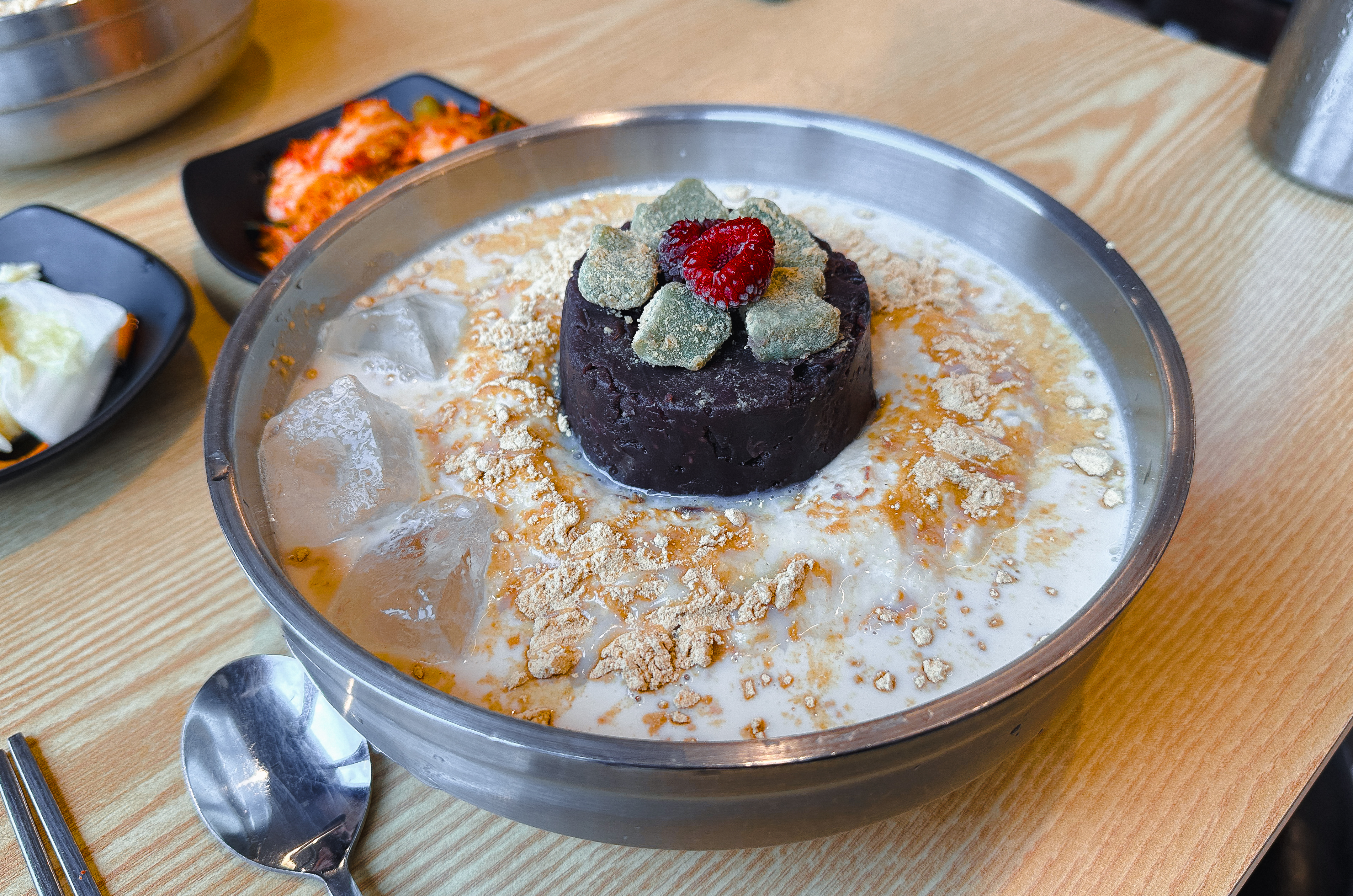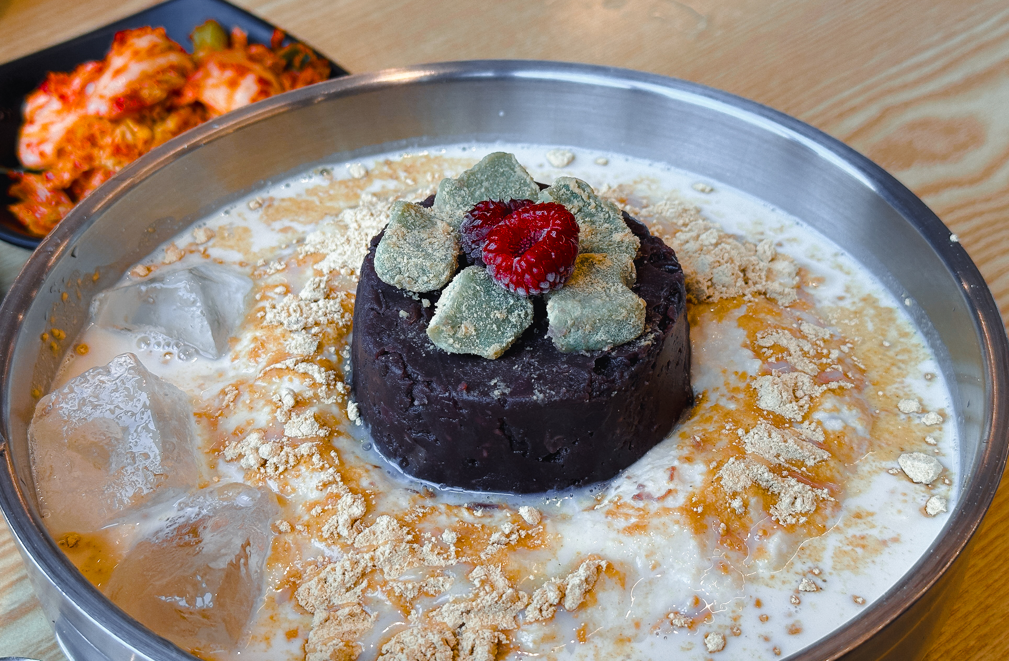 팥빙콩국수는 정말 걸쭉한 콩국물에 면도 꽤 넉넉히 들어간 메뉴였습니다. 특히 콩국수 위에 얹어진 팥과 고명은 정말로 팥빙수를 보는듯한 느낌을 주었는데, 팥과 쫀득한 떡 그리고 라즈베리가 올라가 모습도 이쁘더라고요.