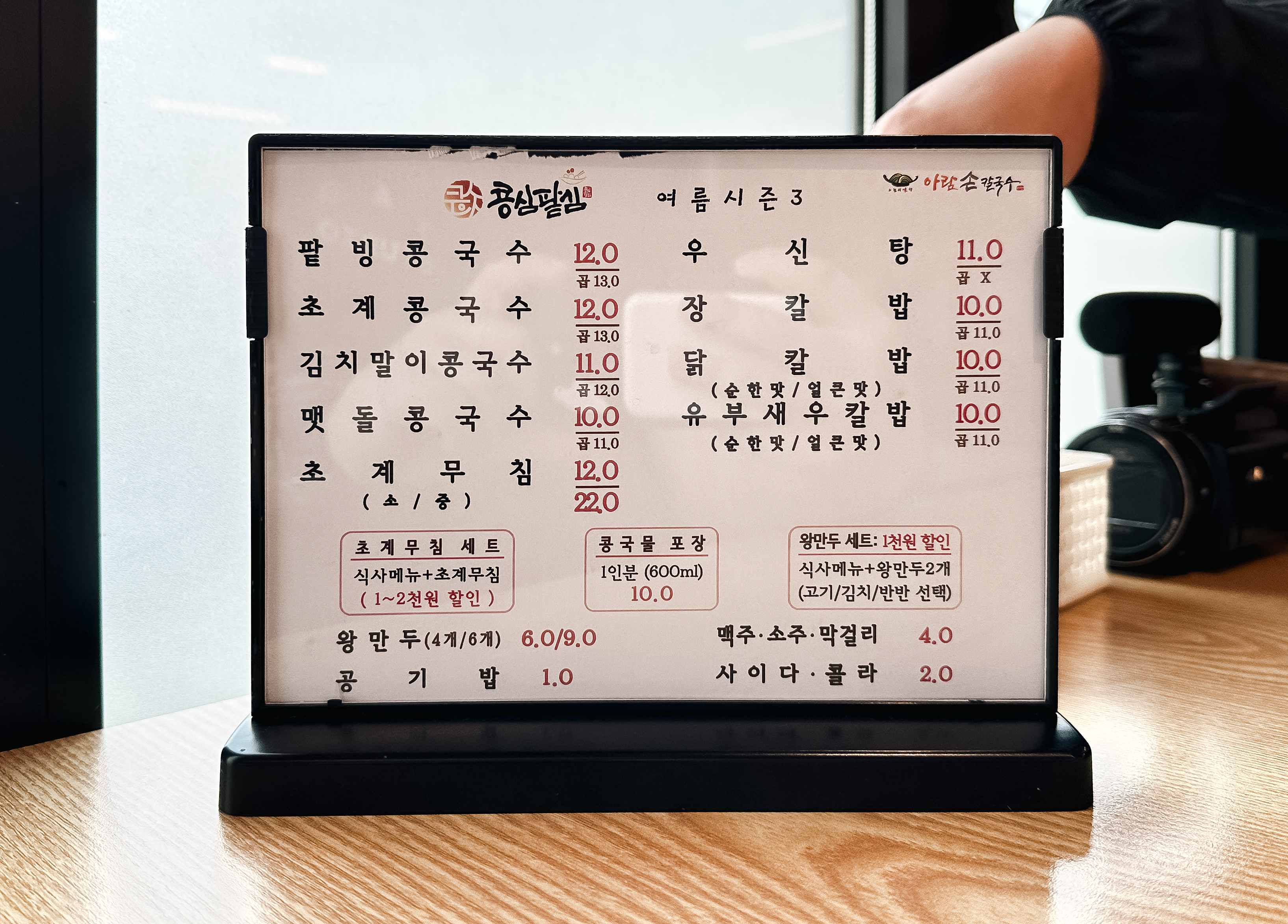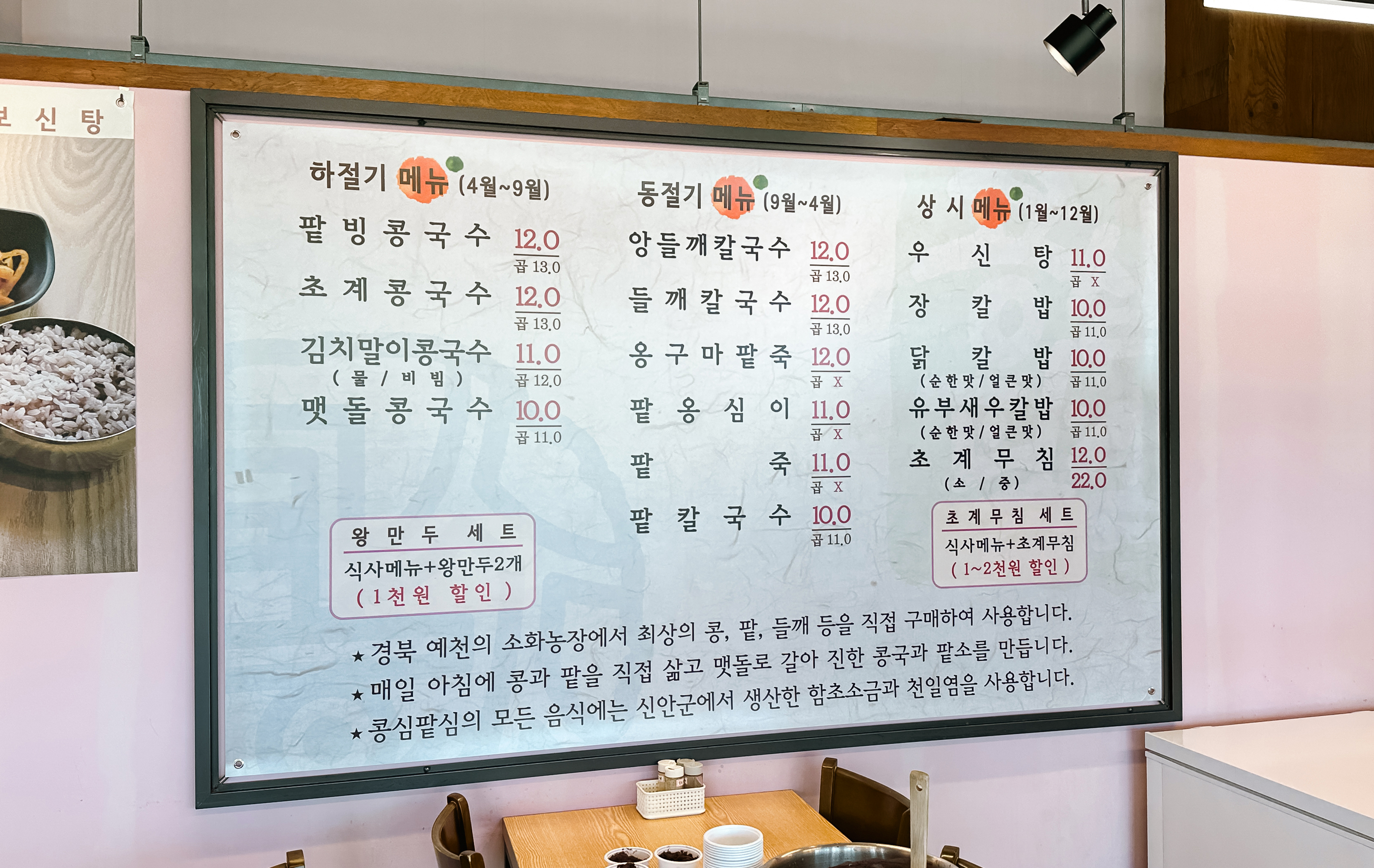 김포 콩심팥심의 하절기 메뉴는 팥빙콩국수, 초계콩국수, 김치말이콩국수, 맷돌콩국수, 초계무침, 우신탕, 장칼밥, 닭칼밥, 유부새우칼밥, 왕만두 등이 있었습니다. 저희는 하루 300그릇 한정으로 판매하고 있는 팥빙콩국수를 주문해서 먹었습니다. 참고로 이 가게는 동절기 메뉴도 별도로 구분하고 있었는데, 동절기 메뉴는 앙들깨칼국수, 들깨칼국수, 옹구마팥죽, 팥옹심이, 팥죽, 팥칼국수도 있었습니다.