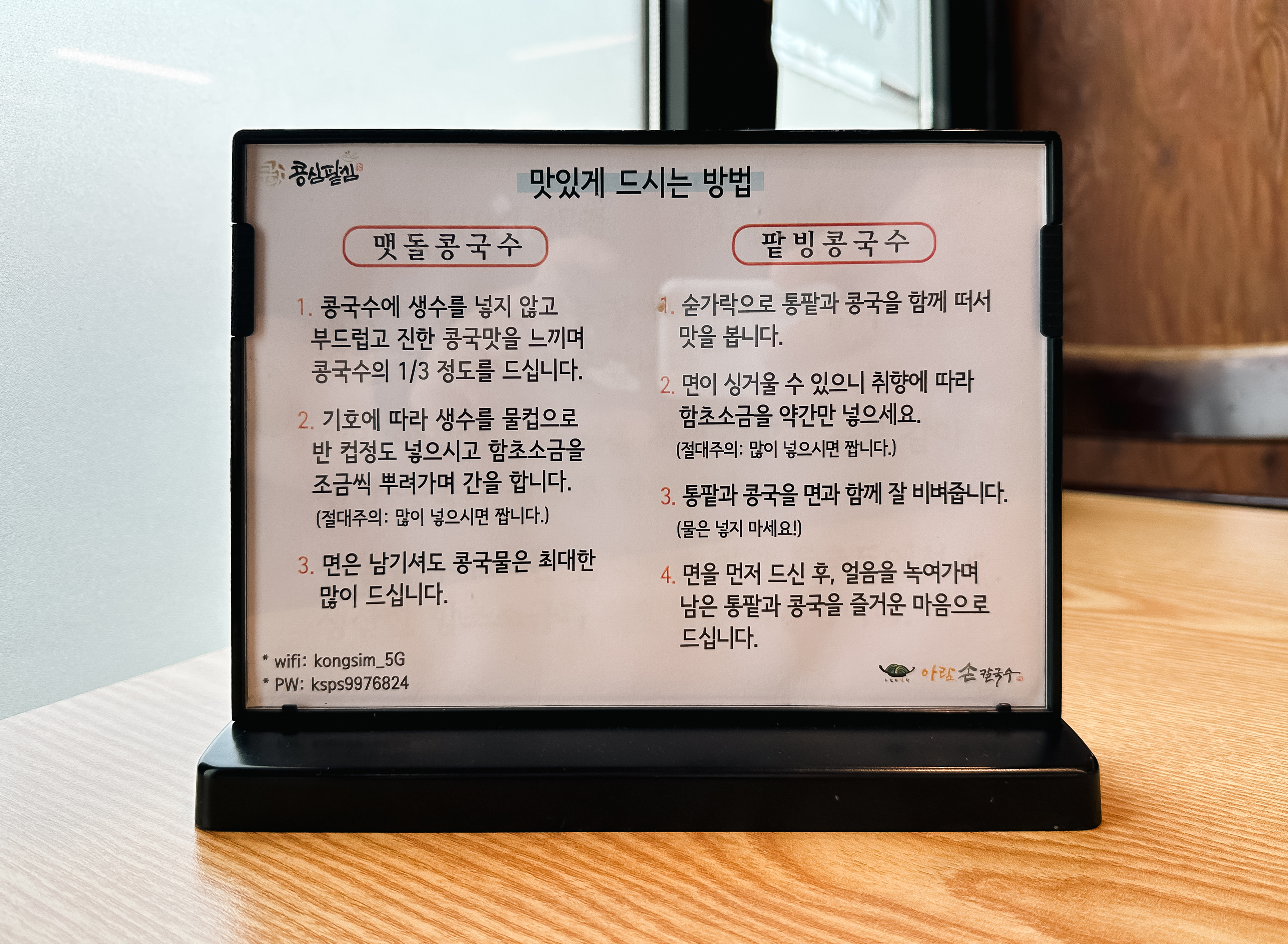 테이블에 놓인 팥빙콩국수 드시는 방법을 참고하실 수 있도록 안내문을 살펴보면, 숟가락으로 통팥과 콩국을 함께 떠서 맛을 보고, 면이 싱거우면 함초소금을 곁들여 먹으라고 합니다. 통팥과 콩국을 면과 함께 잘 비벼주고, 면을 먼저 먹은 다음, 콩국을 즐거운 마음으로 먹으라고 안내하고 있었습니다. 이용하시는 분들은 참고하셔서 드시면 될 것 같습니다.