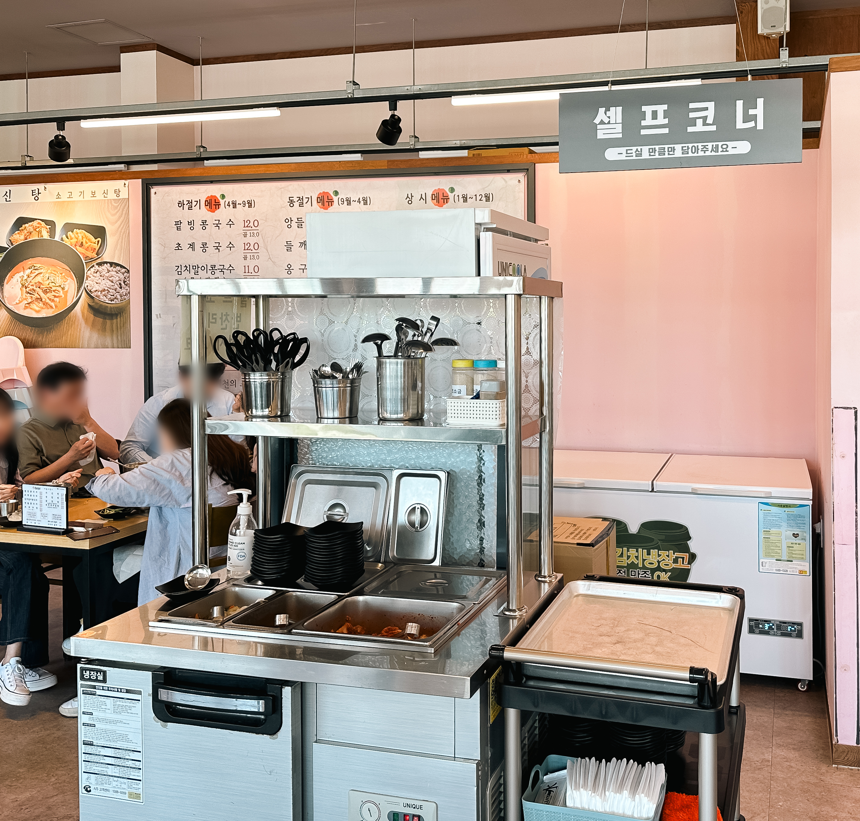 반찬은 셀프코너에서 직접 가져다 먹을 수 있었는데, 백김치, 배추김치, 무김치를 가져다 먹을 수 있었습니다. 김치는 칼국수를 전문으로 판매하는 가게이다 보니 맛이 괜찮더라고요. 콩국수만 먹기에는 조금 심심할 수 있어서 반찬은 꼭 가져다 드시는 것을 추천드립니다.