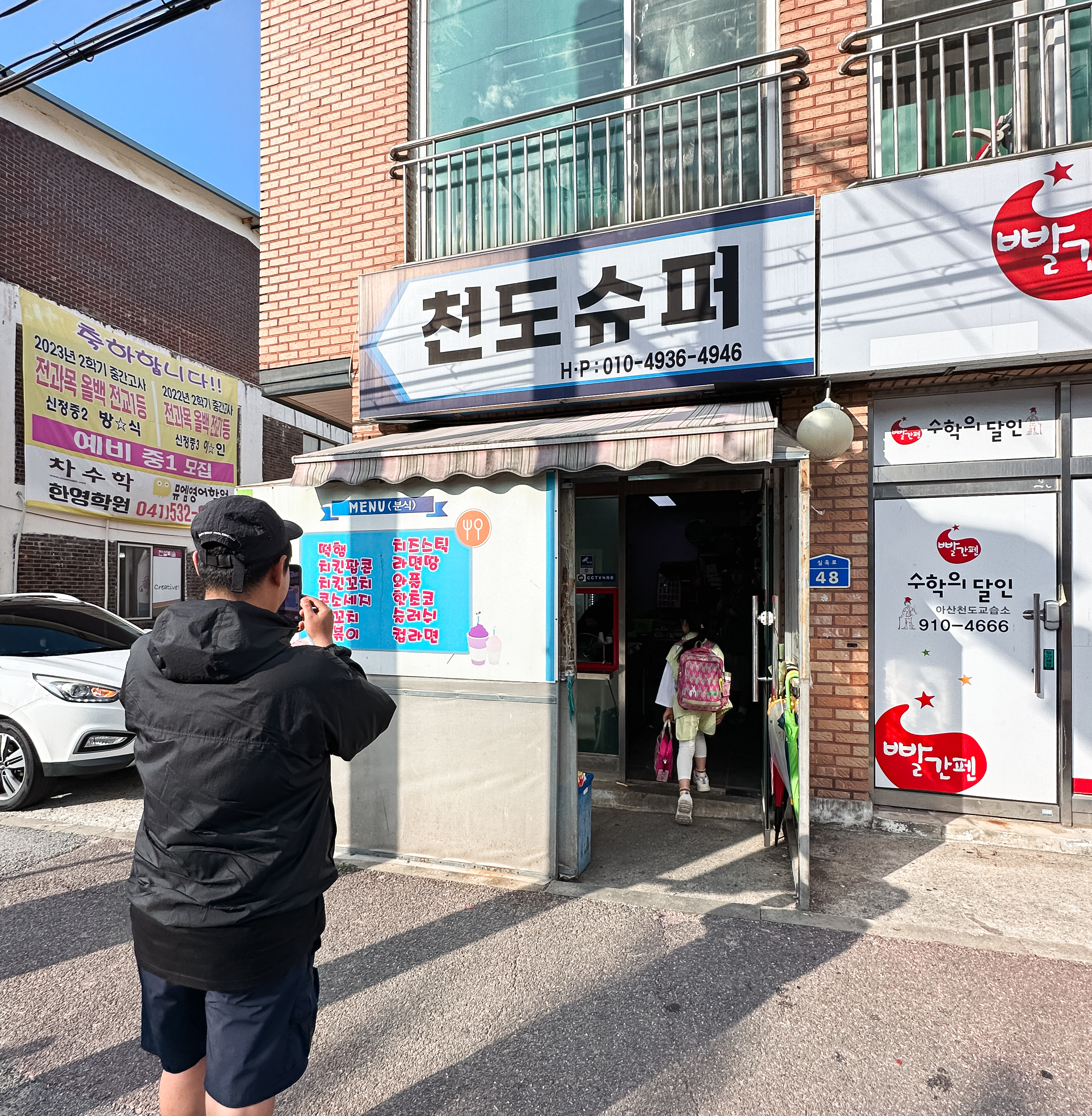 천도슈퍼는 충남 아산시 실옥동 181-147, 1층에 위치한 가게였습니다. 아산 천도슈퍼는 아시겠지만 학교 앞에 위치한 가게입니다. 학생들 등하굣길에 위치하기 때문에 차량 이용 시 학생들의 통학에 방해가 되지 않는 안전한 곳에 주차를 하시고 방문하시는 것을 추천드립니다. 영업시간에 대한 정보는 정확히는 안 나오는데, 간판에 적인 번호로 문의하시면 영업여부를 확인하실 수 있습니다.