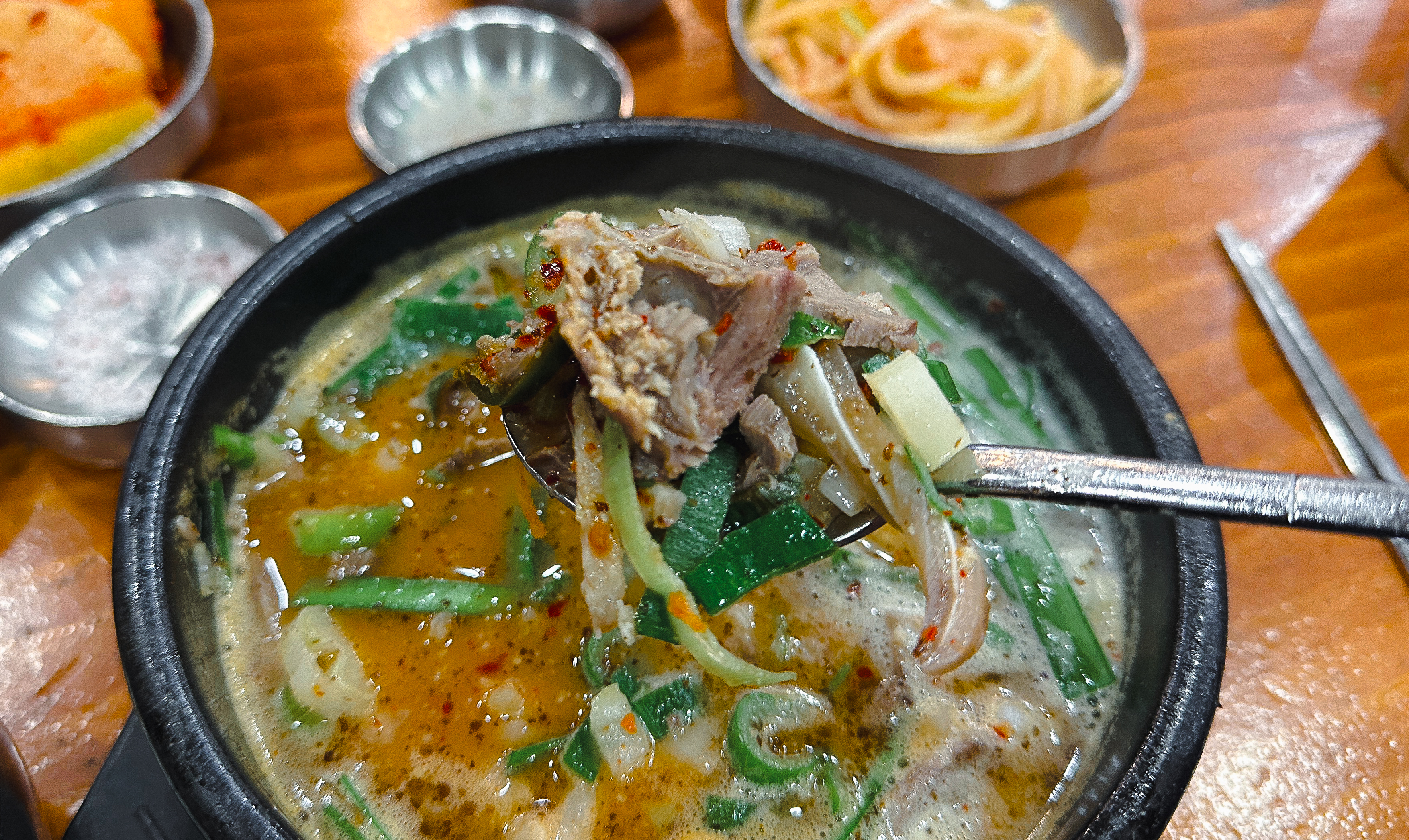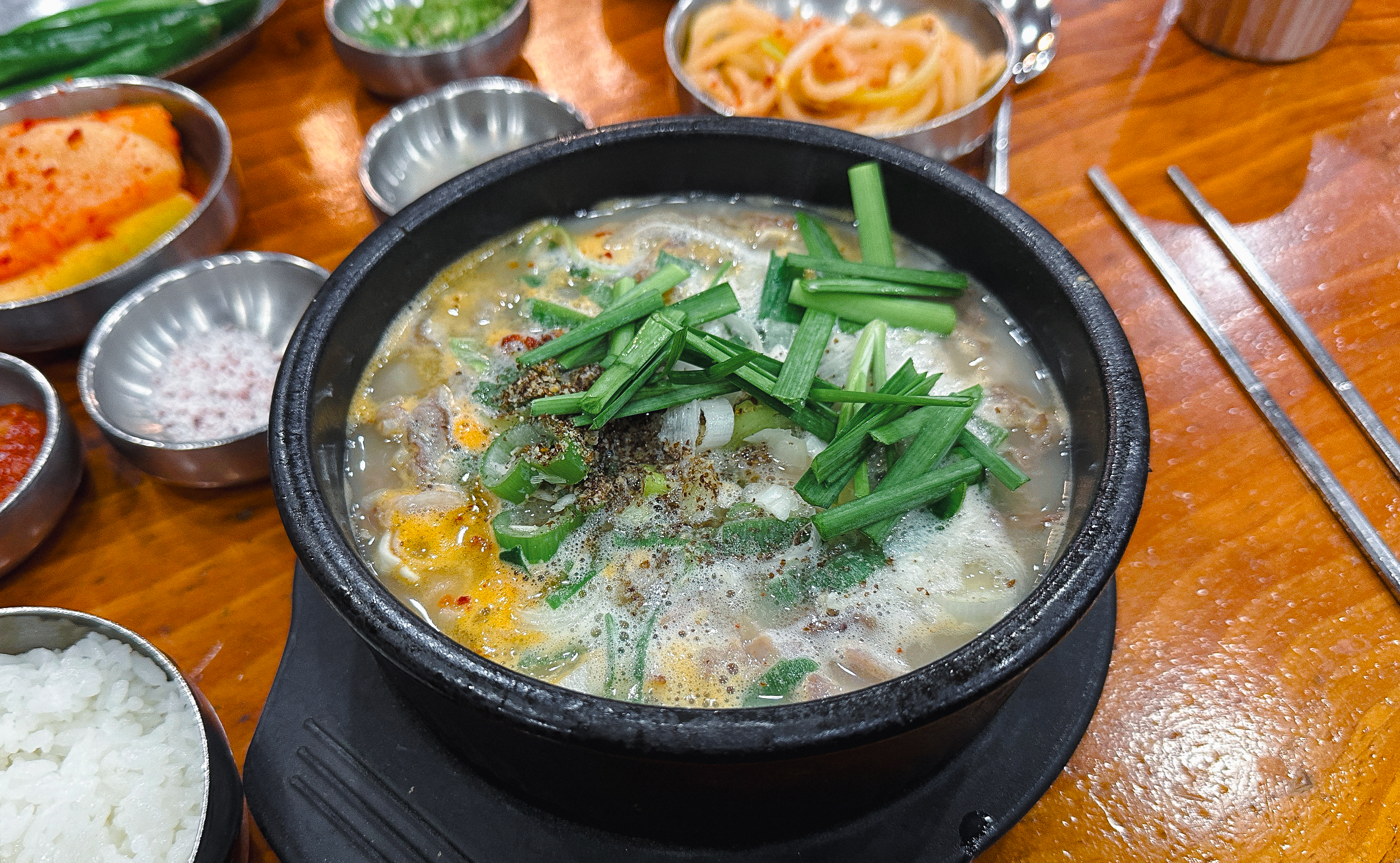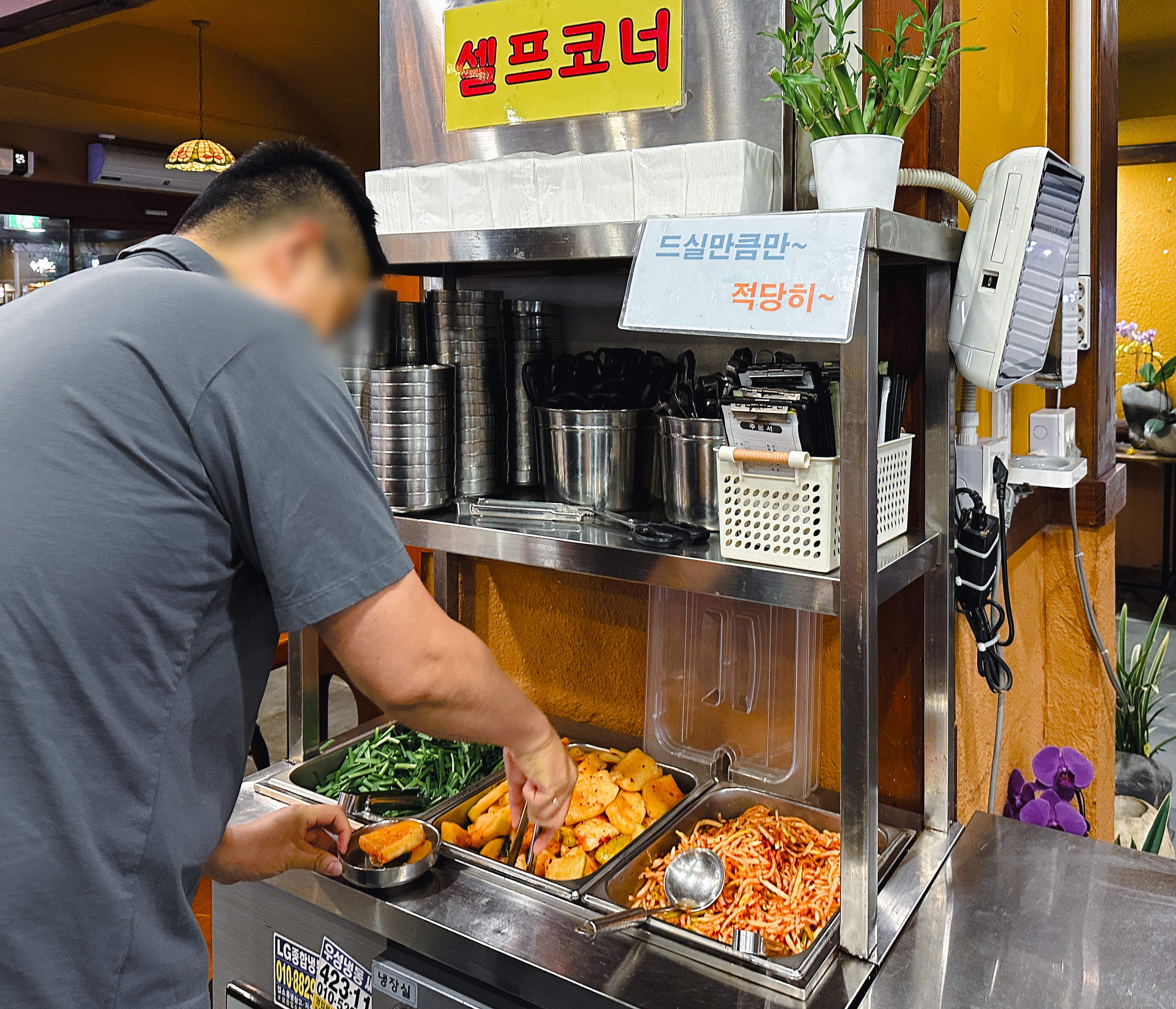 함경도찹쌀순대의 메뉴는 위와 같습니다. 순대국, 술국, 정식, 순대, 수육, 모듬, 철판이 있었습니다. 저희는 순댓국과 수육, 순대가 같이 나오는 순댓국 정식을 주문했습니다. 순댓국 정식의 가격은 13,000원 이었습니다. 가락동 맛집 함경도찹쌀순대는 기본 반찬은 가져다주시지만, 추가 반찬은 직접 가져다 먹을 수 있도록 셀프코너를 마련하고 있었습니다.