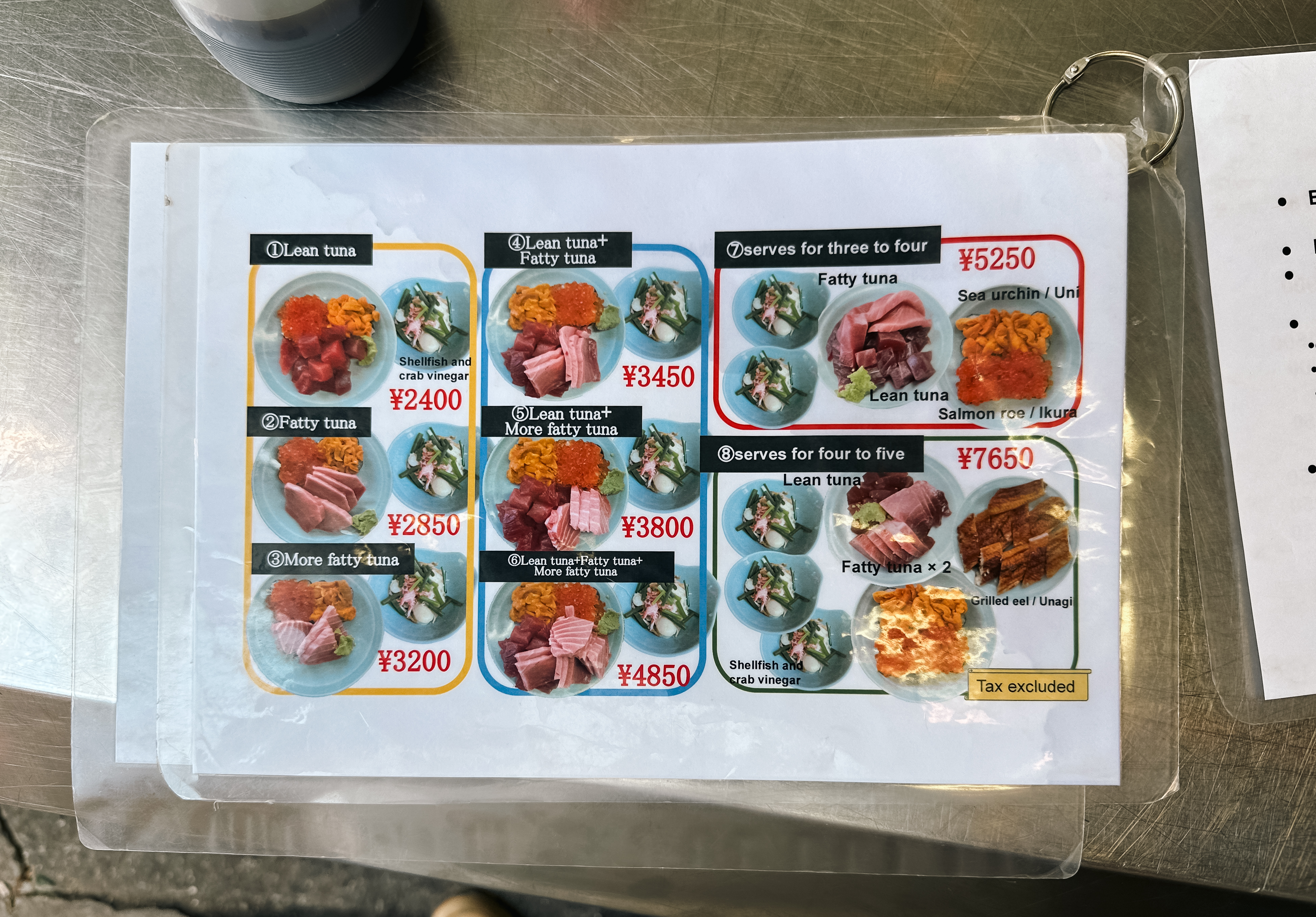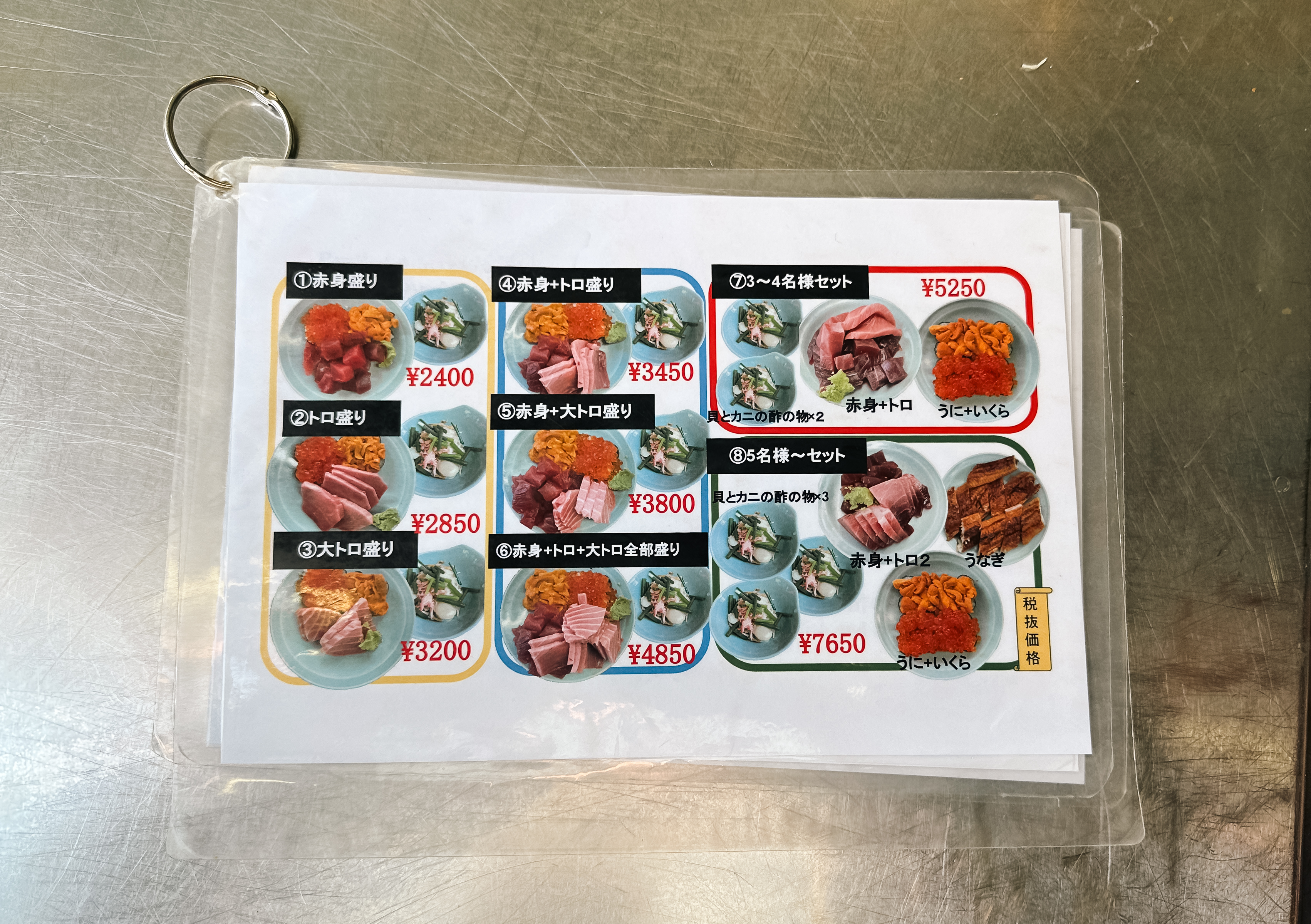 저희는 직원의 안내에 따라 자리를 잡고 메뉴를 살펴보았습니다. Izakaya Toyo 의 주 재료는 참치로 모듬, 참치볼살구이, 장어구이, 롤, 성게, 다랑어, 우니 등이 있었습니다. 저희는 '참치살코기롤'과 '참치모듬' 그리고 '참치볼살구이'를 주문했습니다. 음료는 병맥주와 우롱차를 주문했습니다.