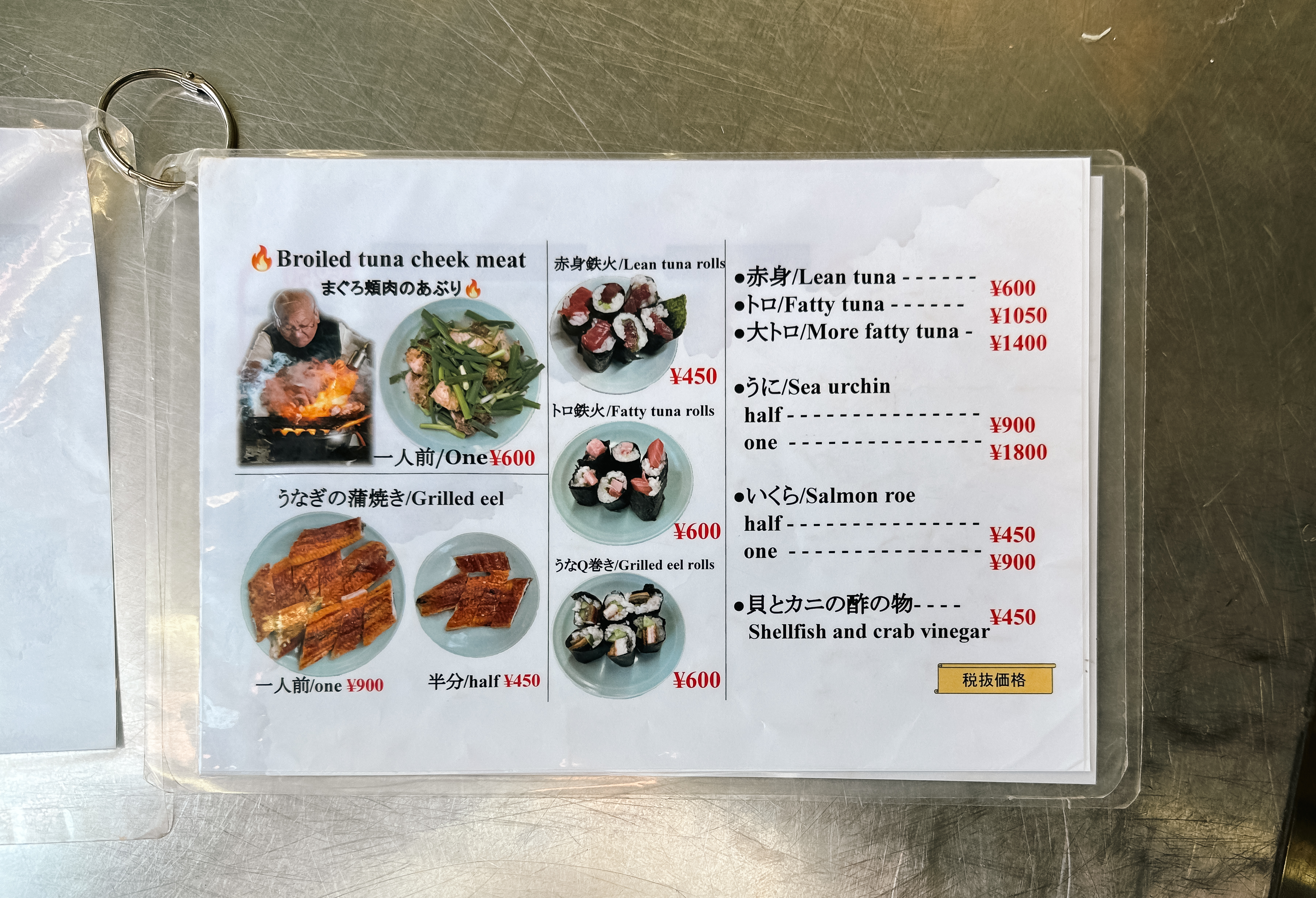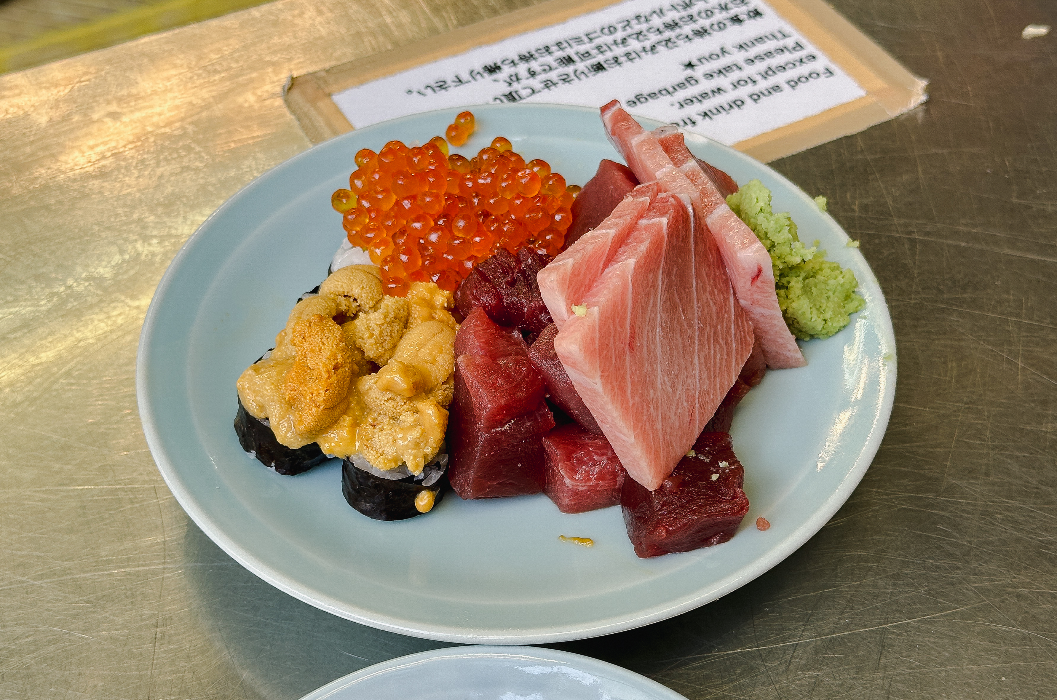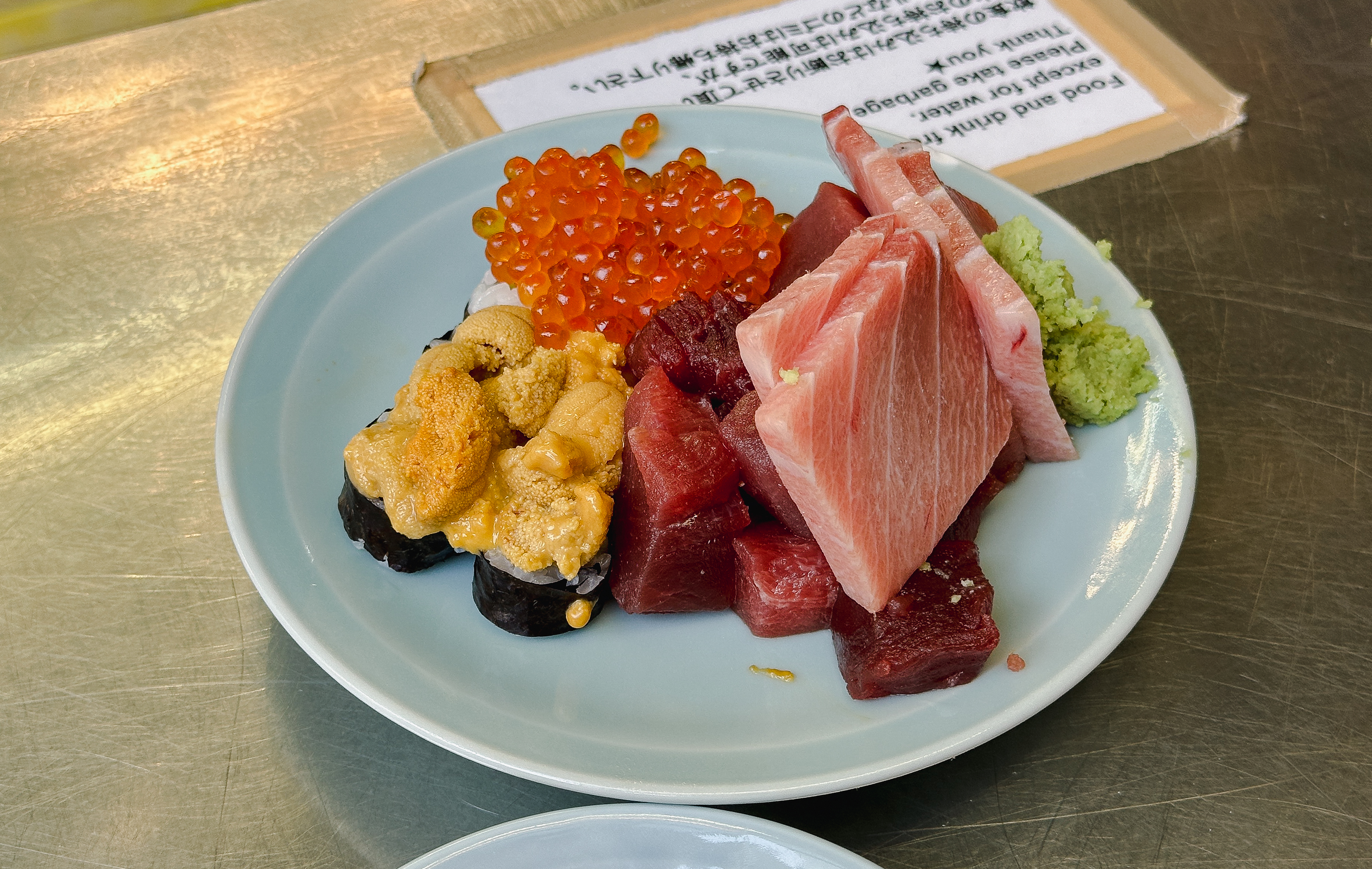 가게에 손님들이 많기 때문에 주문한 메뉴를 받기까지는 굉장히 시간이 소요되고 있었습니다. 사진을 보시면 맨 위의 사진은 참치모둠이라고 적었는데, 메뉴에 모듬이라 적혀있진 않으나 우니, 성게와 함께 참치의 살코기, 지방부위가 섞여 나오는 메뉴와 가운데에는 참치 살코기 롤 그리고 마지막 사진은 직화로 구워내는 참치볼살구이였습니다.