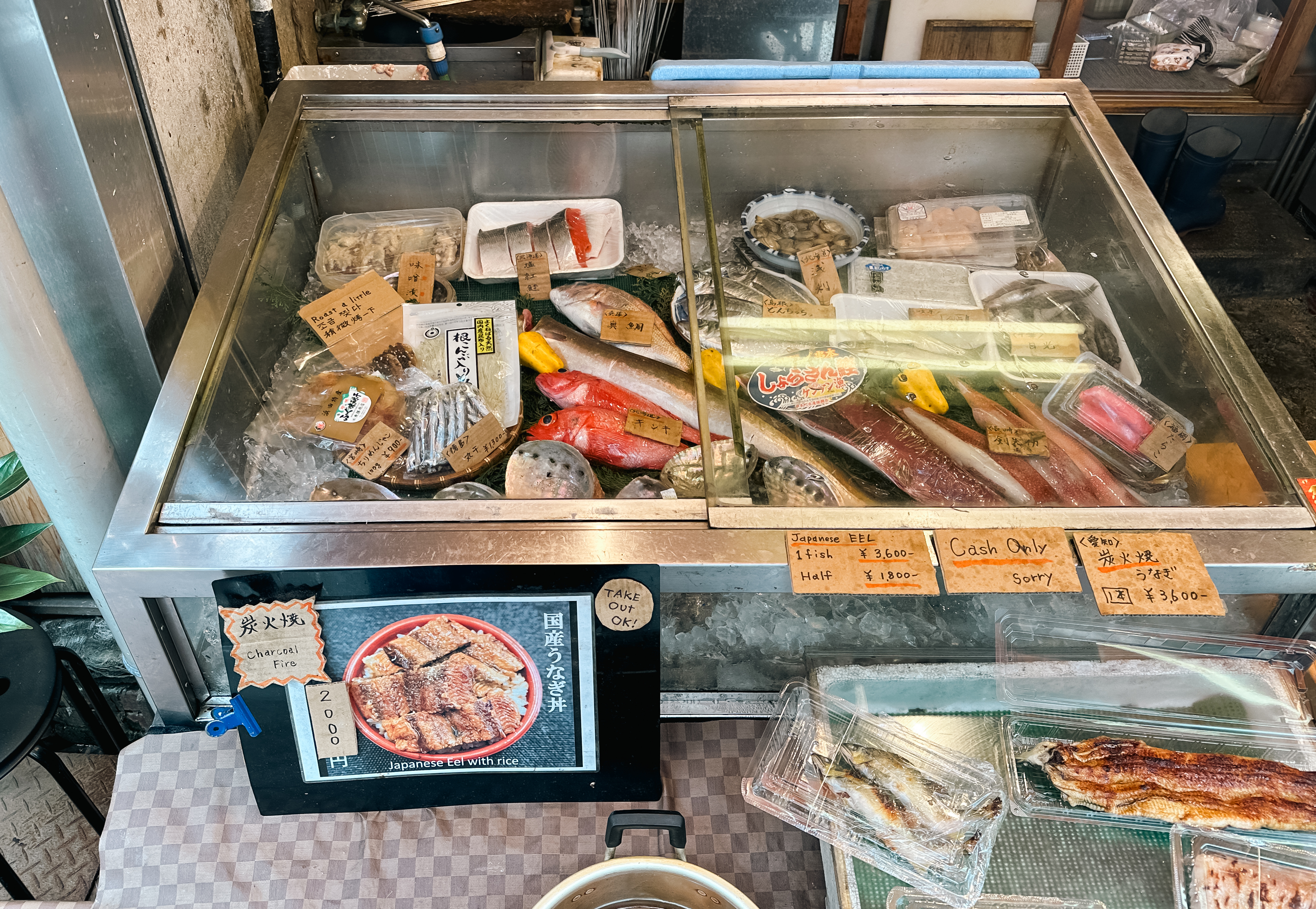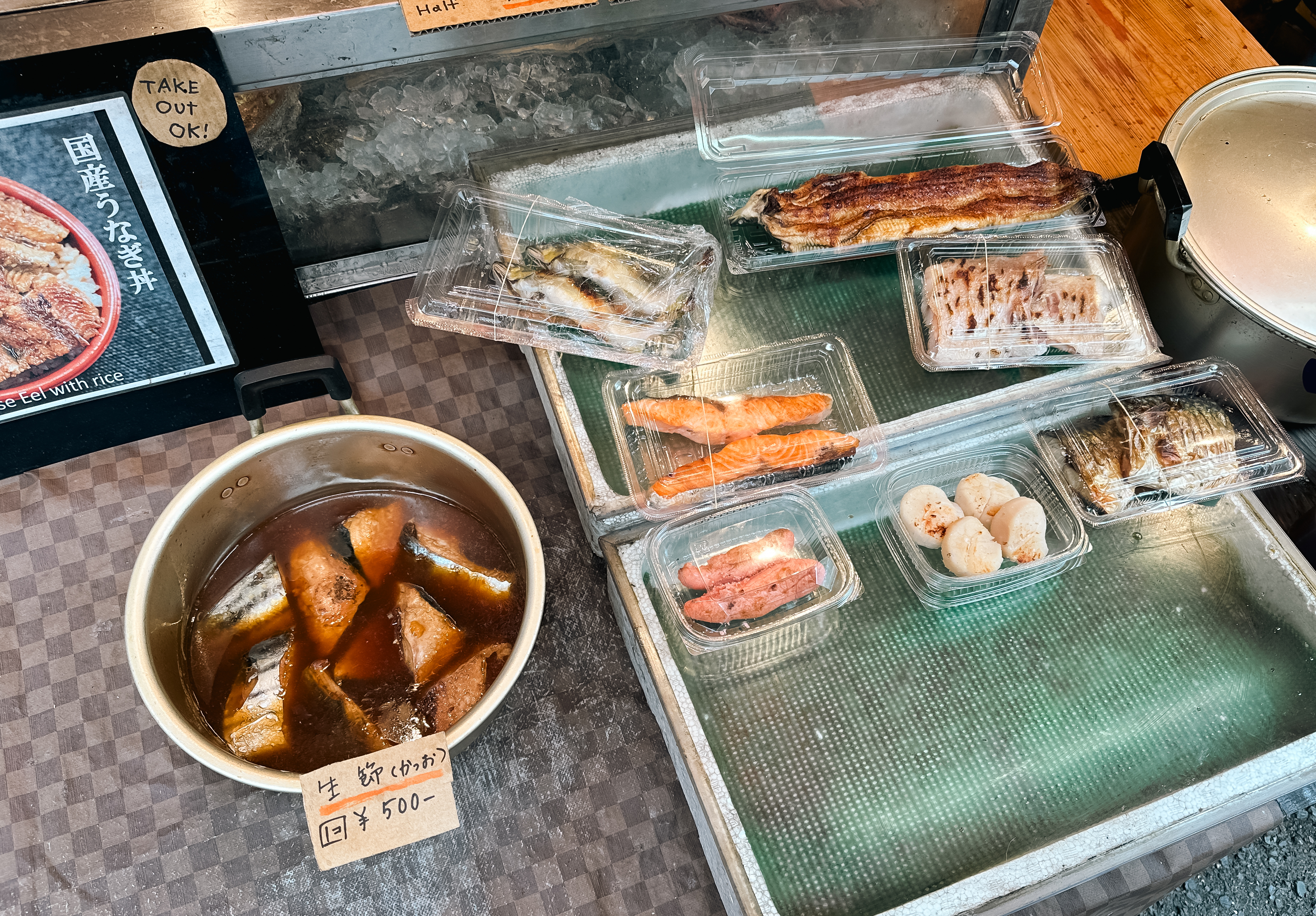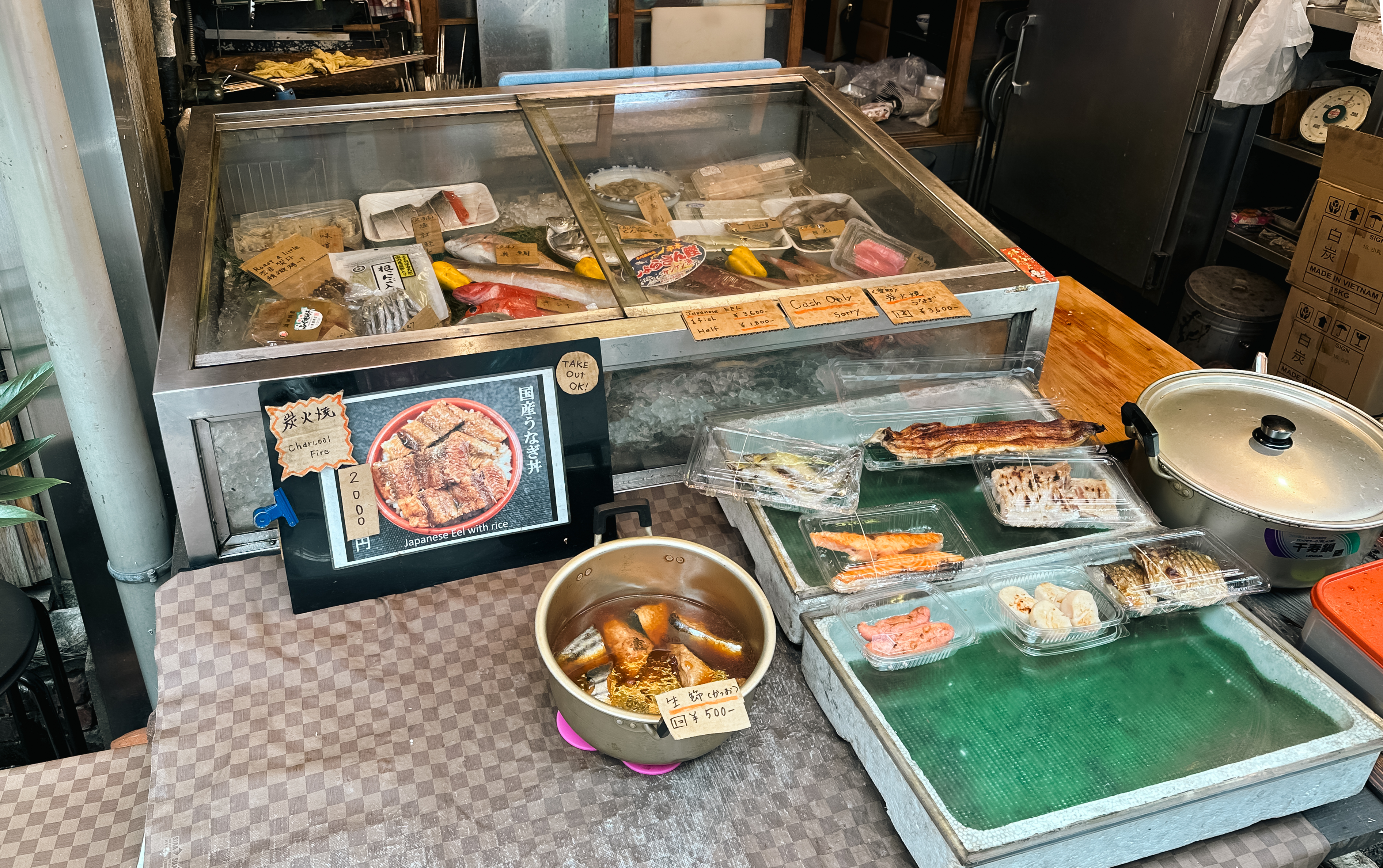 Uotoyo 에는 메뉴판이 따로 존재하지는 않았고, 반찬가게처럼 그날그날 생선들을 주로 판매하시는 것 같았고, 즉석에서 조리해 주시는 주 메뉴는 장어덮밥으로, 포장과 가게 앞 간이 테이블에서 간단하게 식사할 수 있었습니다.