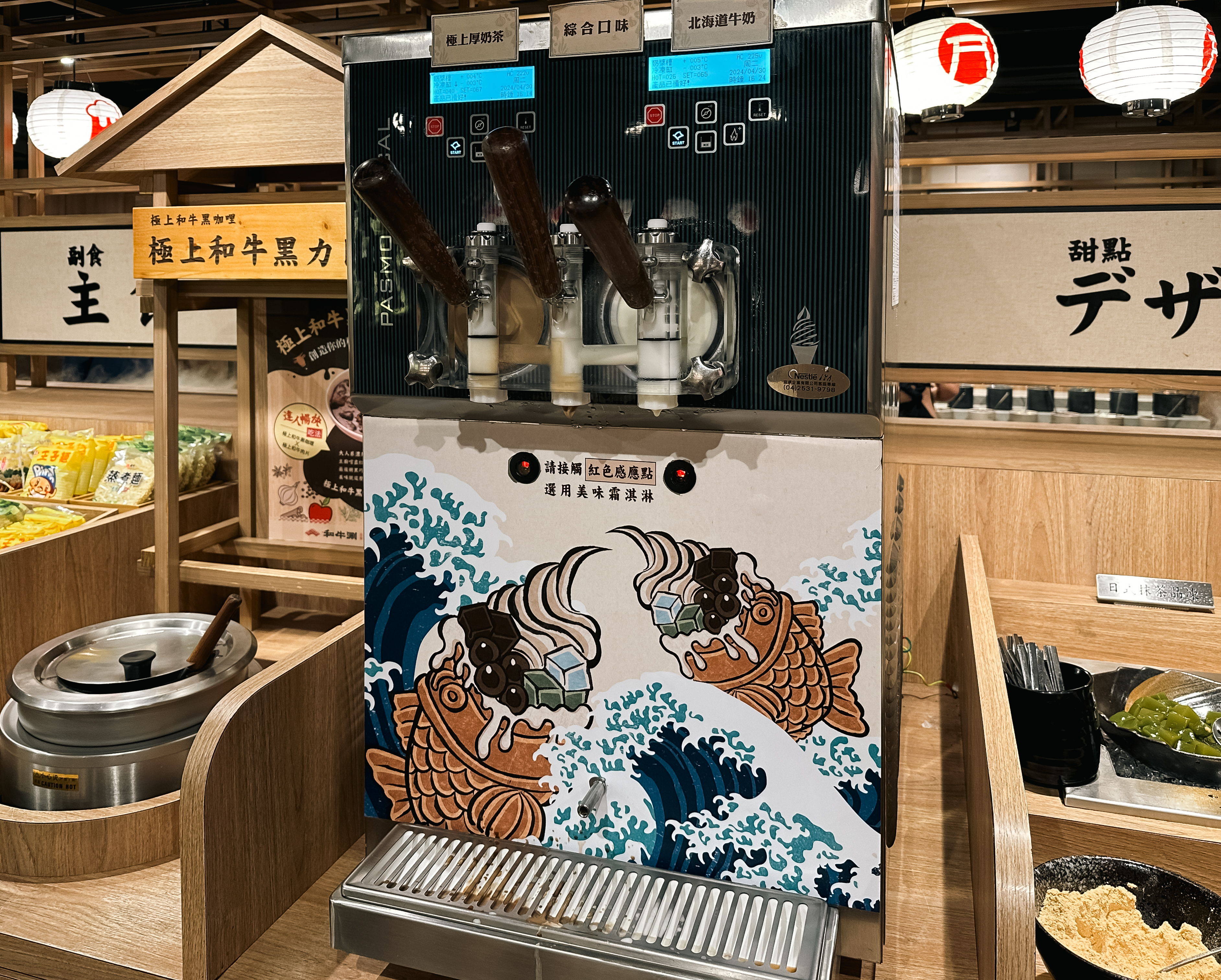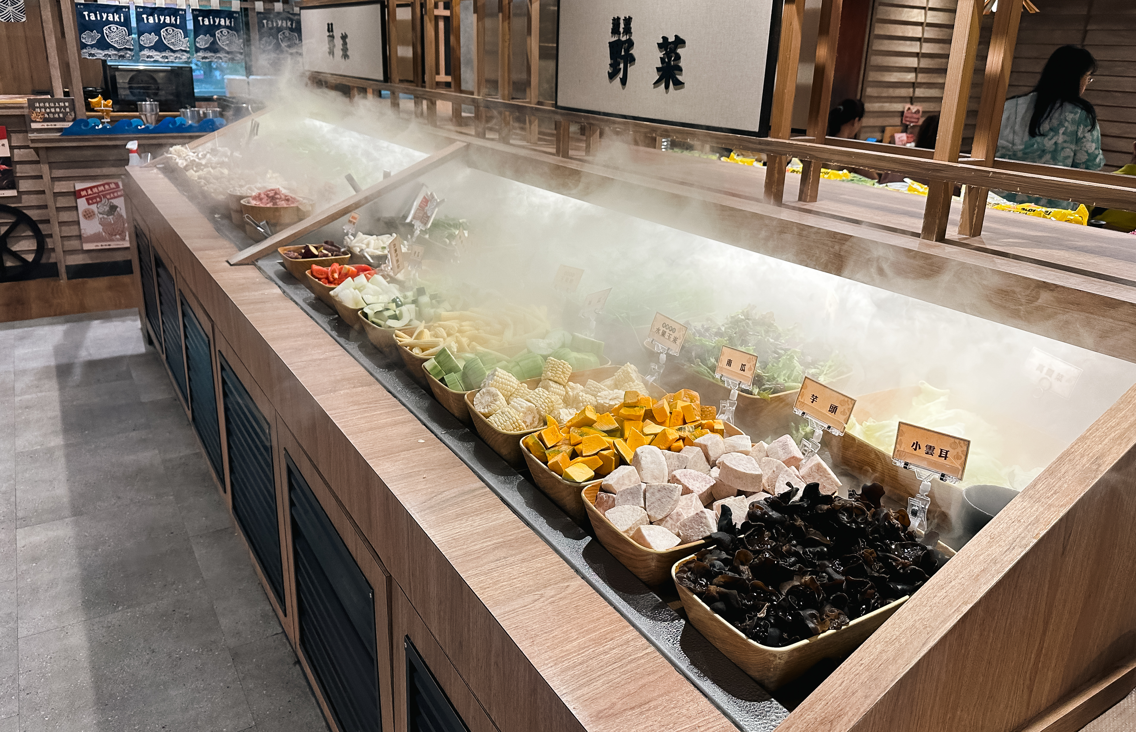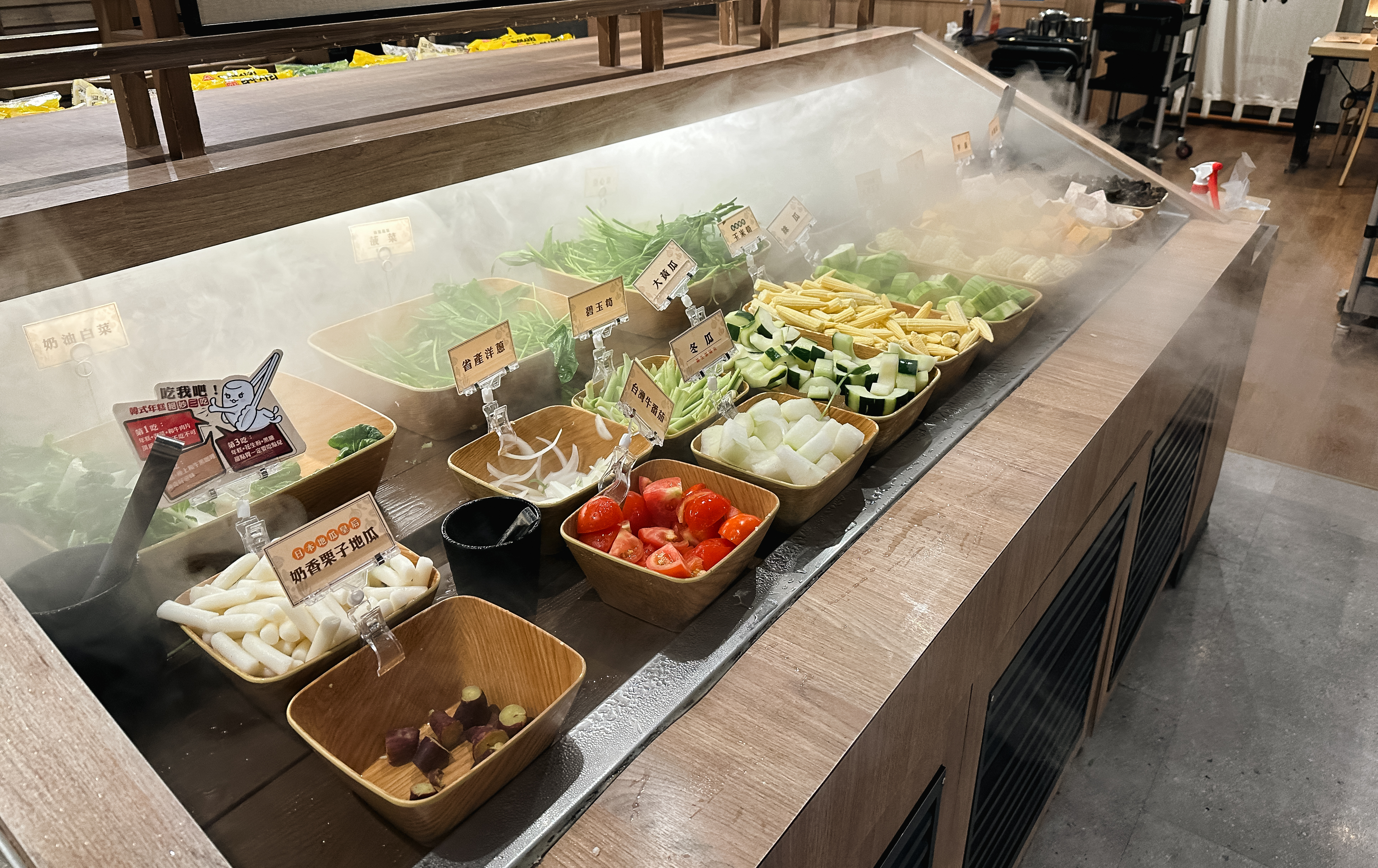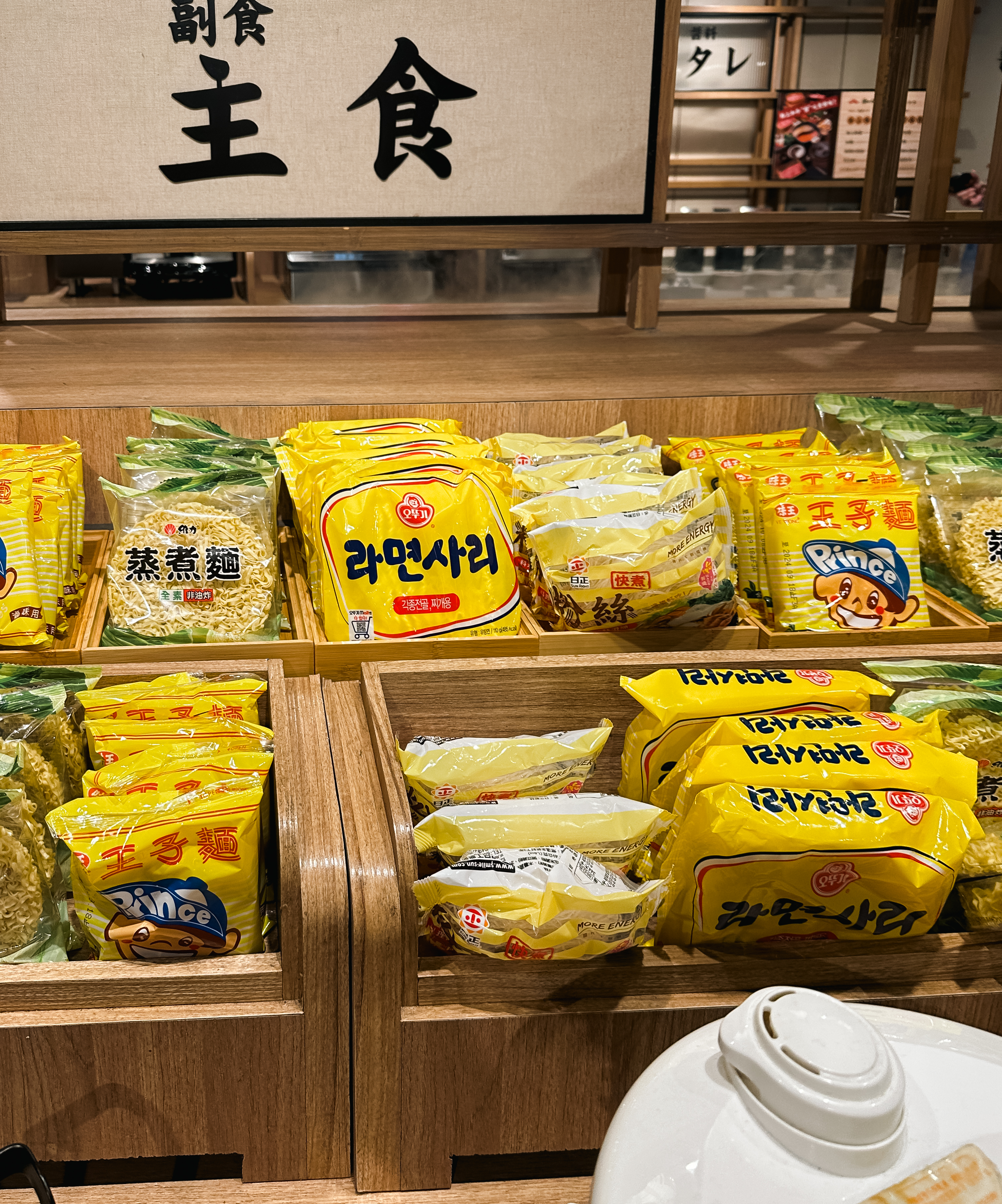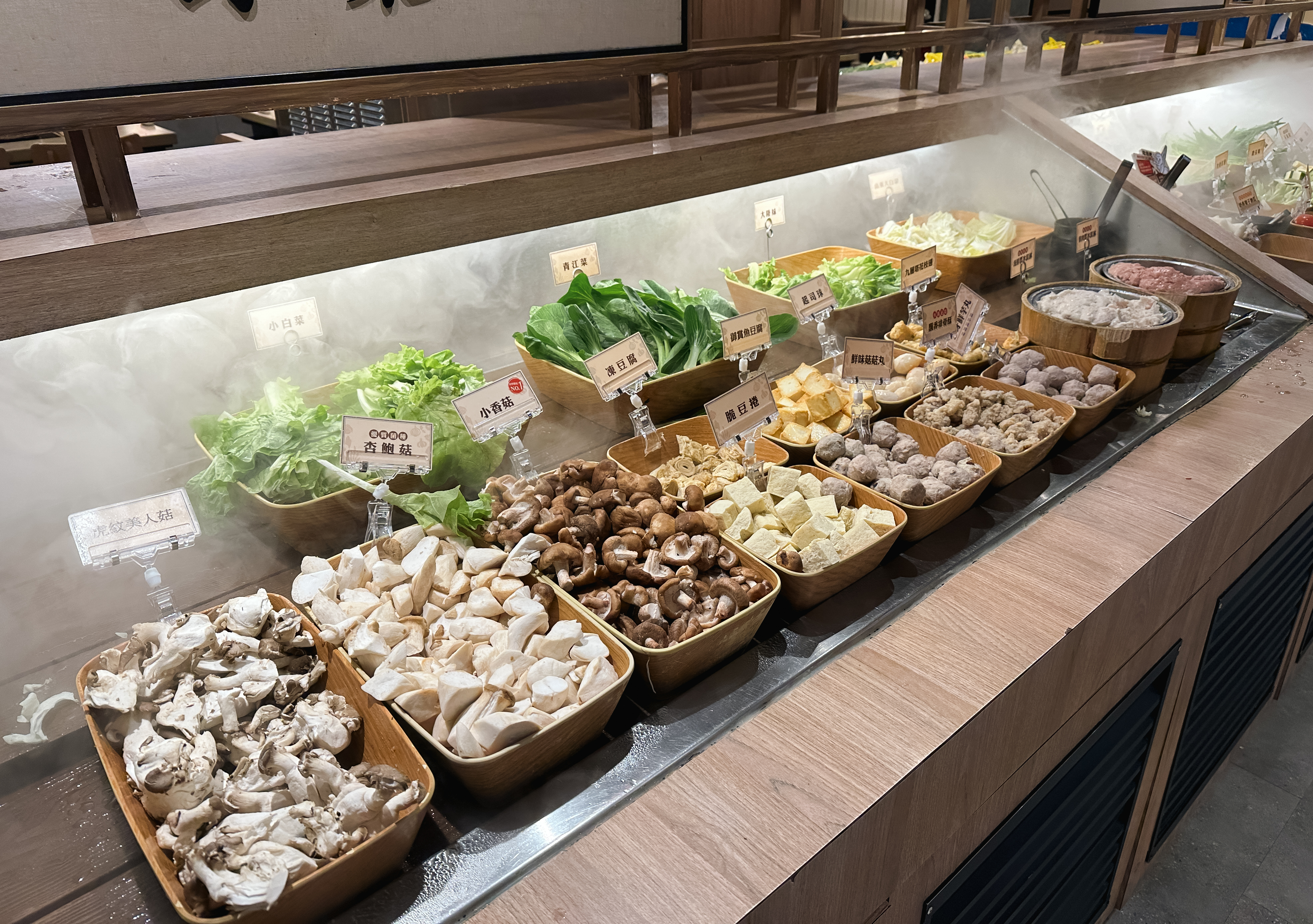 샤브샤브 무한리필 가게 和牛涮 日式鍋物放題 의 소고기는 자리에서 벨을 눌러 호출하면 가져다주고 있었고, 샤브샤브에 넣을 채소는 셀프바에서 직접 가져다먹을 수 있었습니다. 한국의 샤브샤브 무한리필 뷔페에서도 비슷한 구성이 있었지만, 이곳은 재료들 관리도 잘 되어있고 한국에서 보이지 않는 재료들도 종종 볼 수 있었습니다.