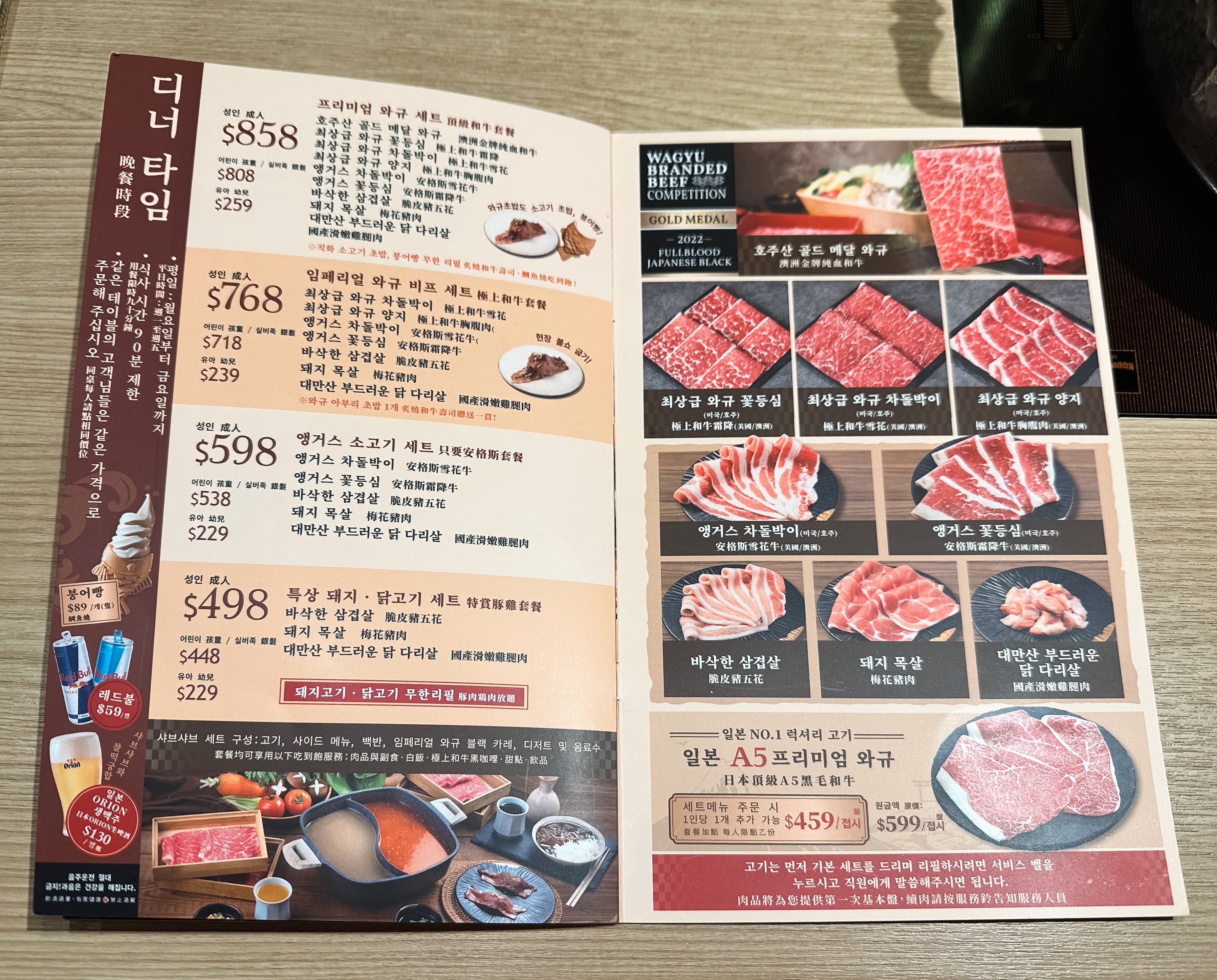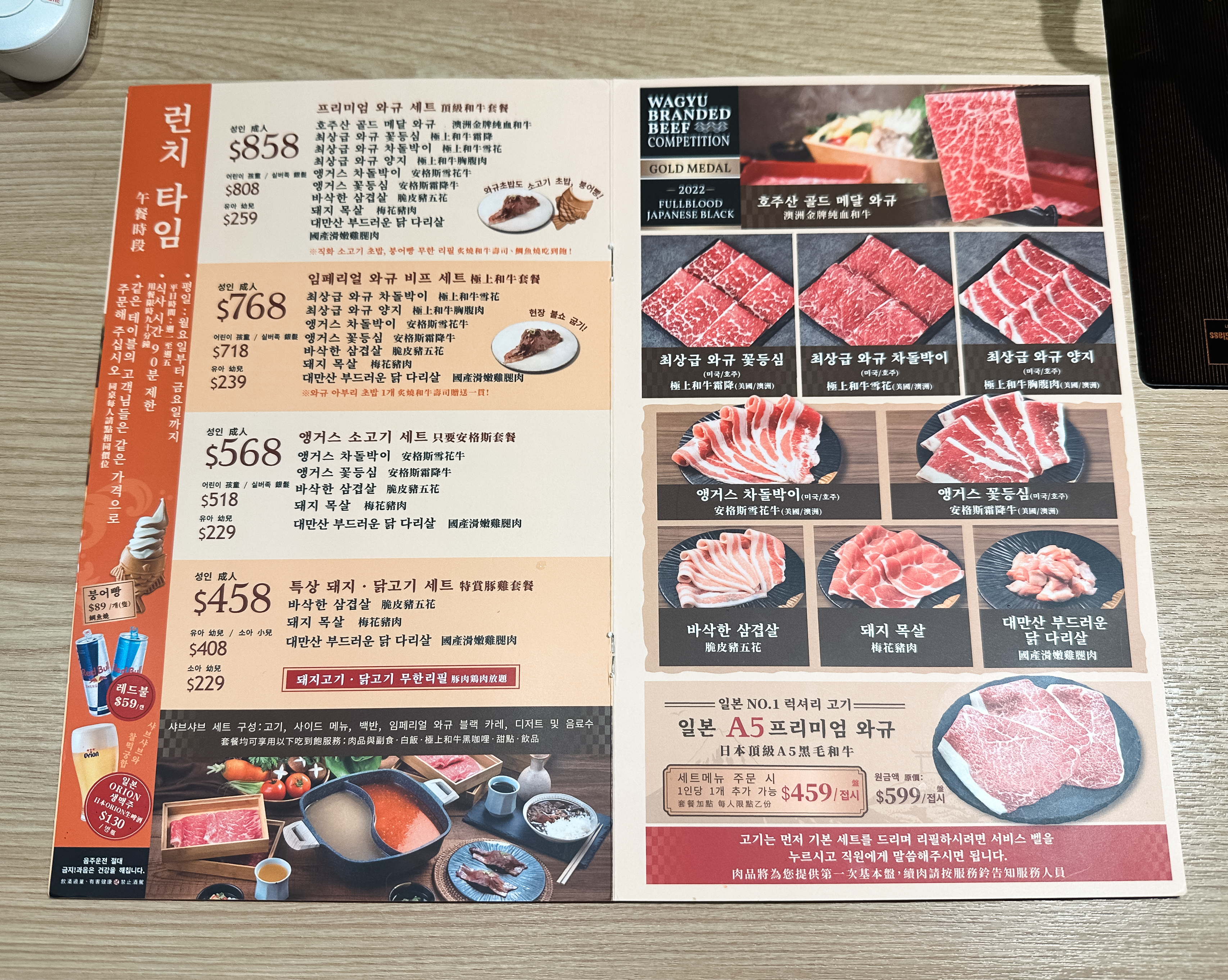 ※ 고기의 종류는 호주산골드메달와규, 최상급와규꽃등심, 최상급와규차돌박이, 최상급와규양지, 앵거스차돌박이, 앵거스꽃등심, 바삭한삼겹살, 돼지목살, 대만산부드러운닭다리살, 일본A5프리미엄와규가 있었습니다.