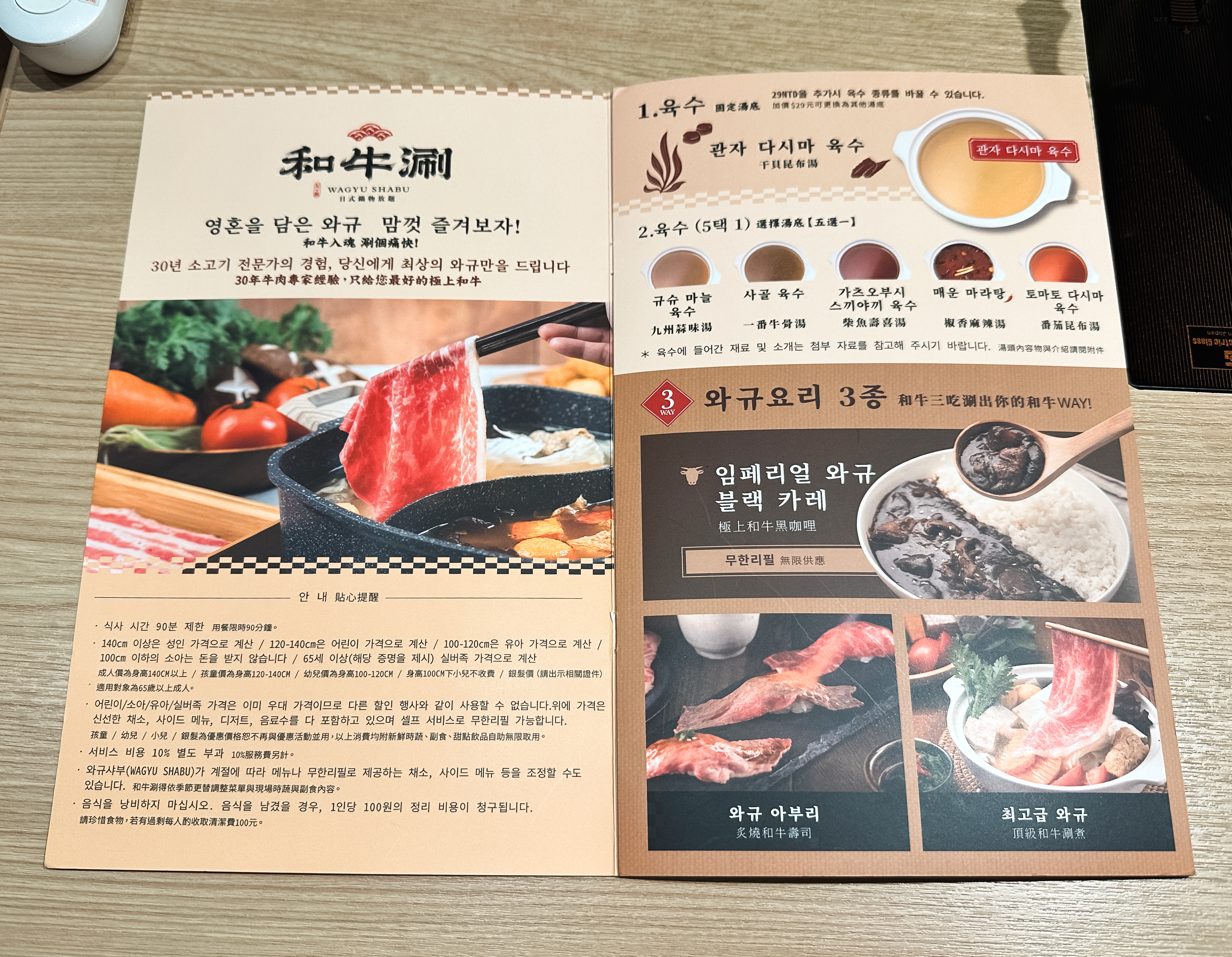 和牛涮 日式鍋物放題 台北林森北店 가게는 한국인도 많이 찾는 가게인지, 한국어 메뉴도 준비되어 있었습니다. 이곳은 런치와 디너가격이 조금씩 차이가 있었습니다. 육수의 종류는 관자다시마육수, 규슈마늘육수, 사골육수, 가츠오부시스끼야끼육수, 매운마라탕, 토마토다시마육수가 있었습니다.