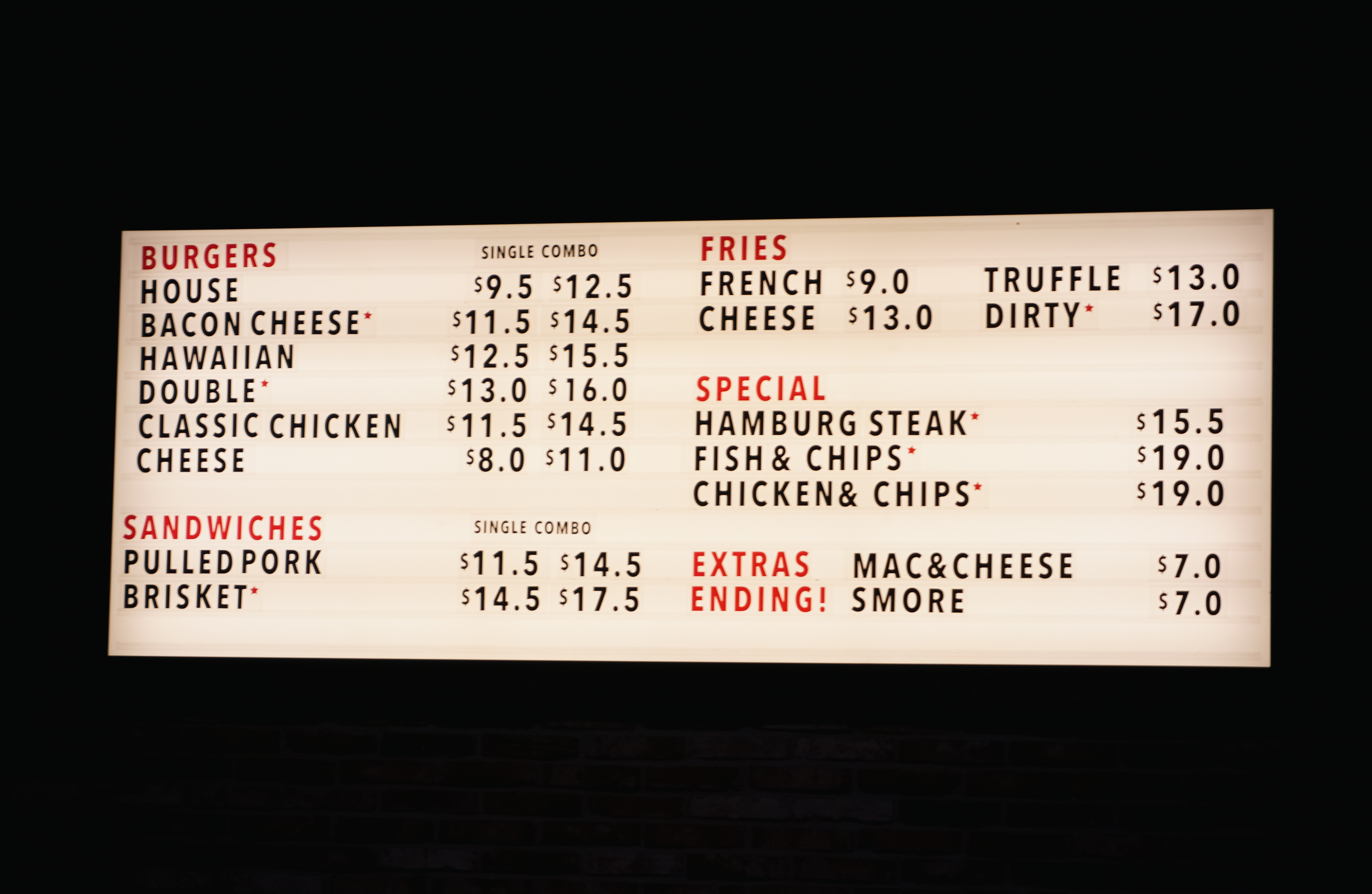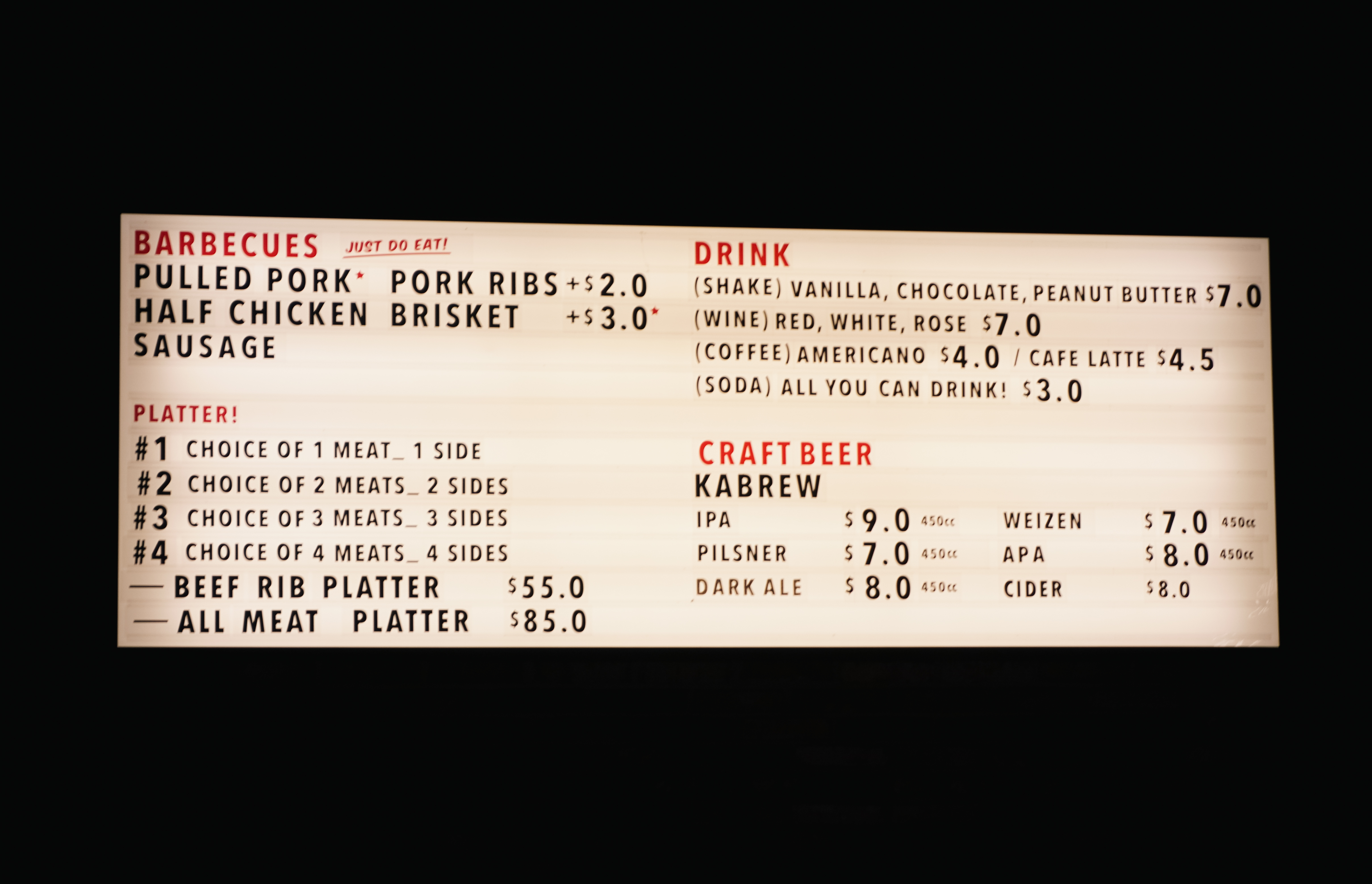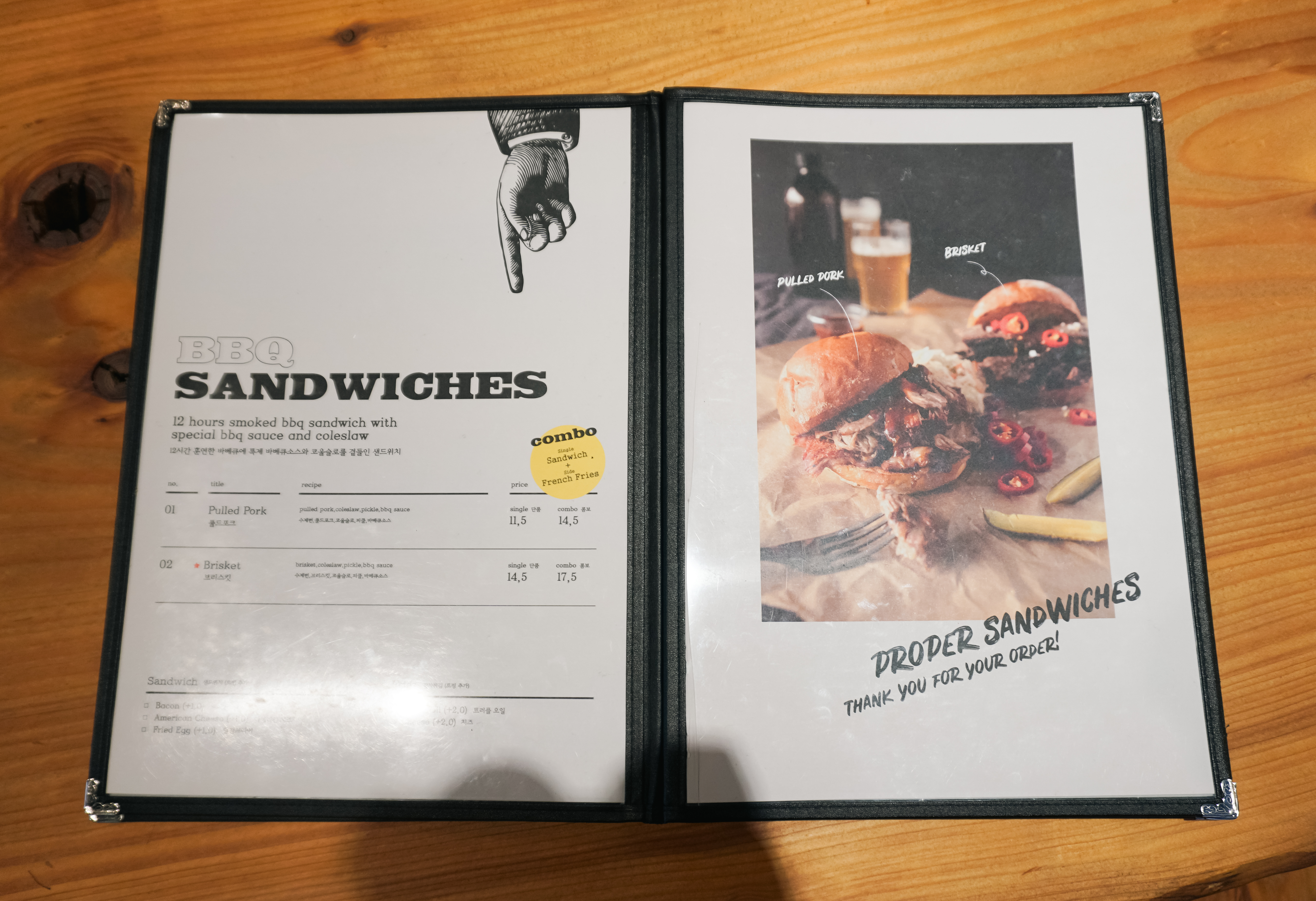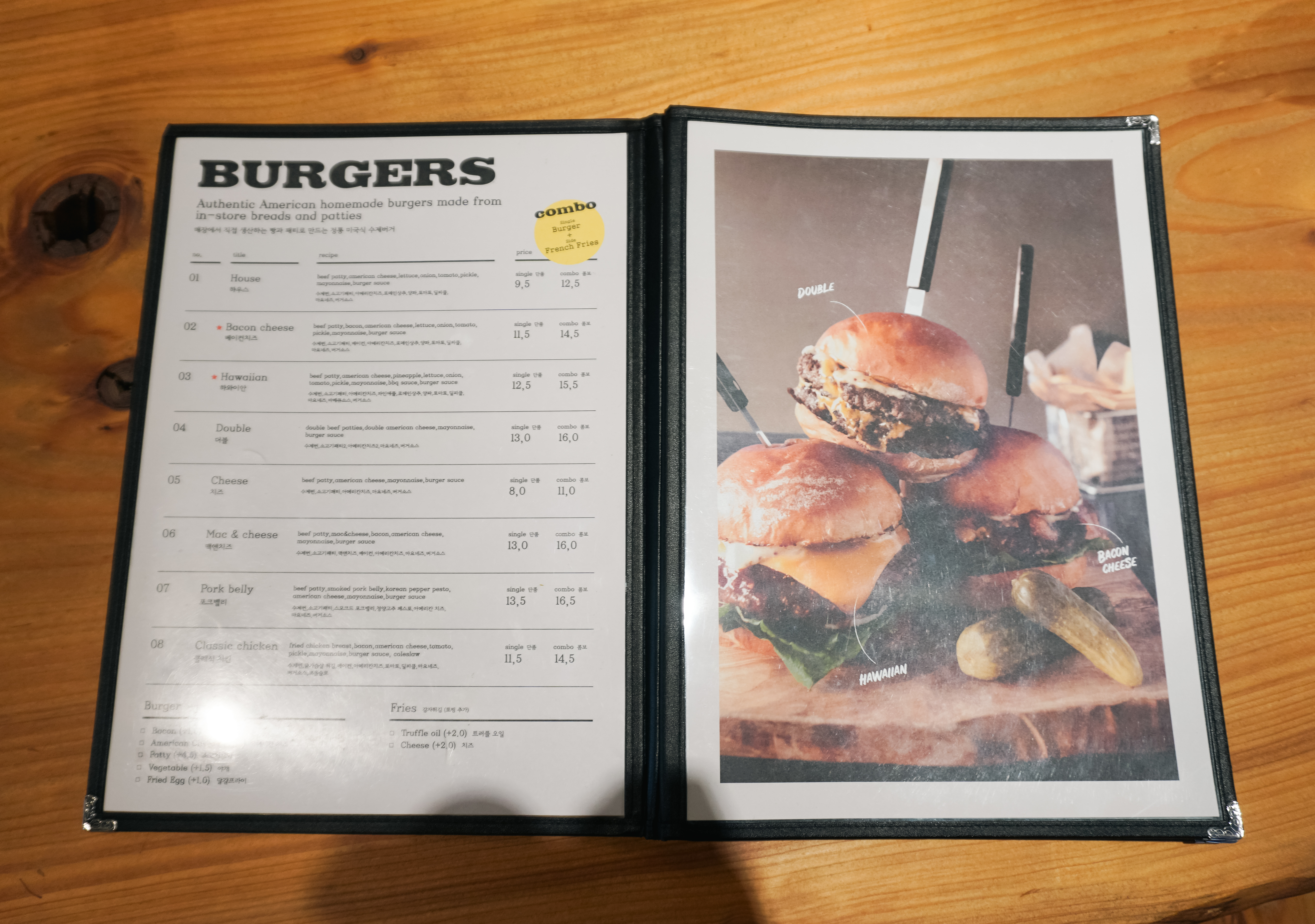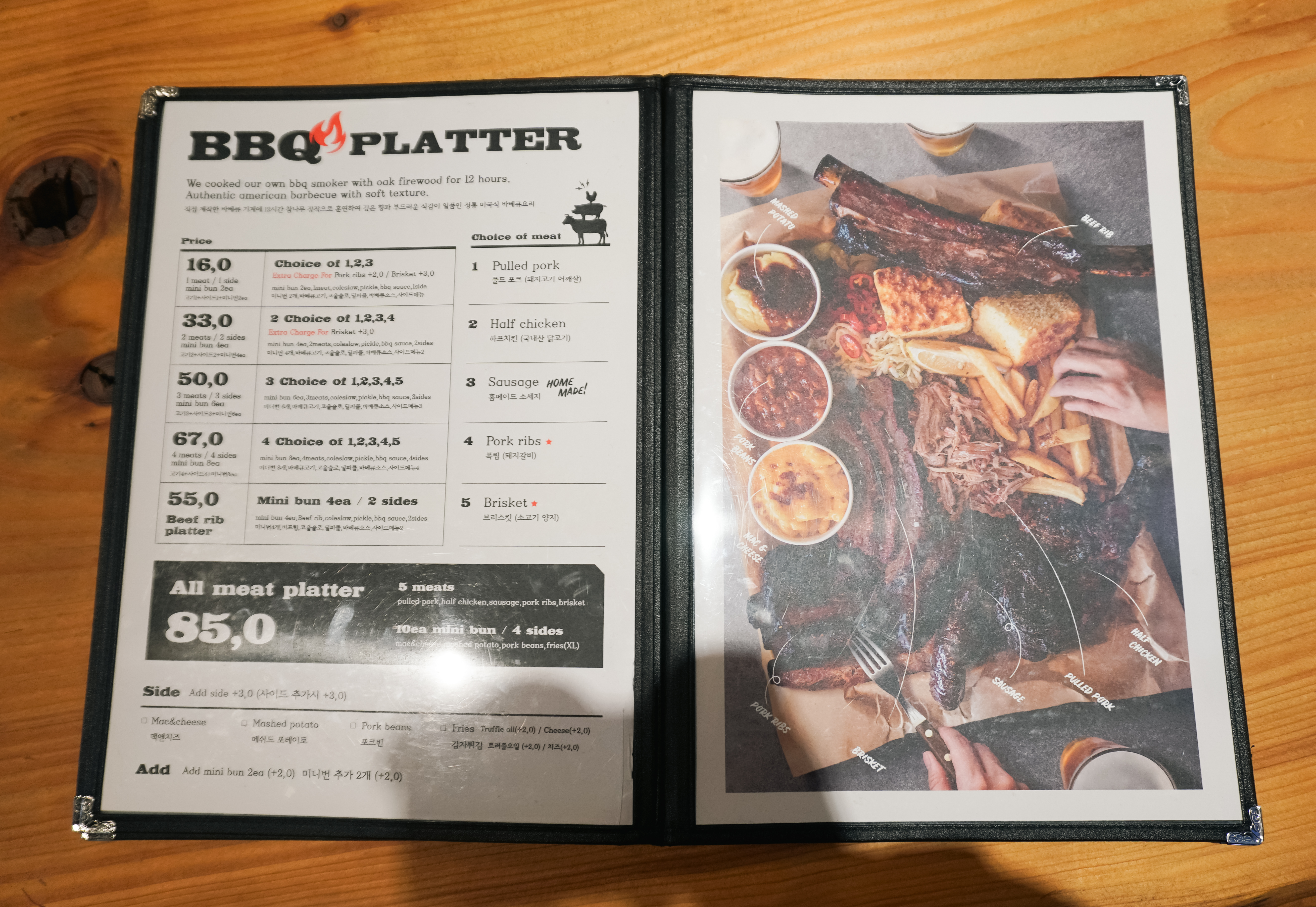메뉴는 크게 종류별로 버거, BBQ샌드위치, BBQ플래터, 스페셜, 프라이즈, 기타, 디저트, 음료, 맥주, 애플사이다 등이 있었습니다. 저는 수제버거와 바베큐플래터를 주문했습니다.