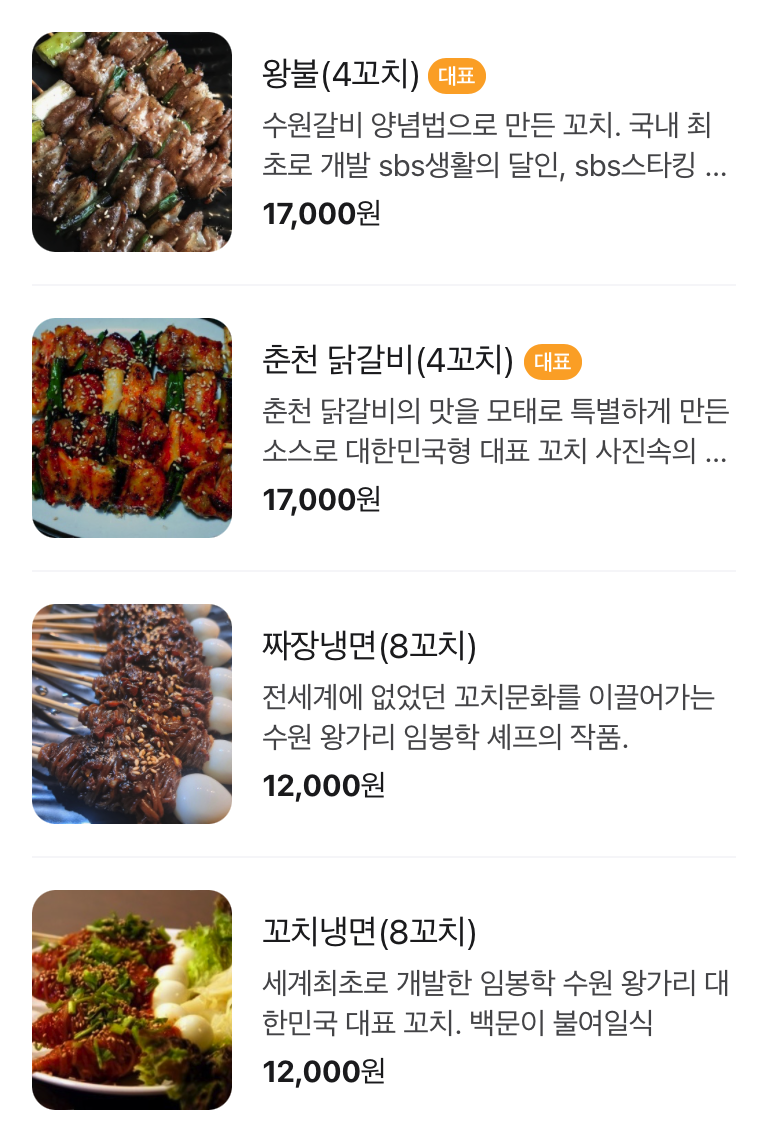 ※ 수원왕가리의 '짜장냉면꼬치'는 종이 메뉴판에는 없는데, 가게의 네이버 지도(플레이스)에 들어가면 만나볼 수 있습니다. 저희가 주문한 짜장냉면 꼬치는 8꼬치가 나오는 메뉴이며, 가격은 12,000원 이었습니다.